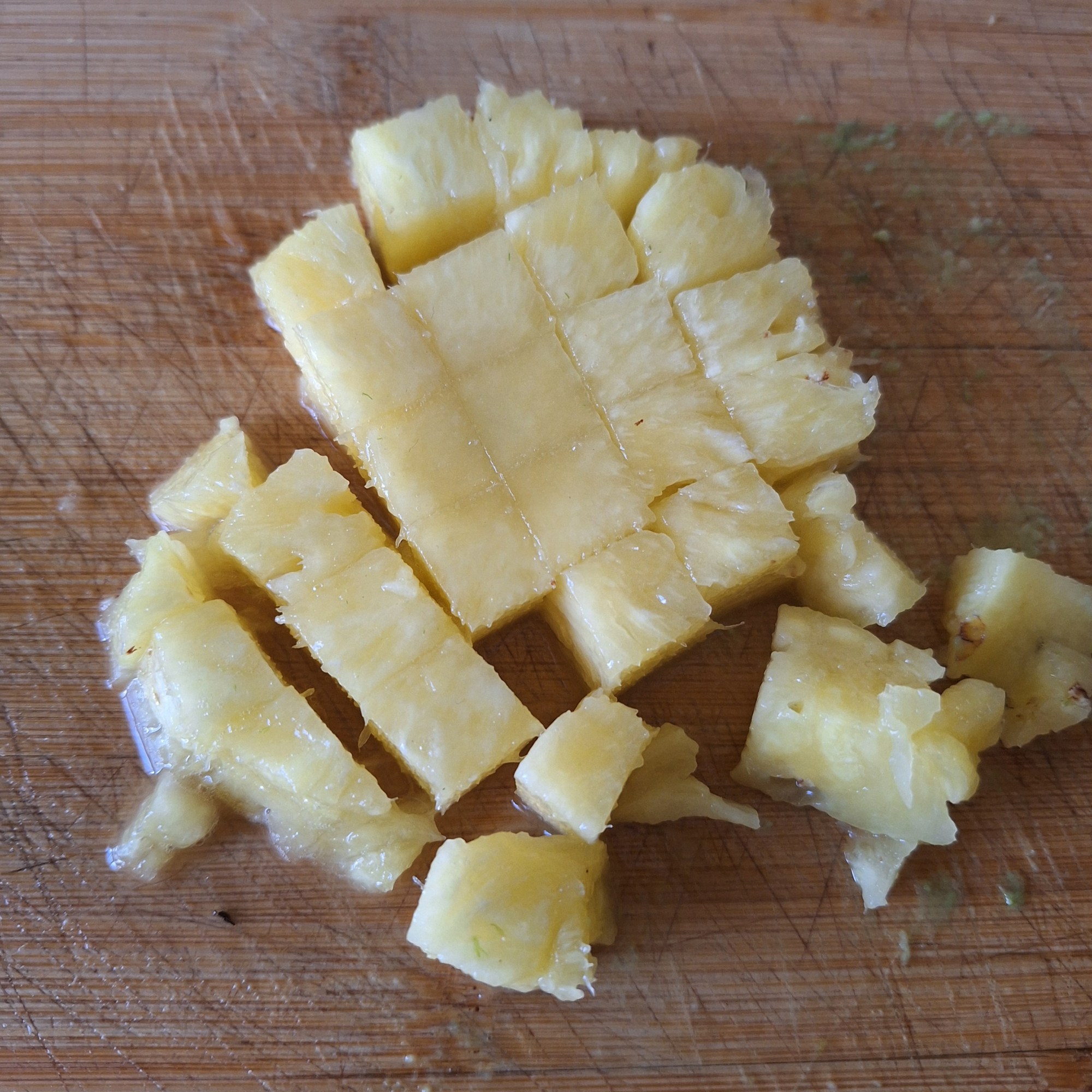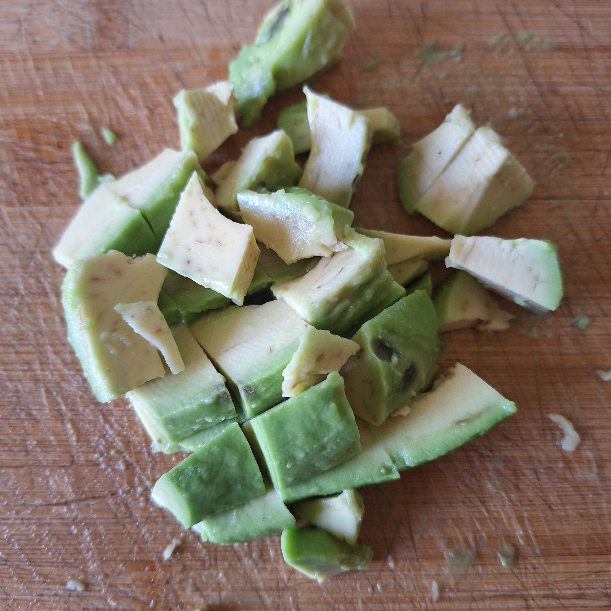 Pela la piña y el aguacate y corta en cubos. Coloca en un bowl con el aceite, la sal y aminos de coco. Mezcla bien.