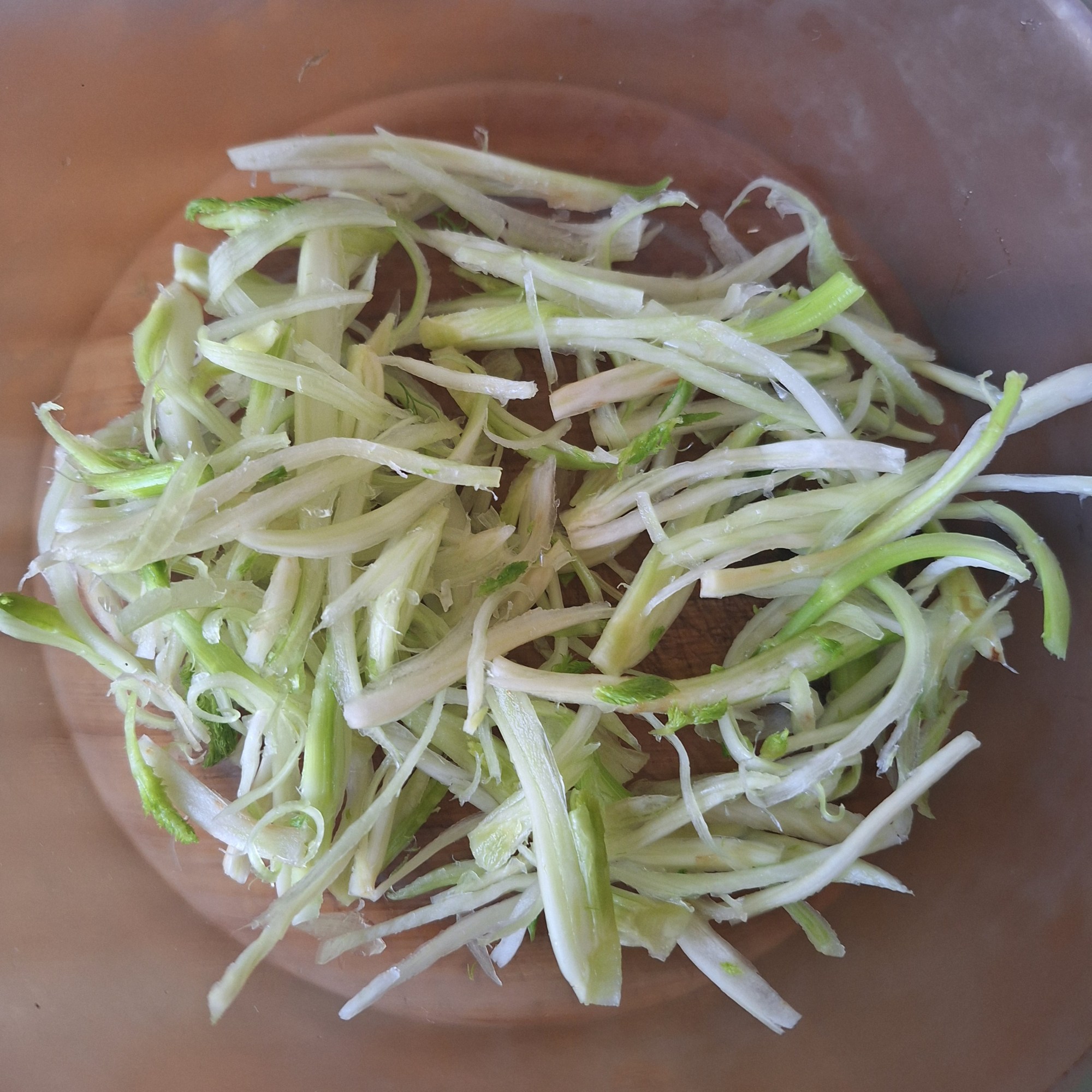 Corta el tallo del bulbo y retira las hojas externas. Corta a la mitad y haz tiras finas. Vierte en un recipiente con agua fría y deja reposar 20 minutos (esto hace que quede más crujiente y suavice su sabor).