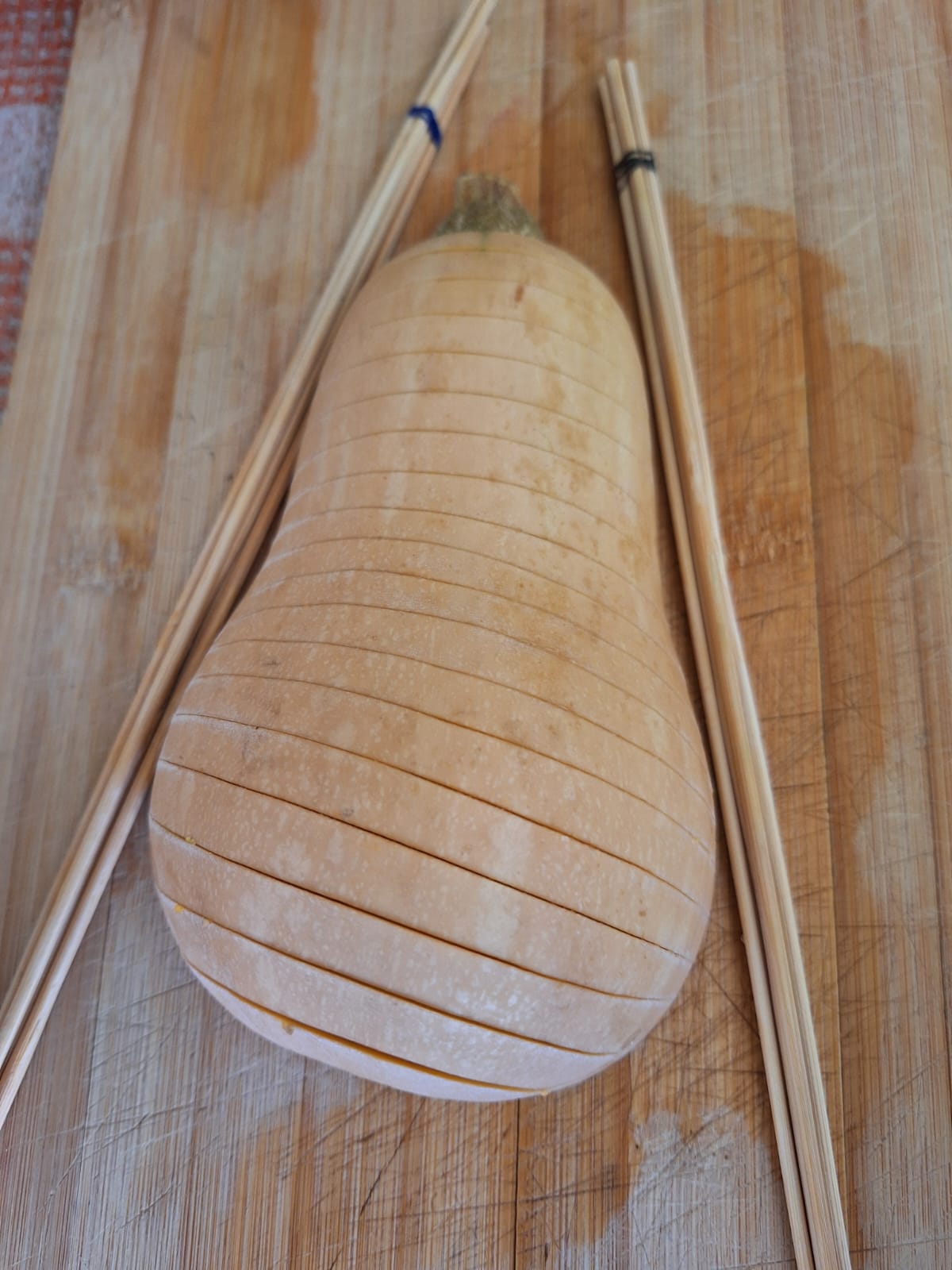 Corta la calabaza a la mitad y retira las semillas. Coloca boca abajo y a los lados algo que pueda hacer tope (yo he utilizado un manojo de 6 pinchos morunos). Haz cortes en horizontal hasta la altura de los pinchos, dejando un grosor pequeño entre ellos.