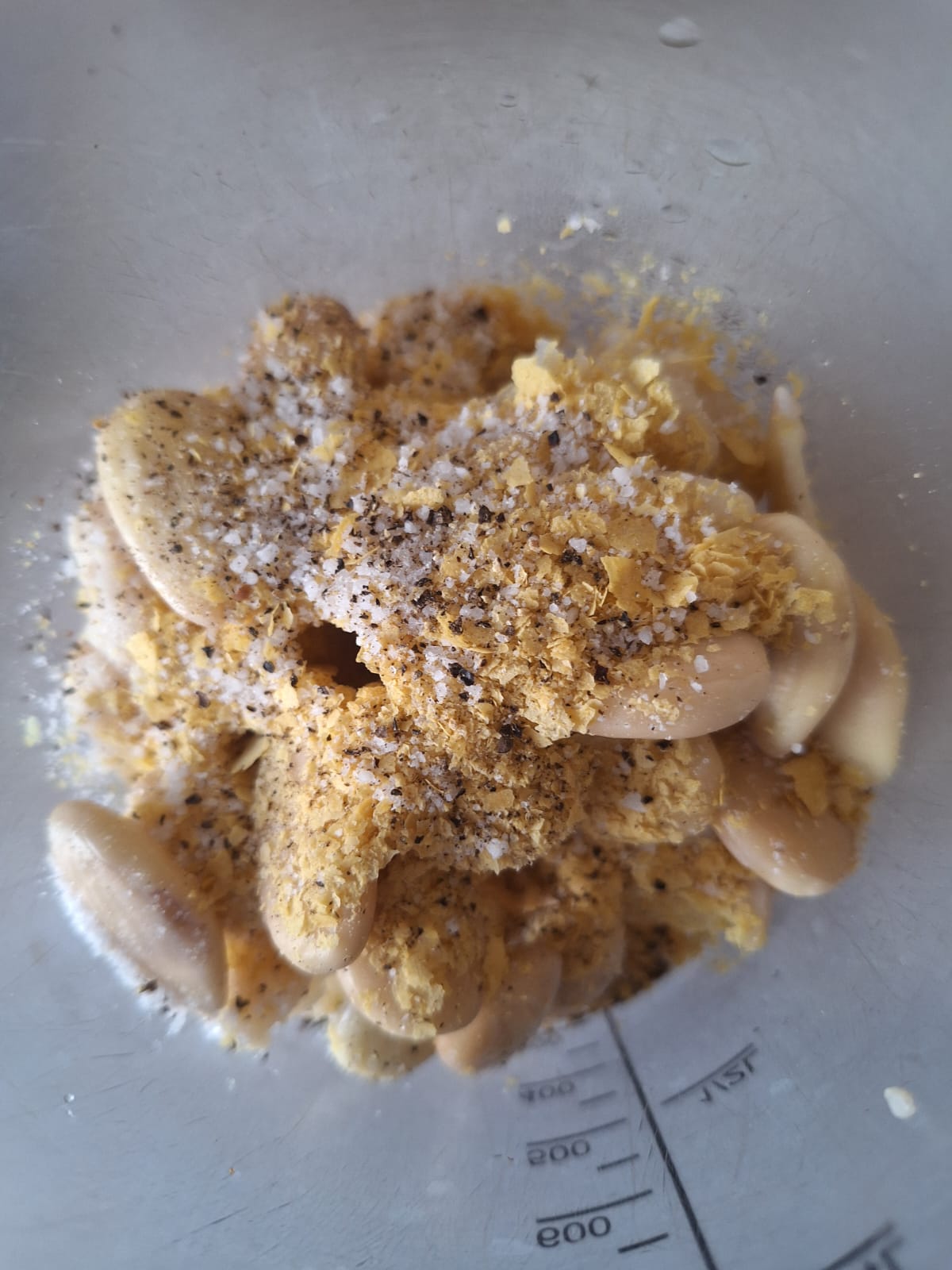 Limpia la coliflor, corta en ramilletes y cuece en abundante agua con sal hasta que esté tierna. Escurre y reserva. Hierve las almendras durante 15 minutos, retira la piel y vierte en un vaso de batidora junto con la coliflor. Agrega la levadura nutricional, sal y pimienta y tritura, añadiendo el agua de cocción poco a poco, hasta obtener la textura deseada (no muy densa).