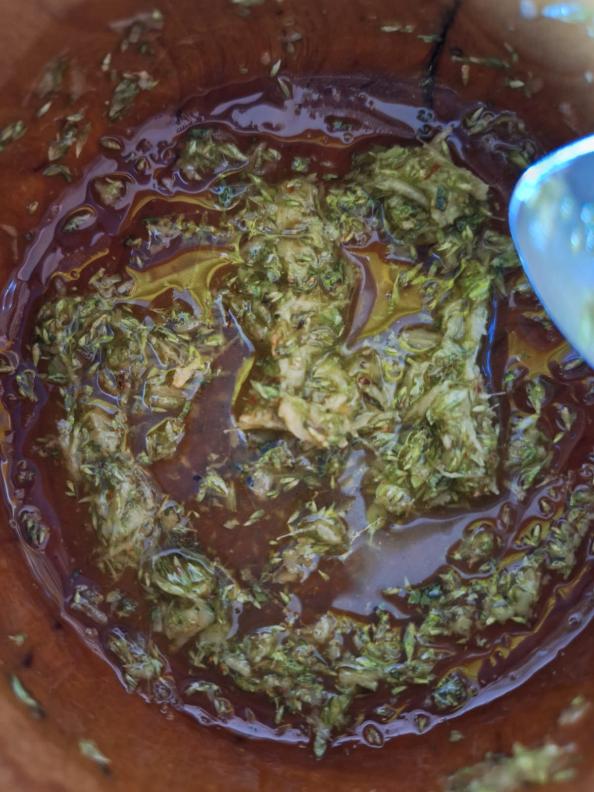 Prepara una mezcla con el aceite, el jengibre y el orégano. Con una brocha pincela entre los cortes de la calabaza (con cuidado de que no se rompa).