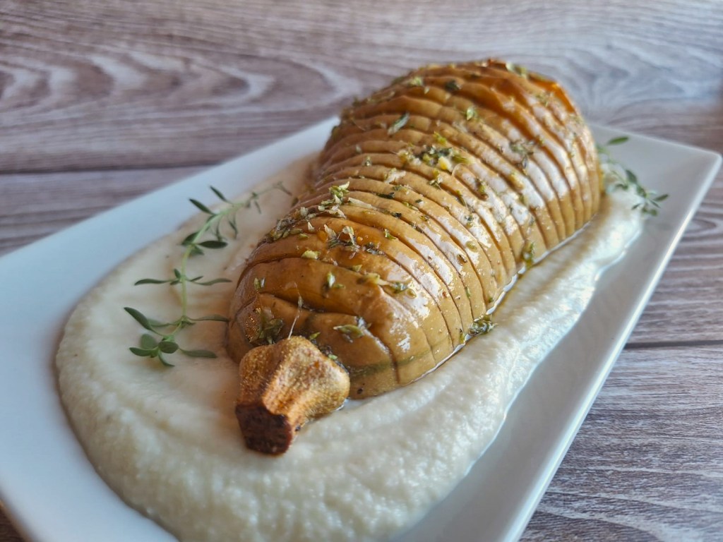 CALABAZA HASSELBACK CON CREMA DE COLIFLOR Y ALMENDRAS