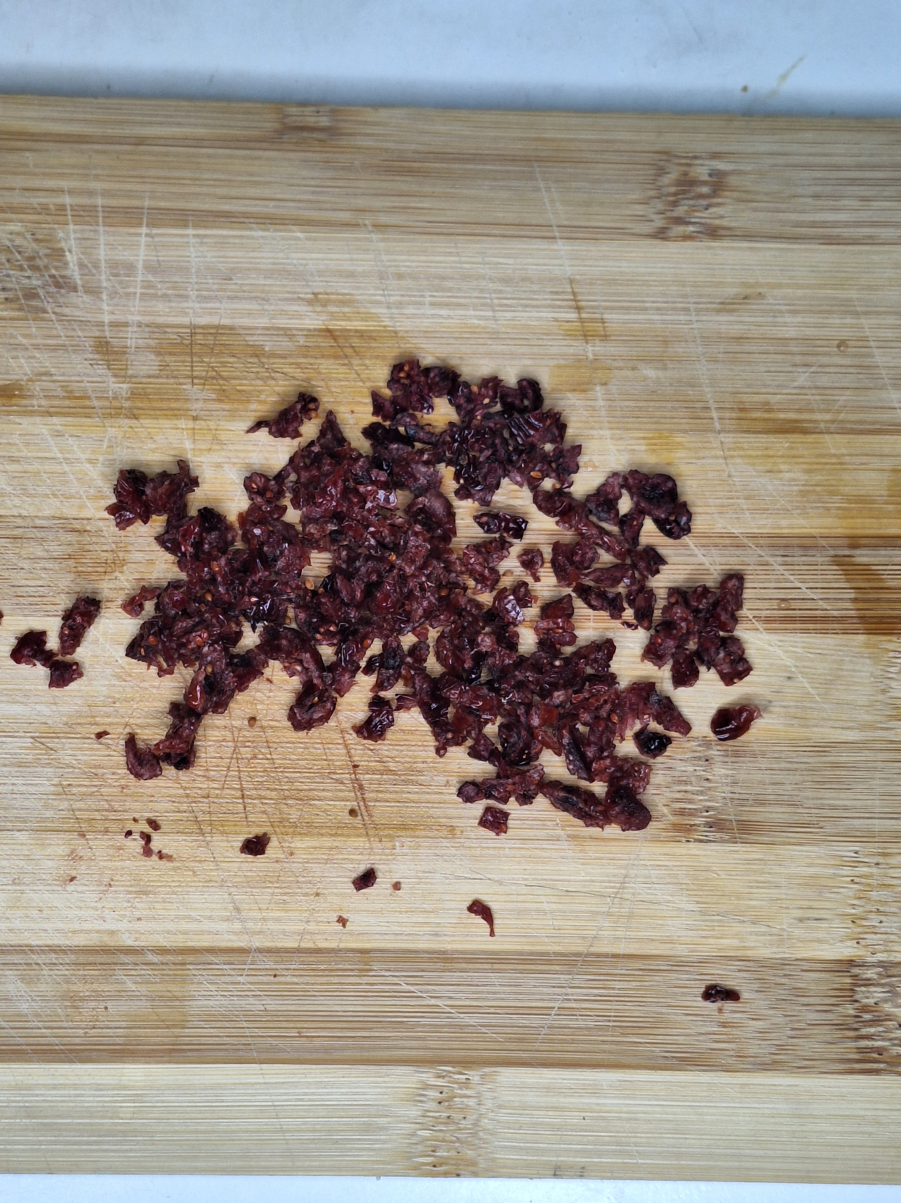 Hidrata los arándanos en agua templada durante unos 10 minutos. Escurre, seca con papel absorbente y corta finamente con un cuchillo (puedes cortar también en trozos grandes). Pela y tritura los pistachos con un mortero.