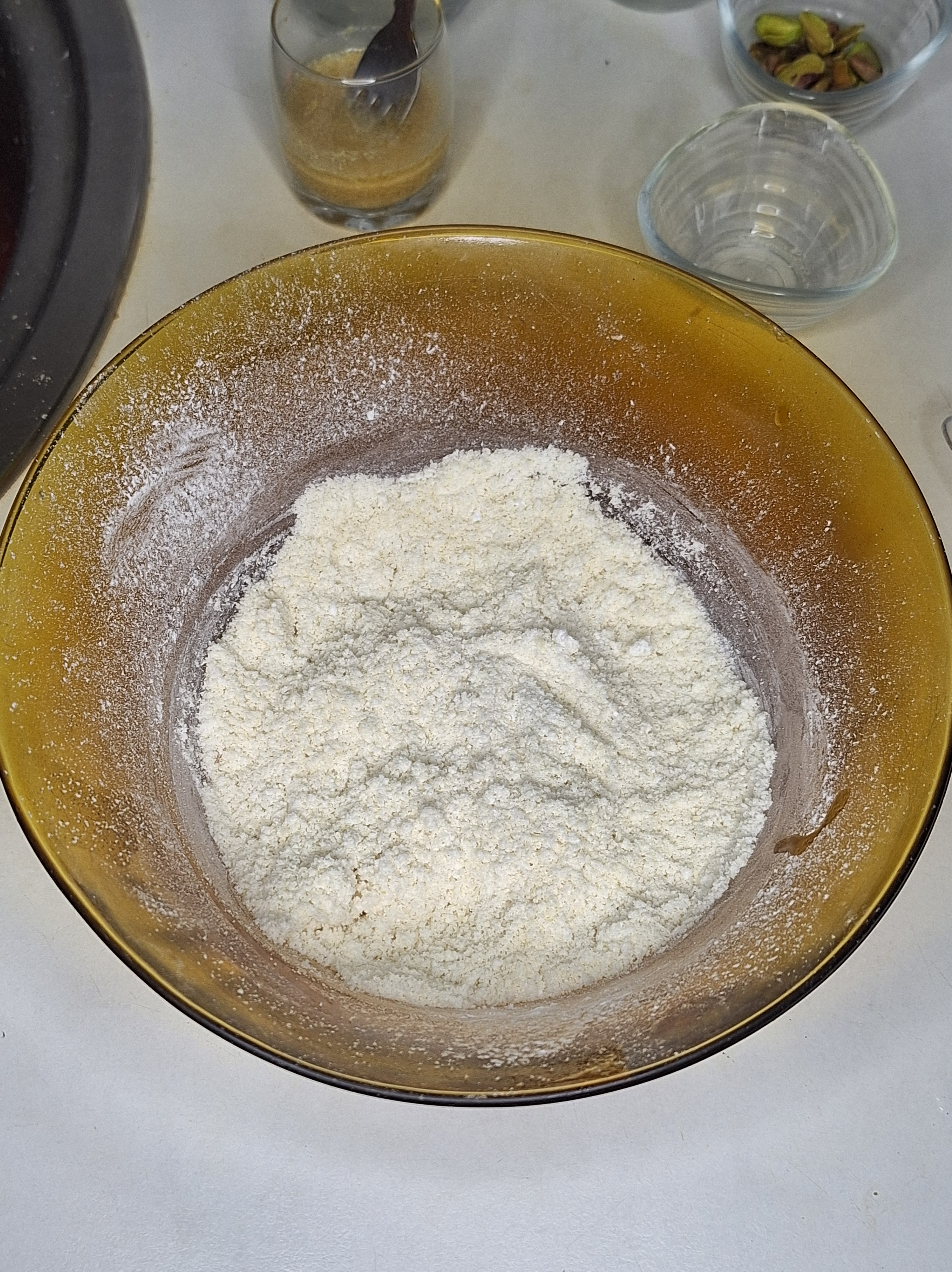 Tamiza las harinas y el almidón. Agrega el azúcar (yo suelo triturarlo con el molinillo de café), la sal y el impulsor y mezcla todo muy bien.