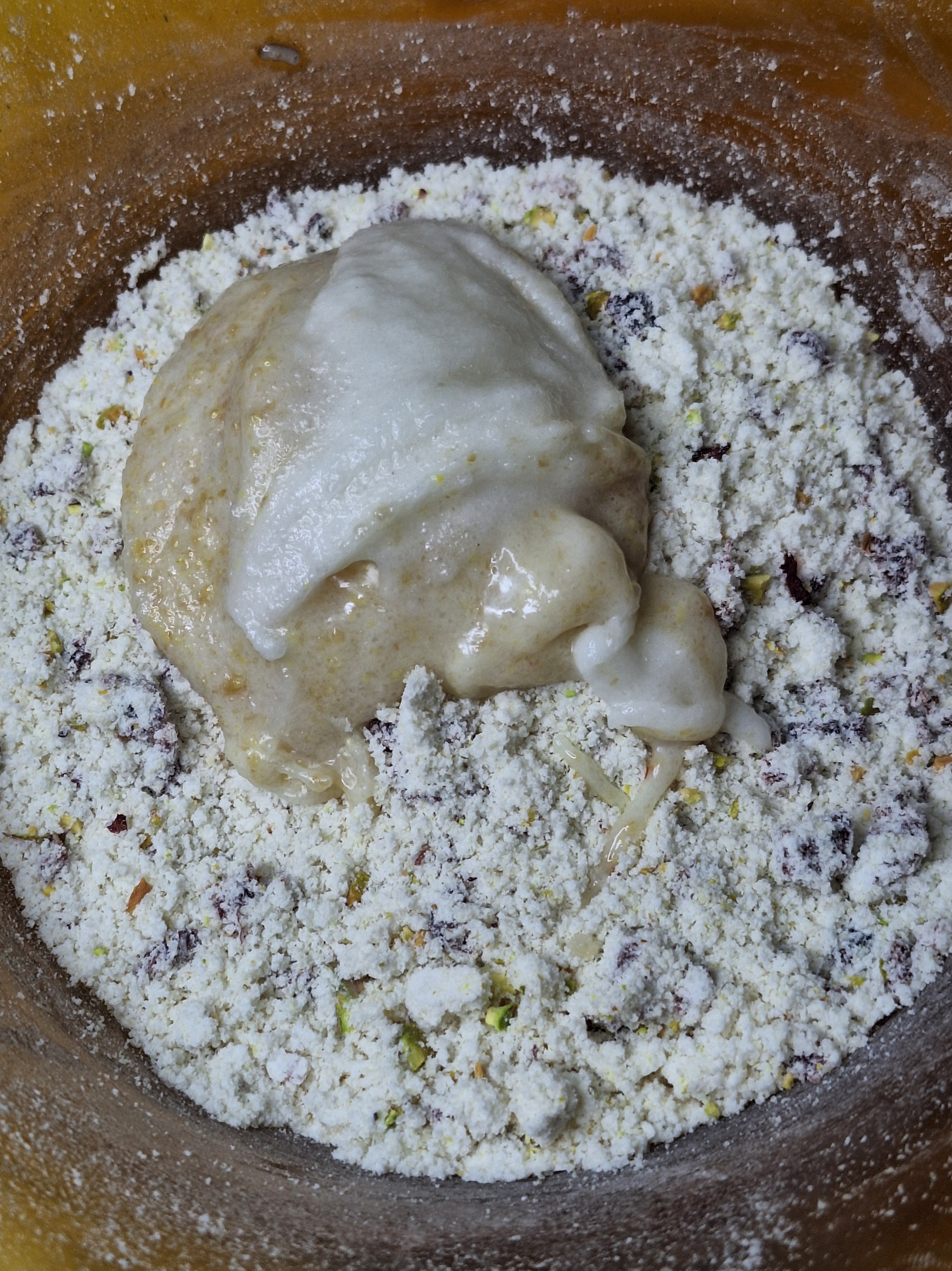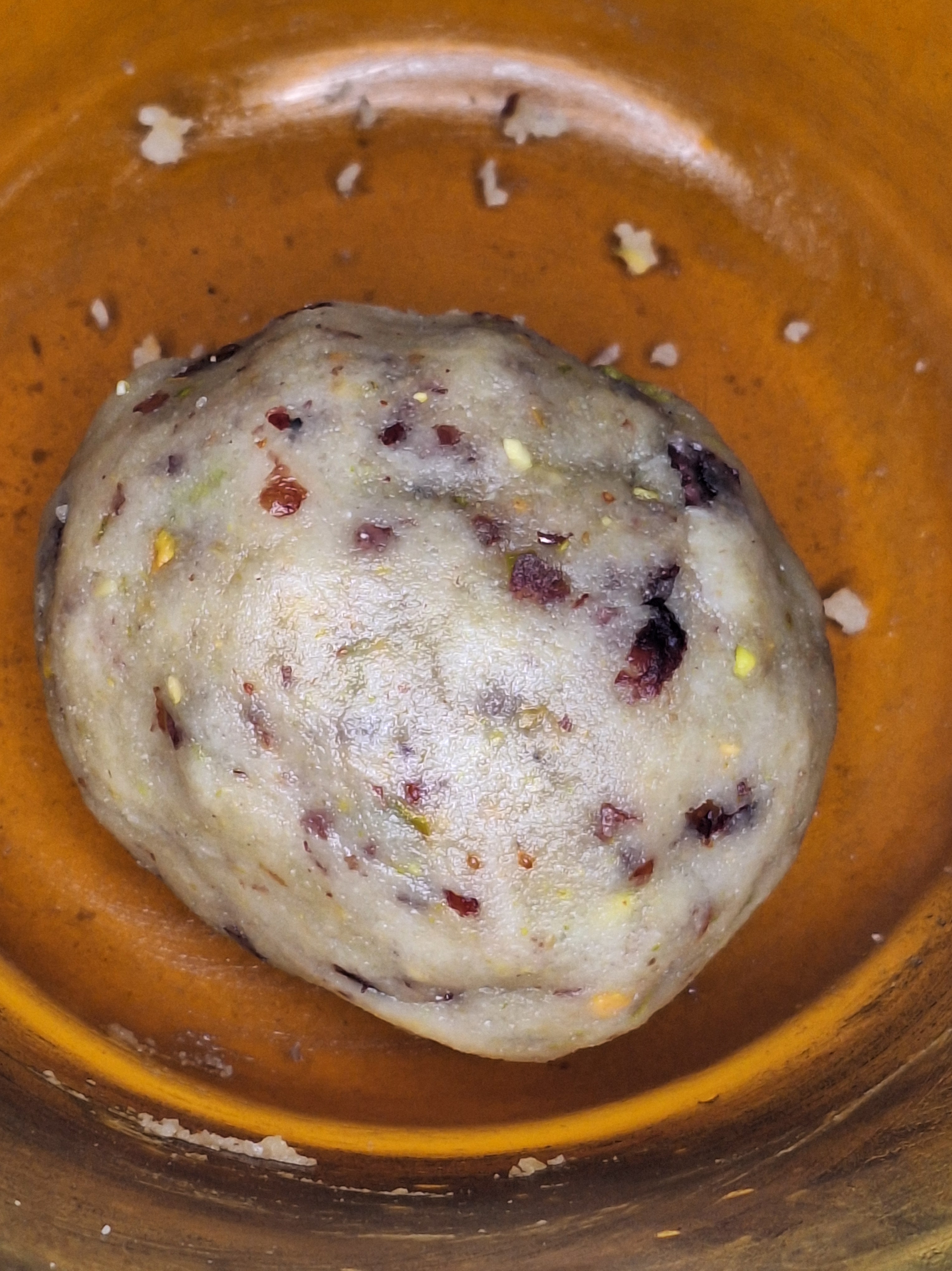 Incorpora el lino, la esencia de vainilla, los arándanos y pistachos y la mantequilla a temperatura ambiente. Mezcla con las manos hasta que no queden partes secas. Haz una bolita y lleva al frigo unos 30 minutos.