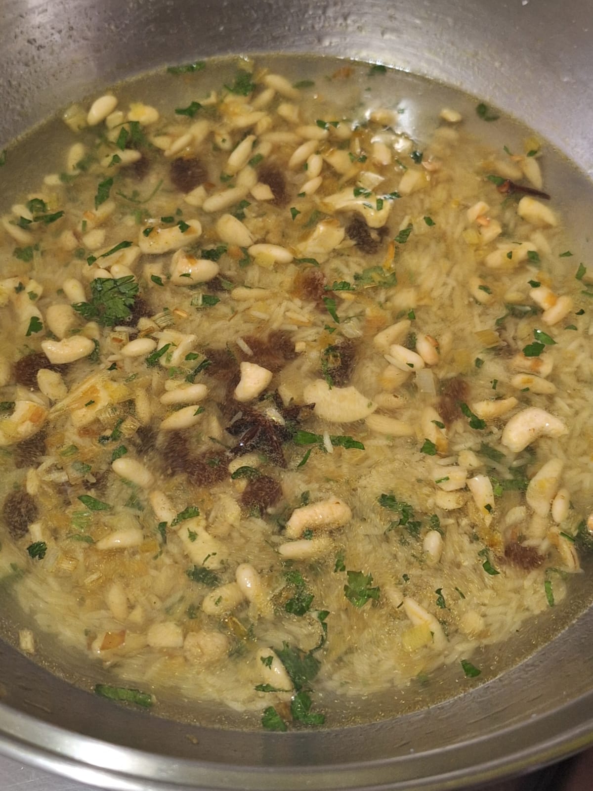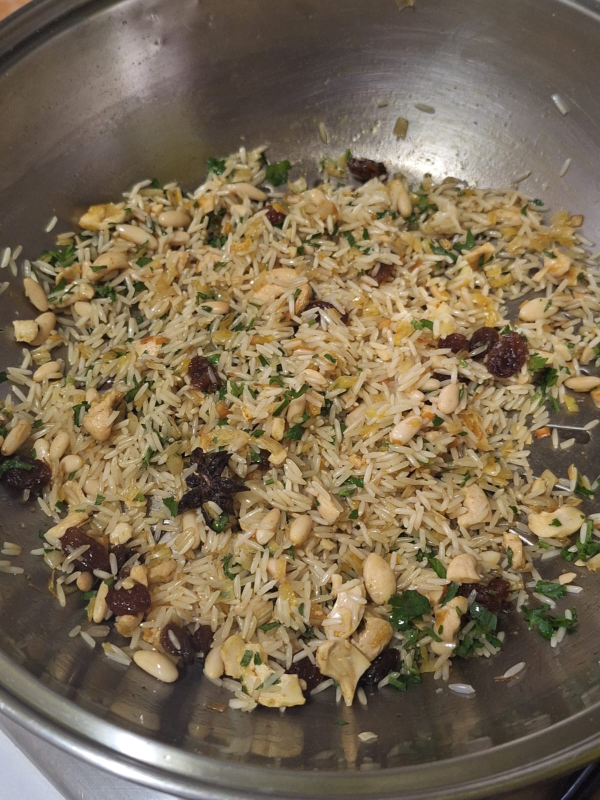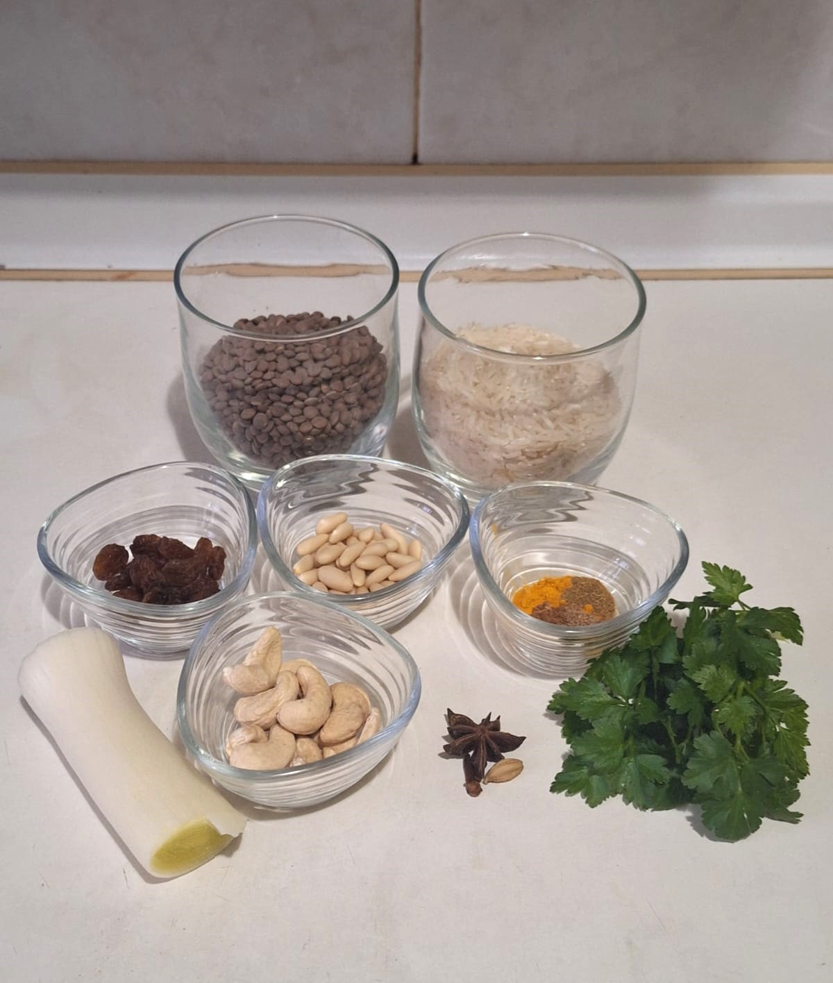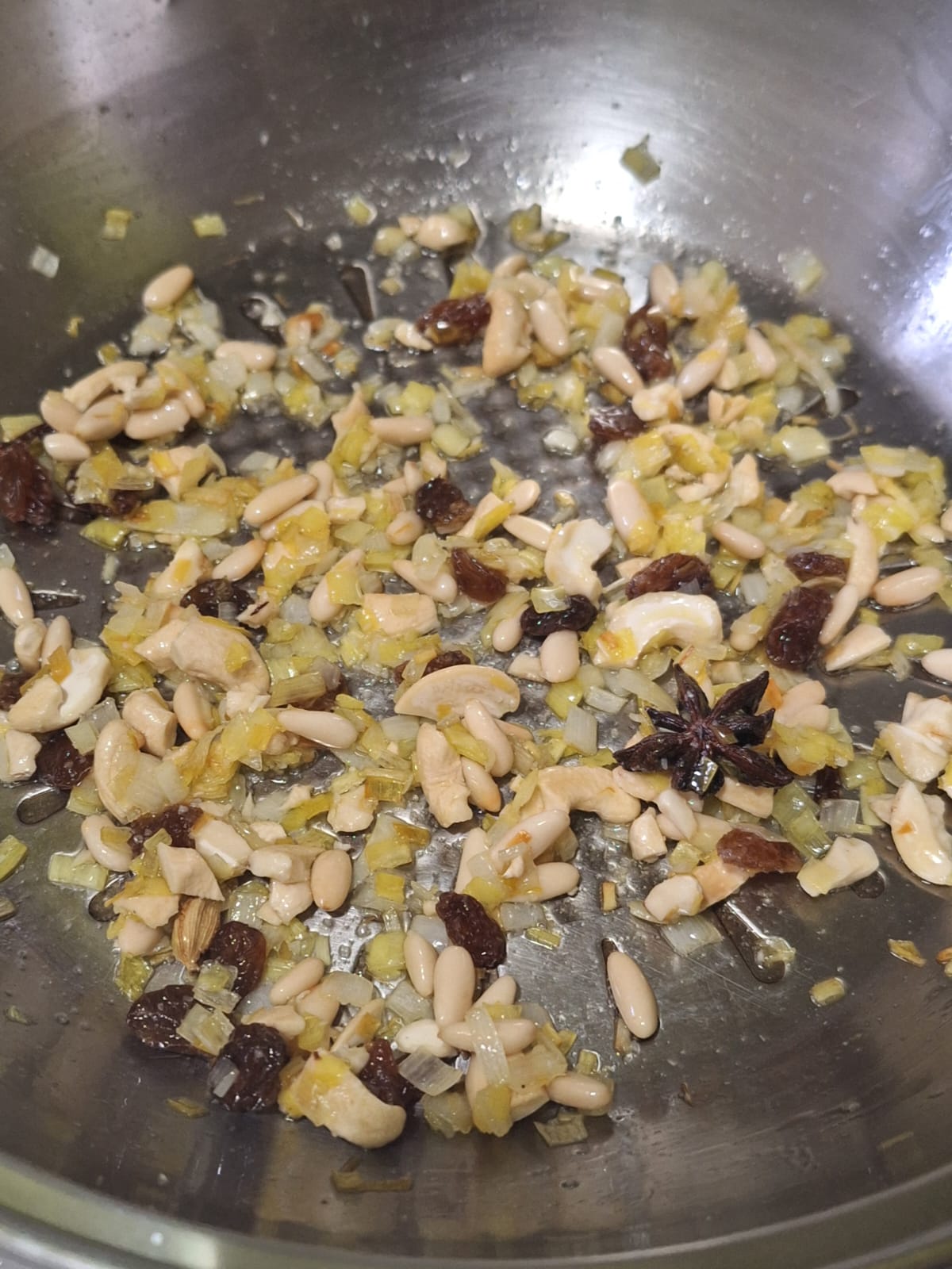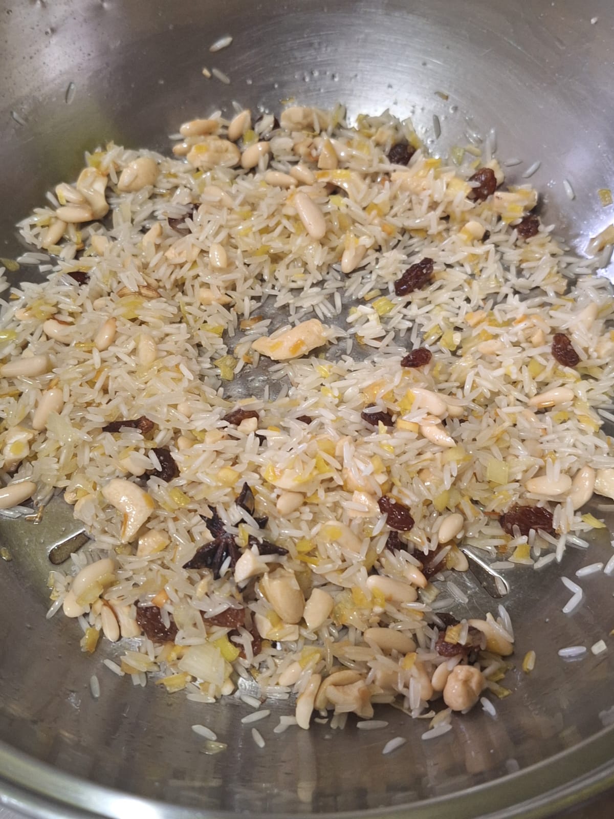 Cuando esté transparente incorpora los piñones y los anacardos picados y cocina un minuto. Agrega las pasas y el arroz y deja que cambie de color. Añade el caldo y las lentejas y cuando empiece a hervir baja el fuego y cubre con una tapadera. Cocina unos 7-8 minutos.