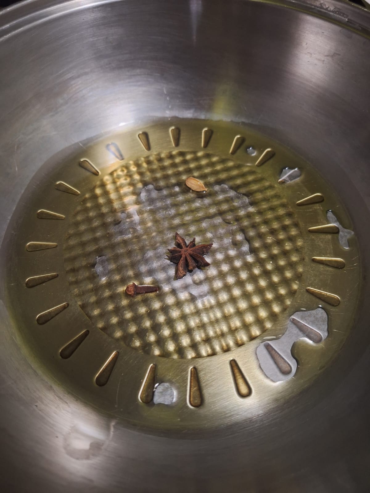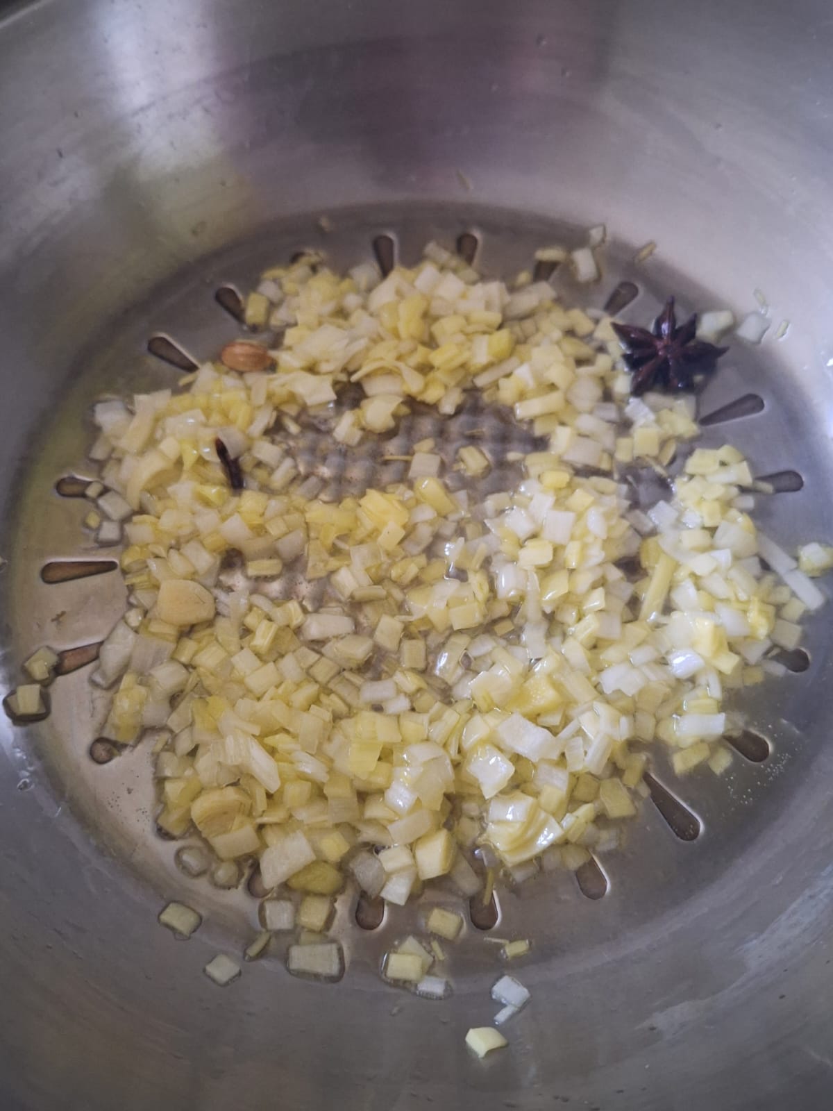 Calienta un poco de aceite y añade el anís, el cardamomo y el clavo. Deja que se aromatice el aceite un par de minutos. Añade el puerro y pocha a fuego bajo.