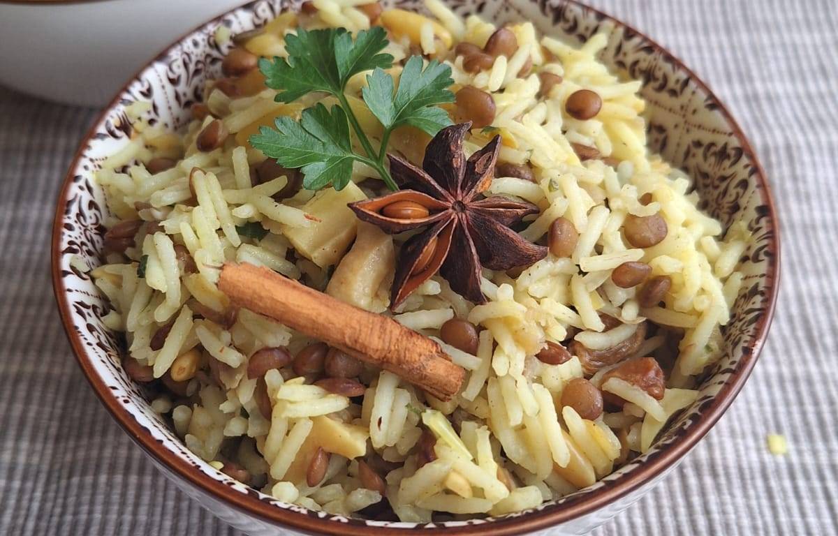 Este es el resultado: un arroz especiado, con un toque árabe muy rico gracias a las especias y a los frutos secos. Para completar el plato añadí un puñadito de lentejas. Ha quedado bastante rico y es una receta muy sencilla y rápida de hacer. Así que tomad nota y animaos a probarla.