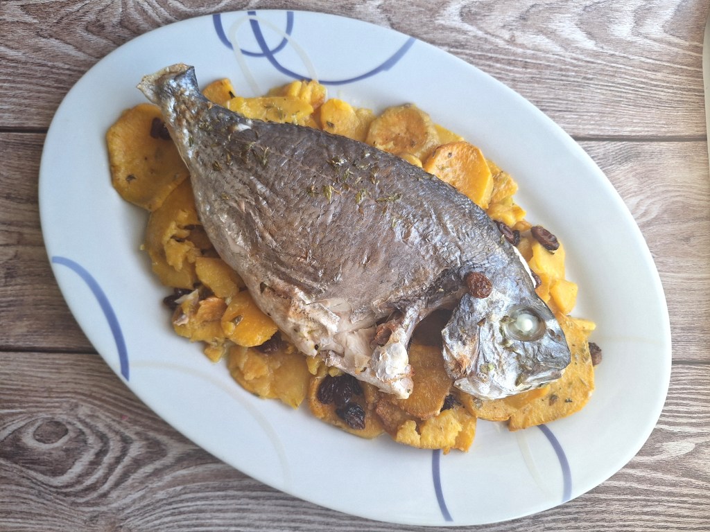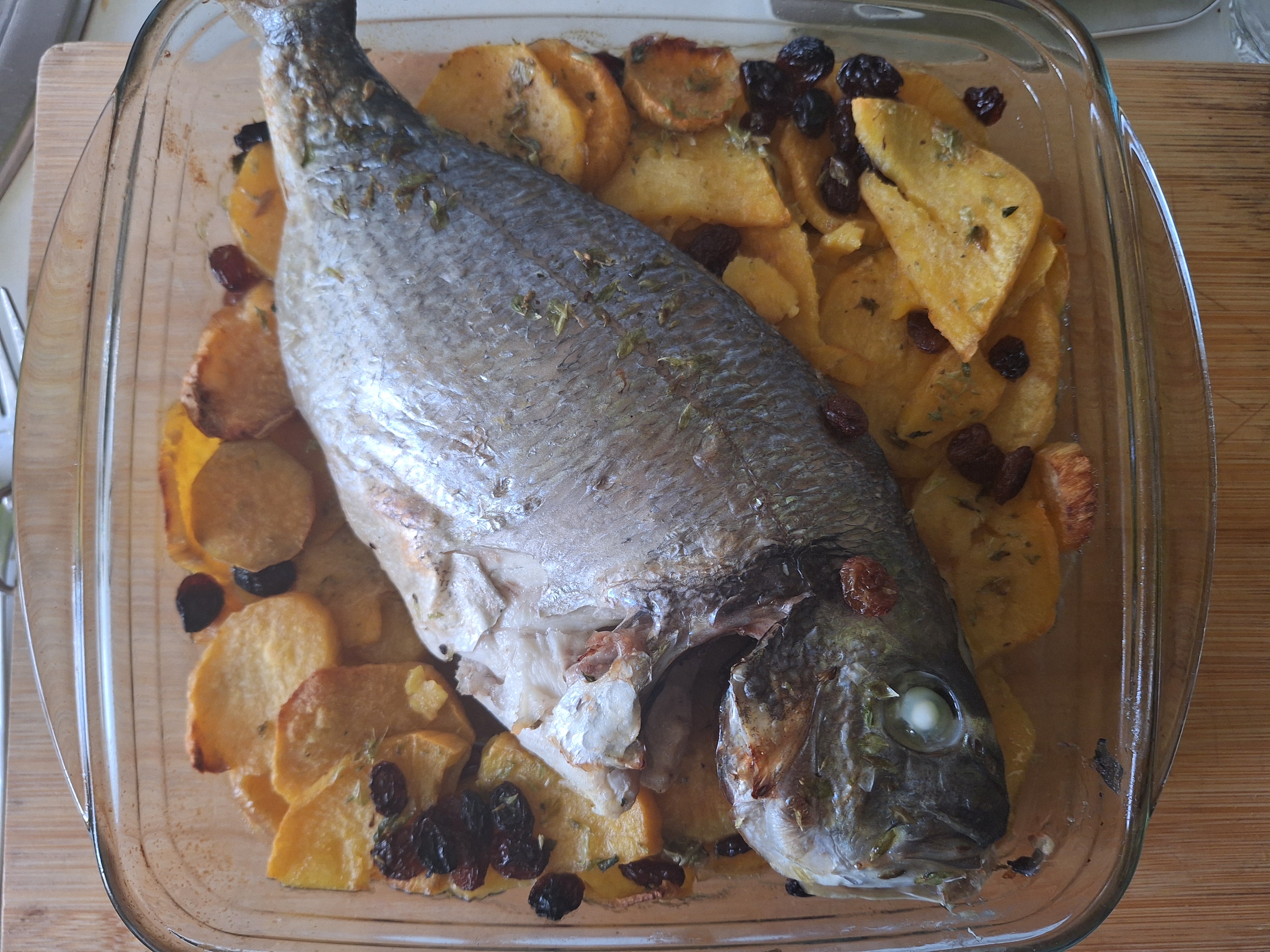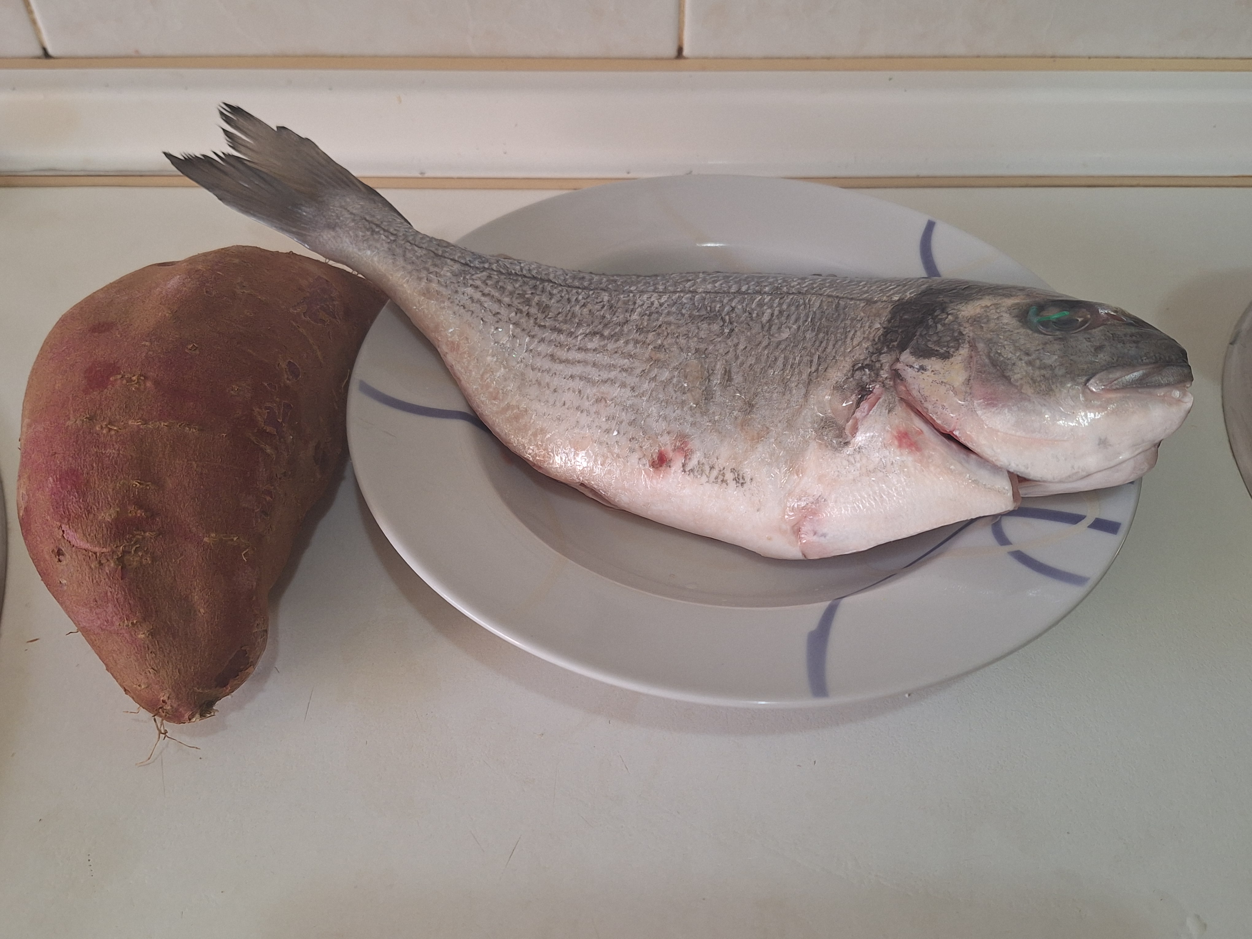 Me encanta el pescado, mucho más que la carne, aunque tampoco lo como tanto como debería. Hace años decidí reducir el consumo de producto animal, pero de vez en cuando me permito comer algo, sobre todo si salgo a comer fuera, que aquí en mi zona las opciones vegetarianas y veganas son inexistentes. A veces le pido a la mamma que me traiga pescado del mercado, generalmente lubina, pero esta vez le di libre albedrío y me trajo una dorada. Y se me ocurrió esta receta.