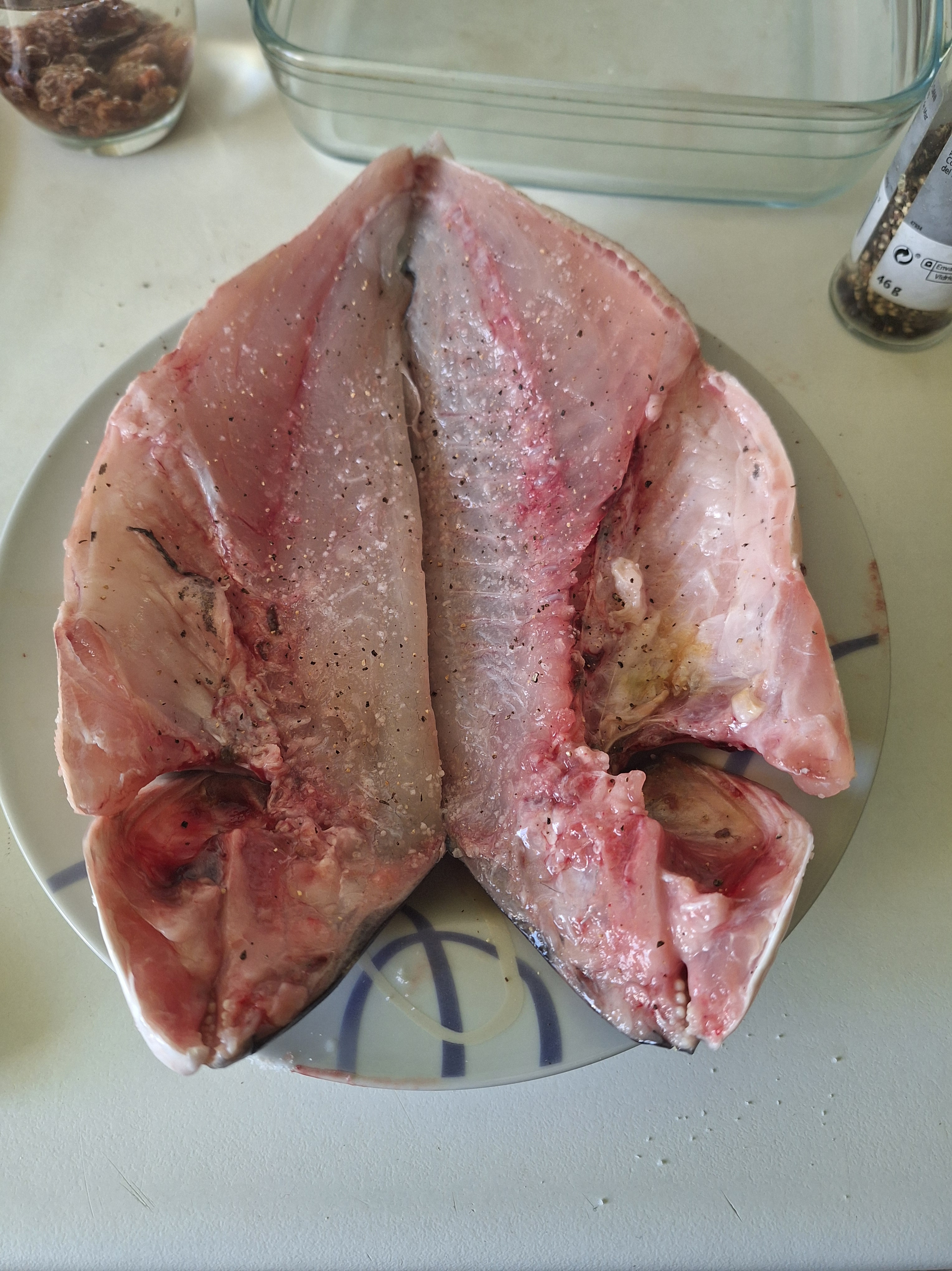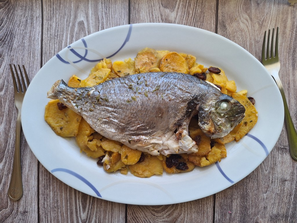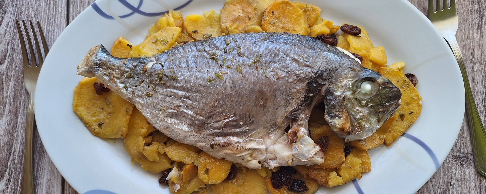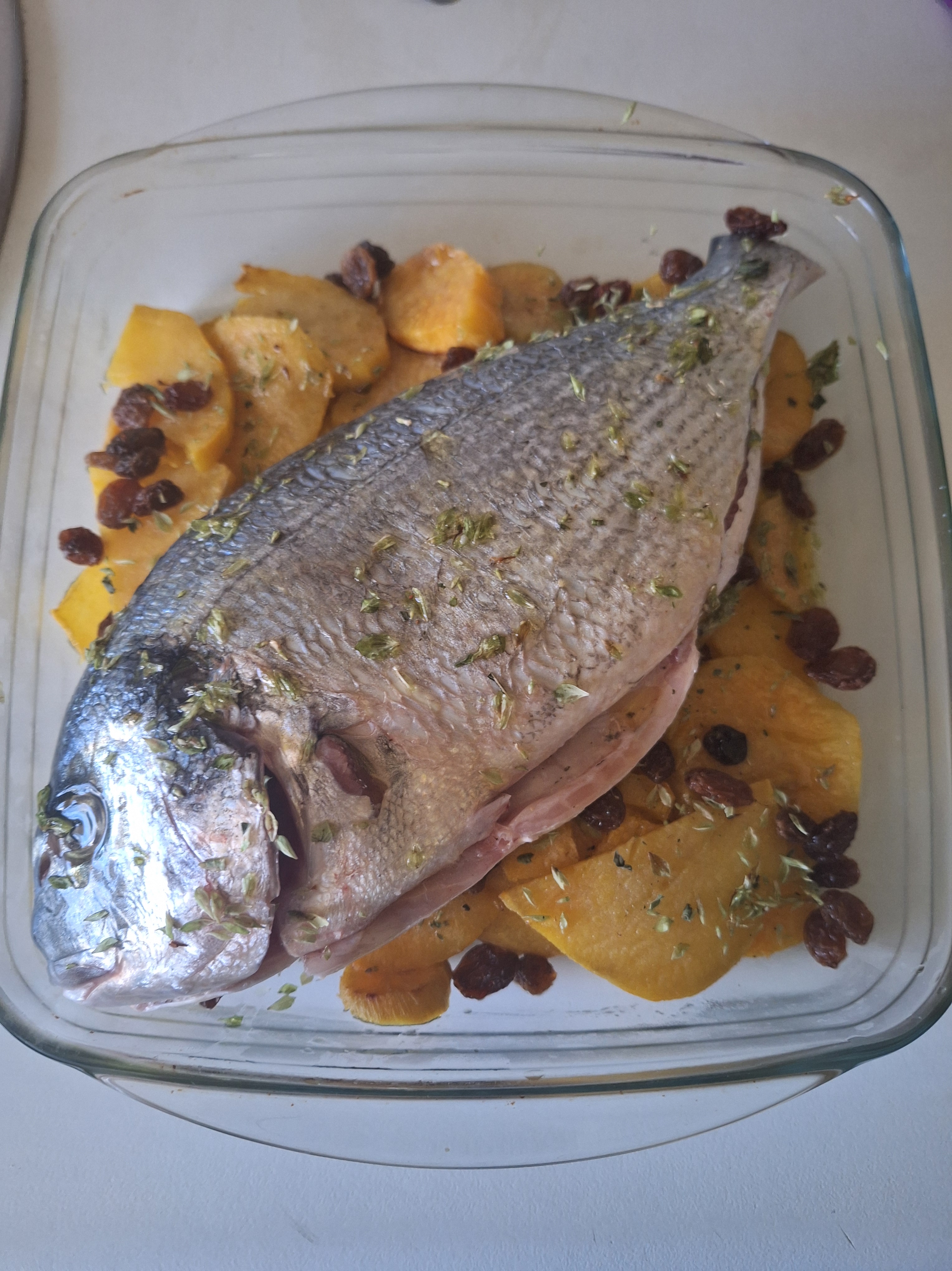 Me encanta el pescado, mucho más que la carne, aunque tampoco lo como tanto como debería. Hace años decidí reducir el consumo de producto animal, pero de vez en cuando me permito comer algo, sobre todo si salgo a comer fuera, que aquí en mi zona las opciones vegetarianas y veganas son inexistentes. A veces le pido a la mamma que me traiga pescado del mercado, generalmente lubina, pero esta vez le di libre albedrío y me trajo una dorada. Y se me ocurrió esta receta.