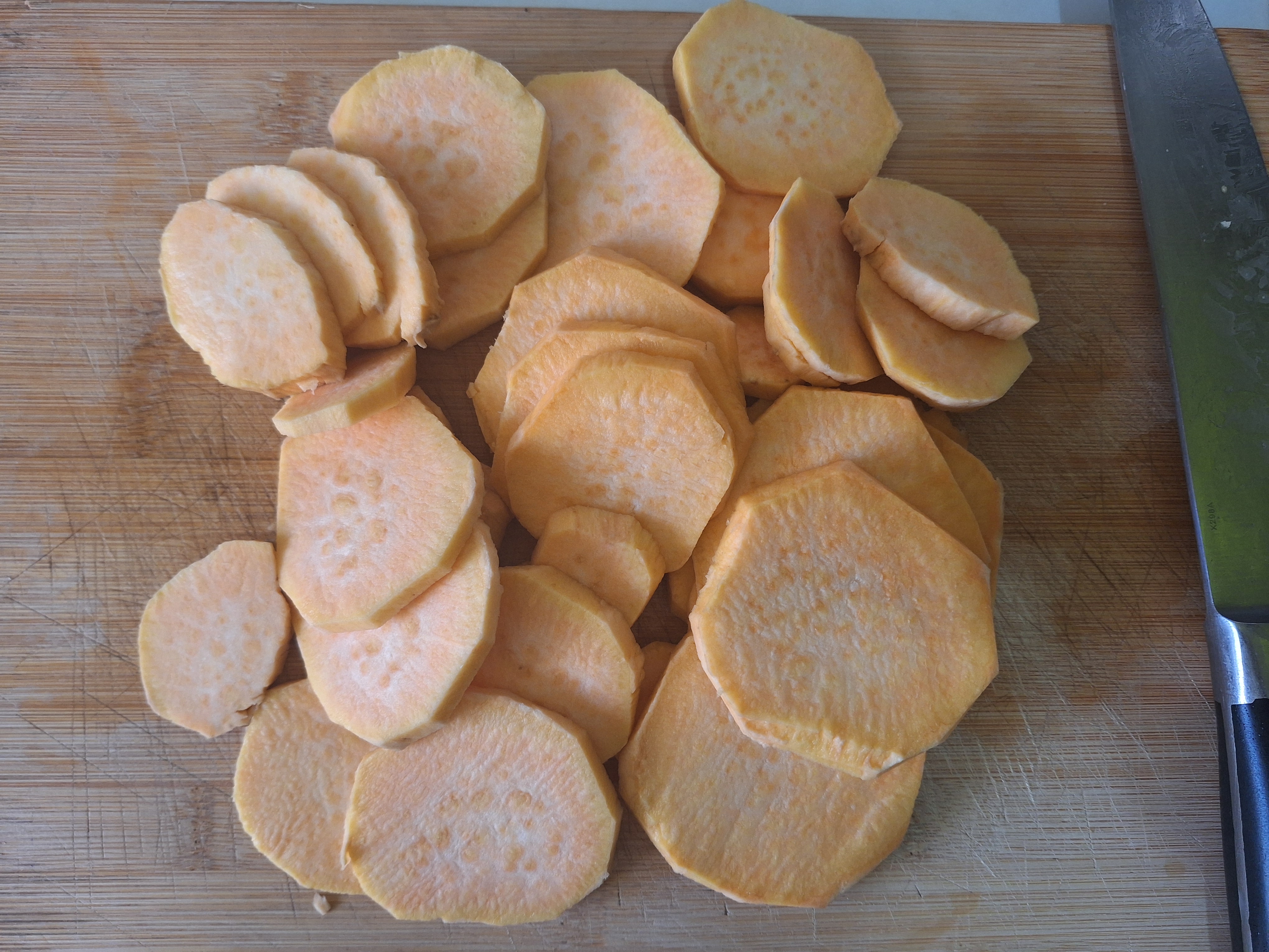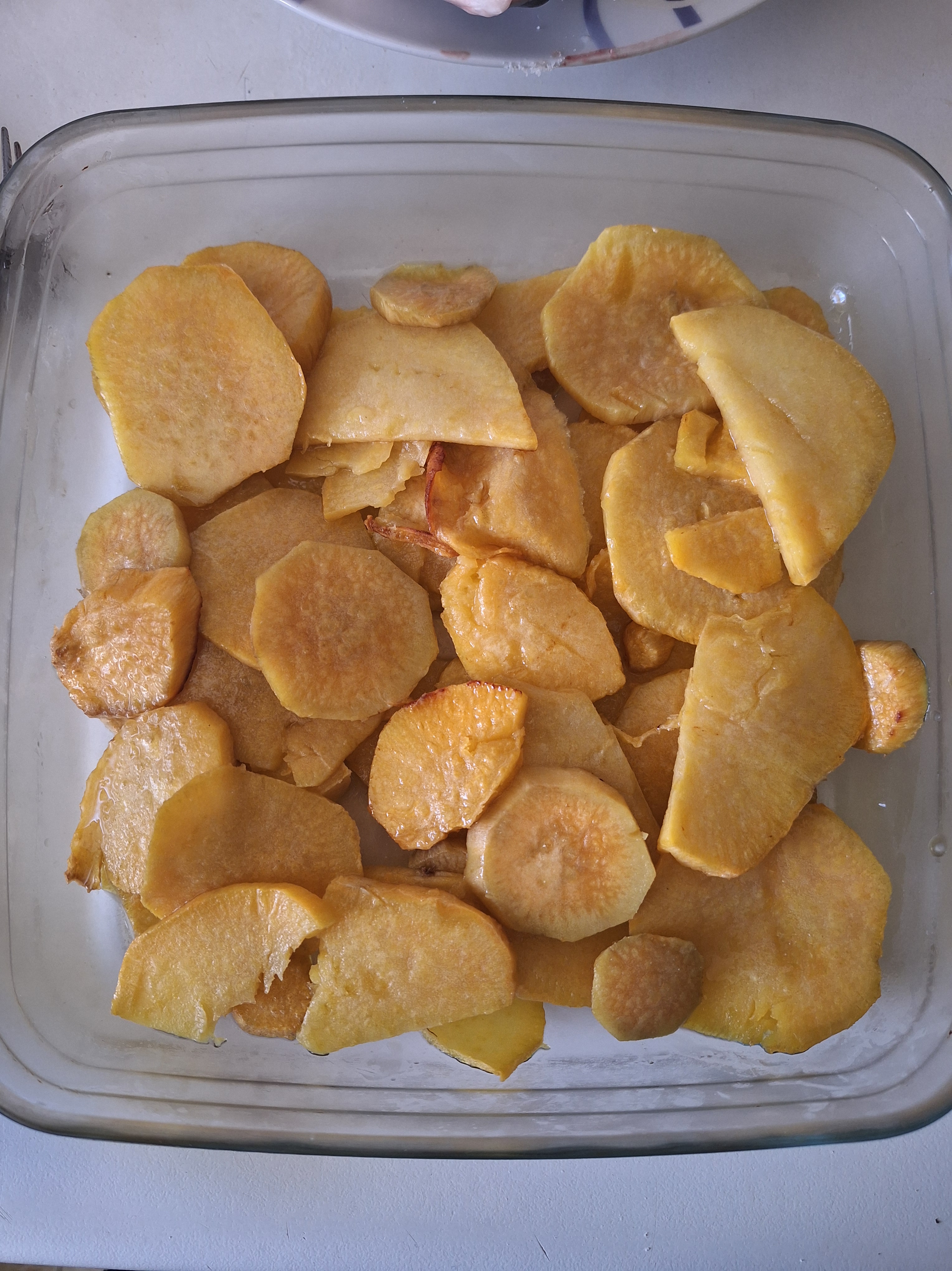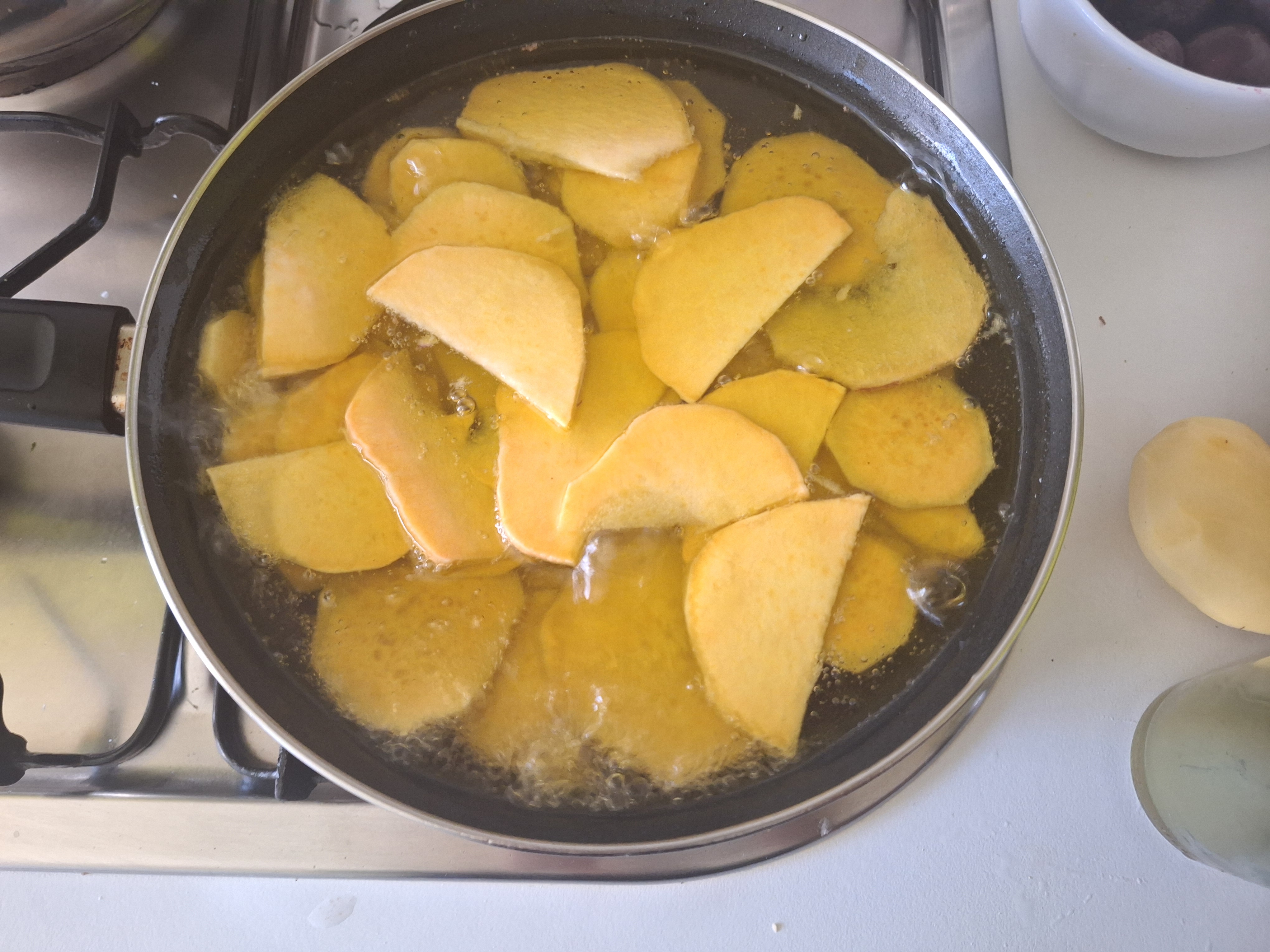Limpia la dorada, salpimenta por dentro y por fuera y reserva. Hidrata las pasas en agua templada. Pela el boniato, corta en rodajas finas y fríe en abundante aceite a fuego bajo hasta media cocción. Retira del fuego y escurre.