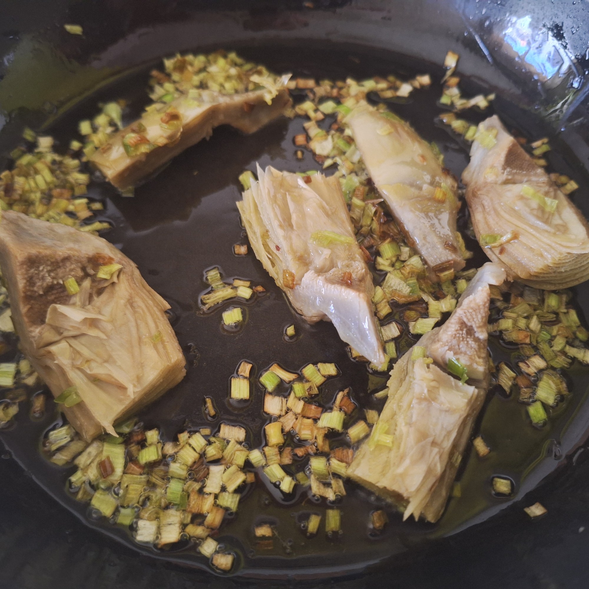 Limpia el puerro, corta en brunoise y pocha en un poco de aceite. Cuando esté transparente agrega las especias y mezcla bien. Agrega las alcachofas cocidas y los garbanzos y cocina 5 minutos. Por último, incorpora el agua y deja reducir el caldo.