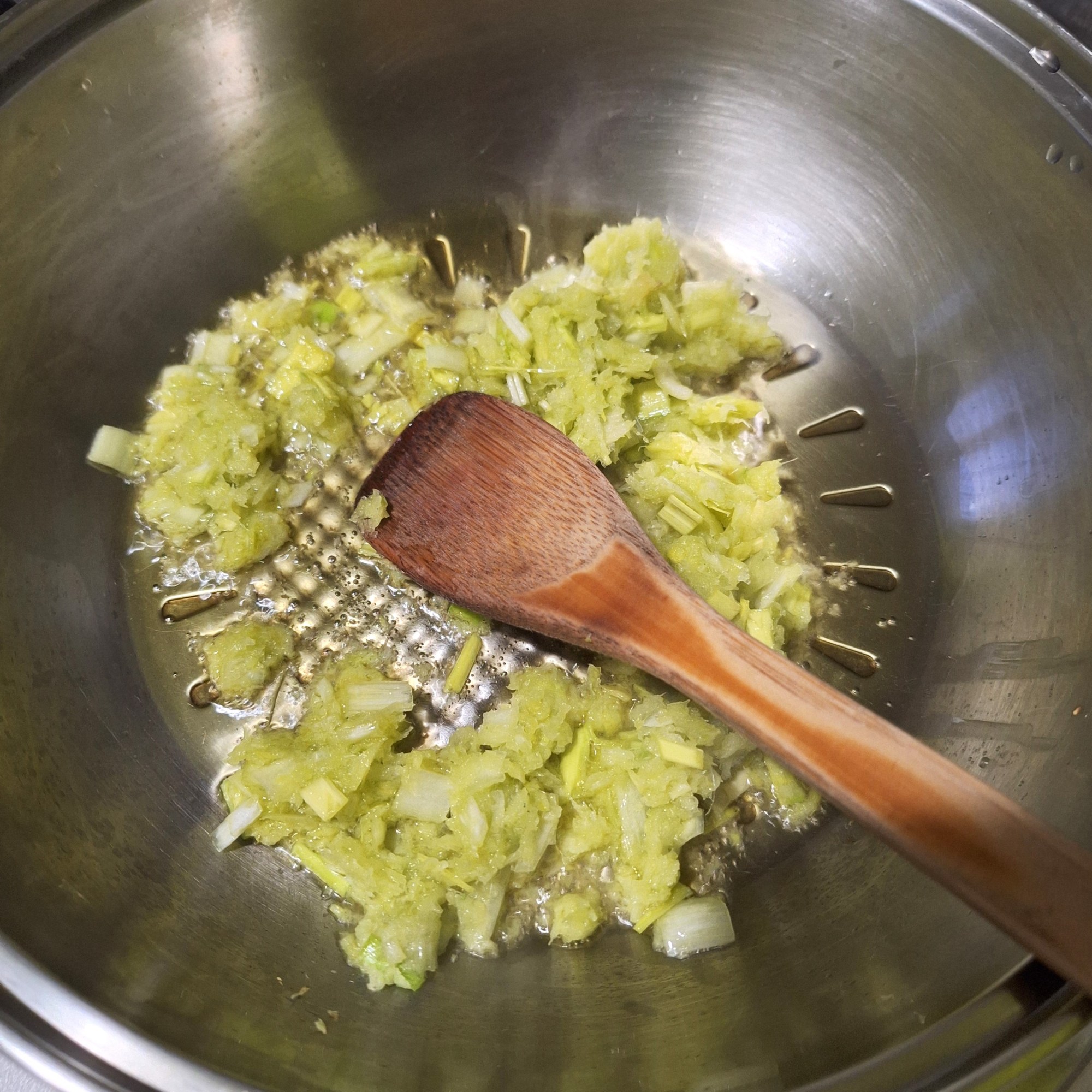 Limpia los portobellos, corta la base y luego en láminas finas. Pela el jengibre y maja con el mortero. Limpia el puerro y corta en brunoise.
