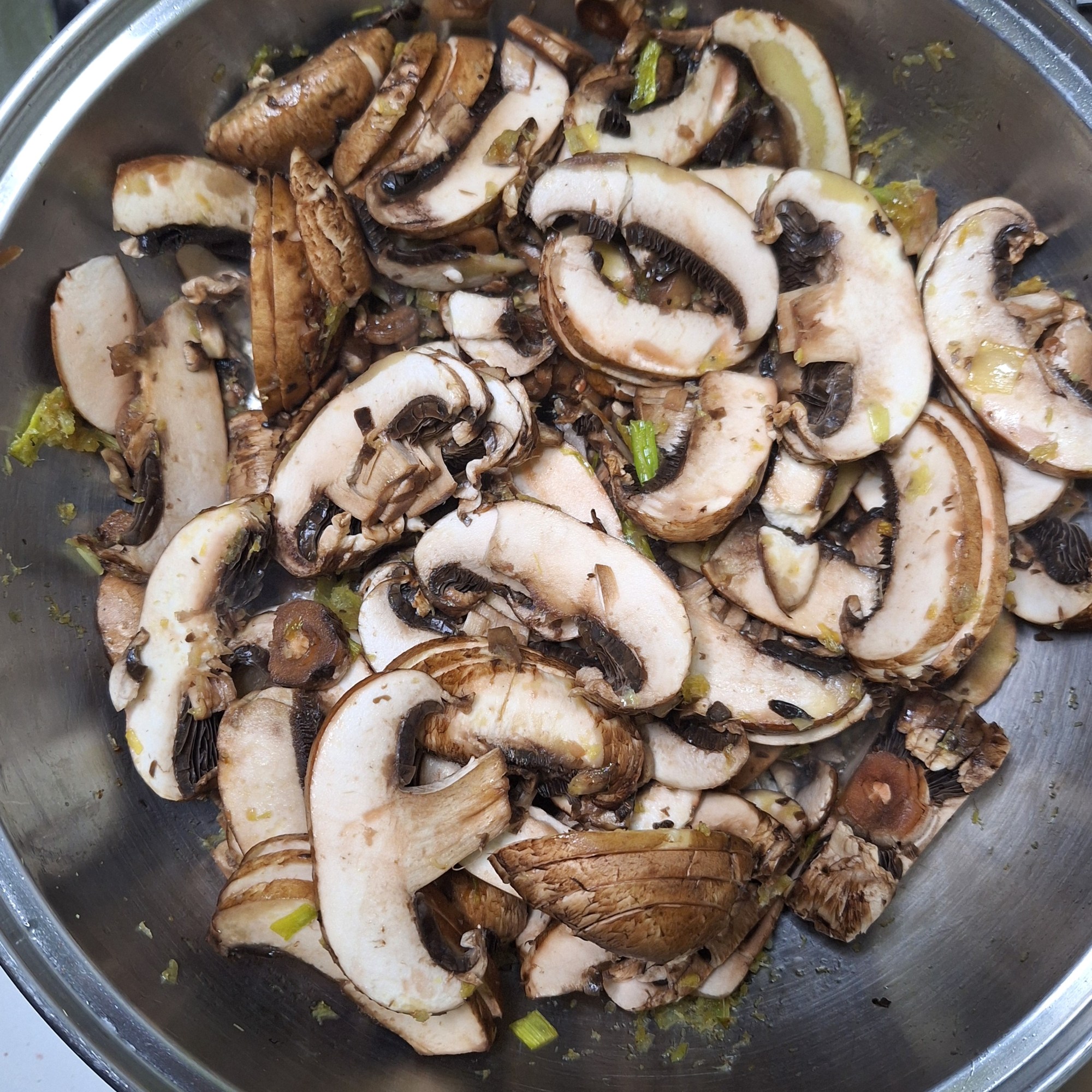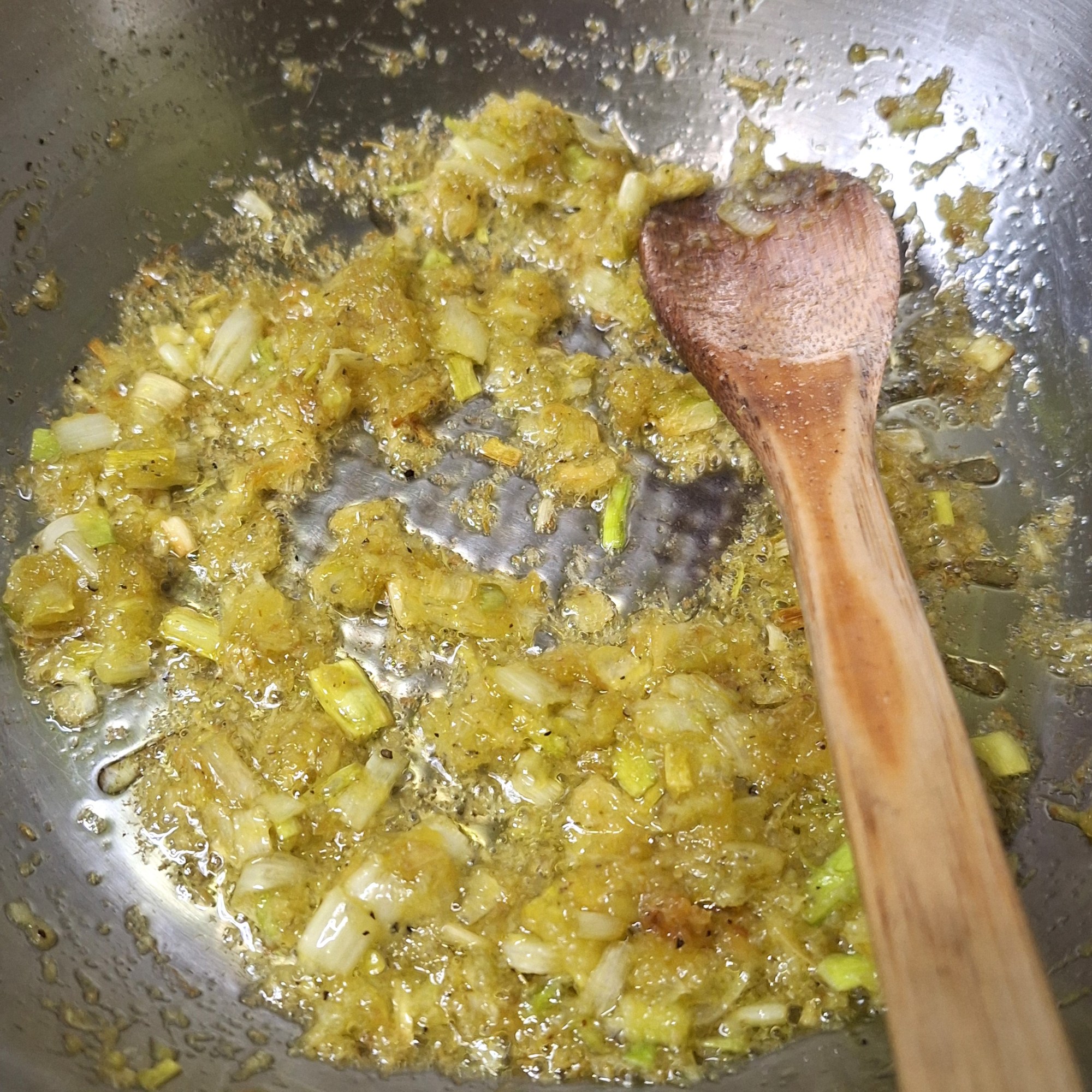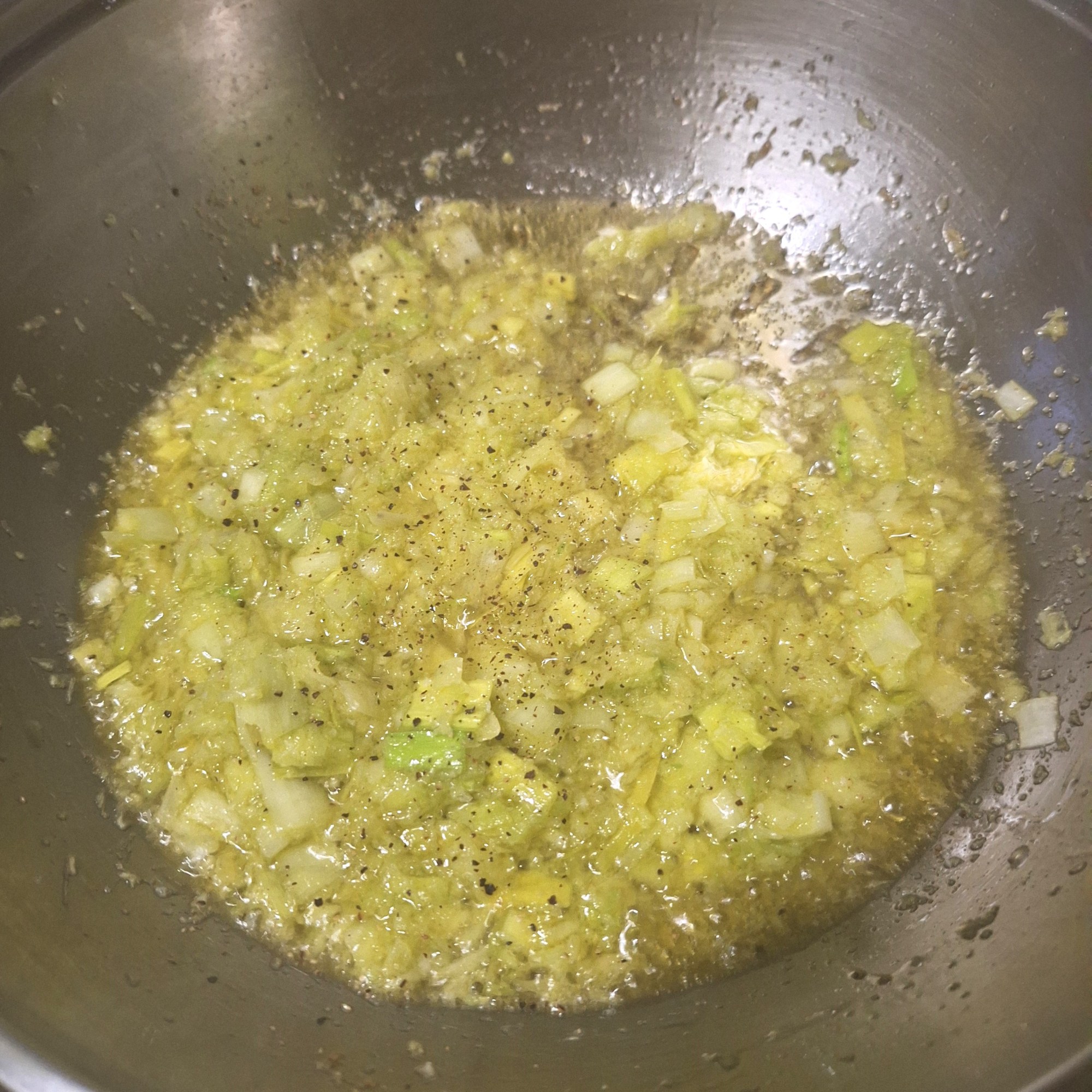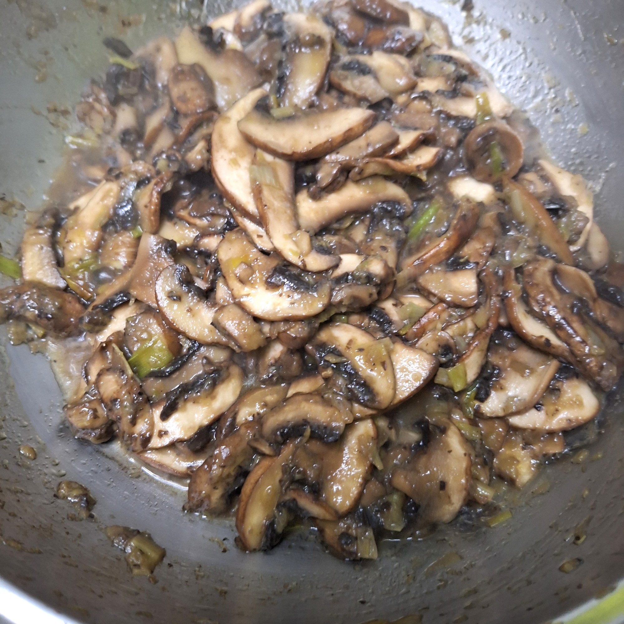 Pocha el puerro en un poco de aceite y, cuando empiece a transparentar, agrega el jengibre y los portobellos. Agrega la sal, la pimienta y el aminos de coco y cocina a fuego bajo hasta que estén tiernos.