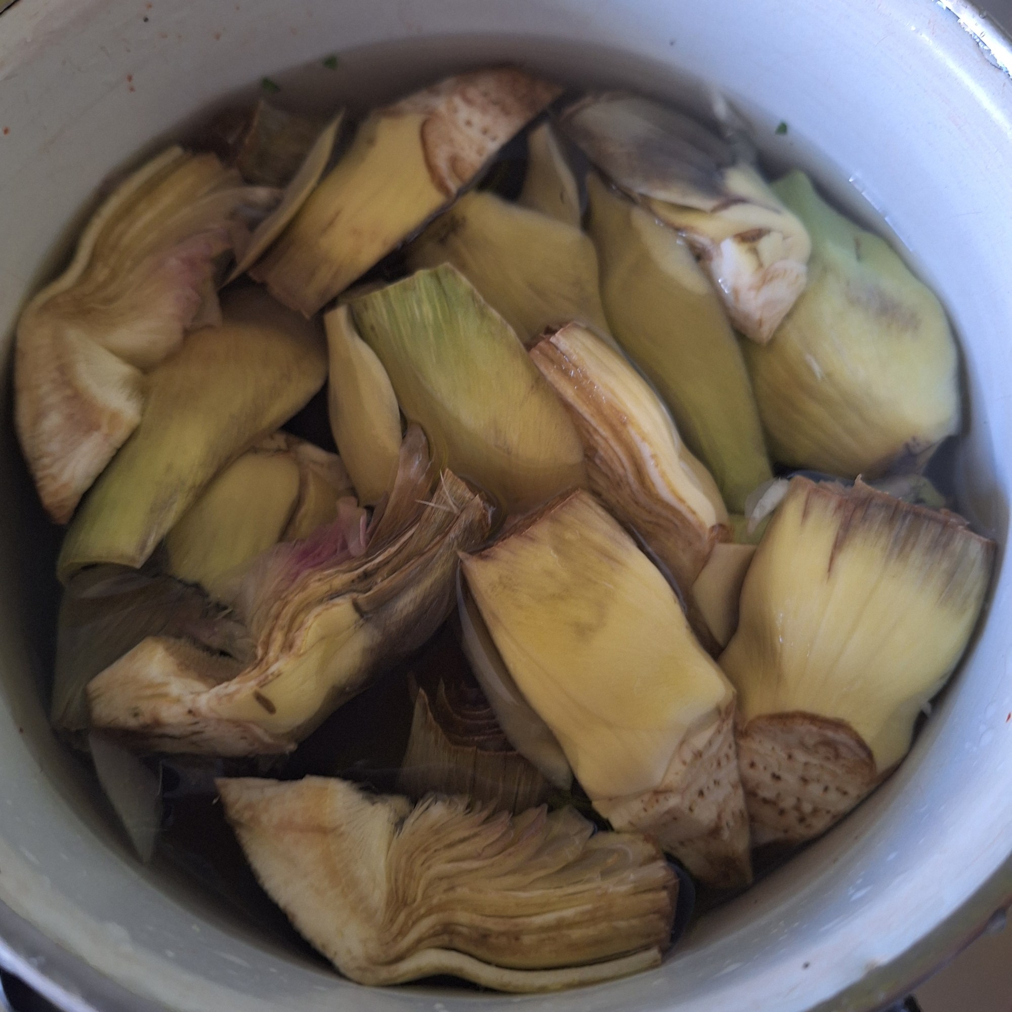 Limpia las alcachofas, retirando las hojas externas hasta llegar a la parte tierna, corta las puntas y pela el tallo. Corta en 6 trozos y cuece en agua con sal (el corazón y algunas hojas para decorar) y un chorrito de vinagre de manzana. Escurre y reserva.