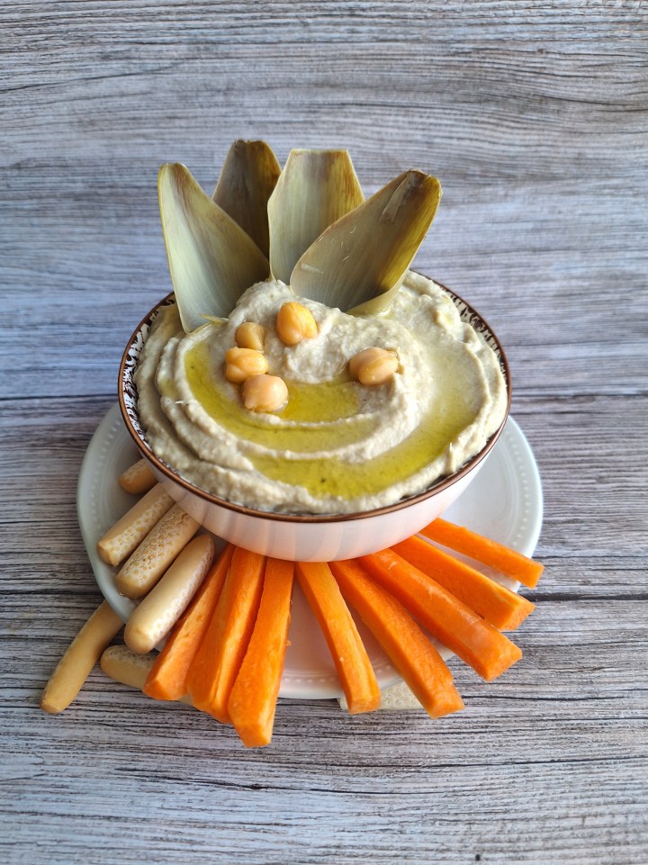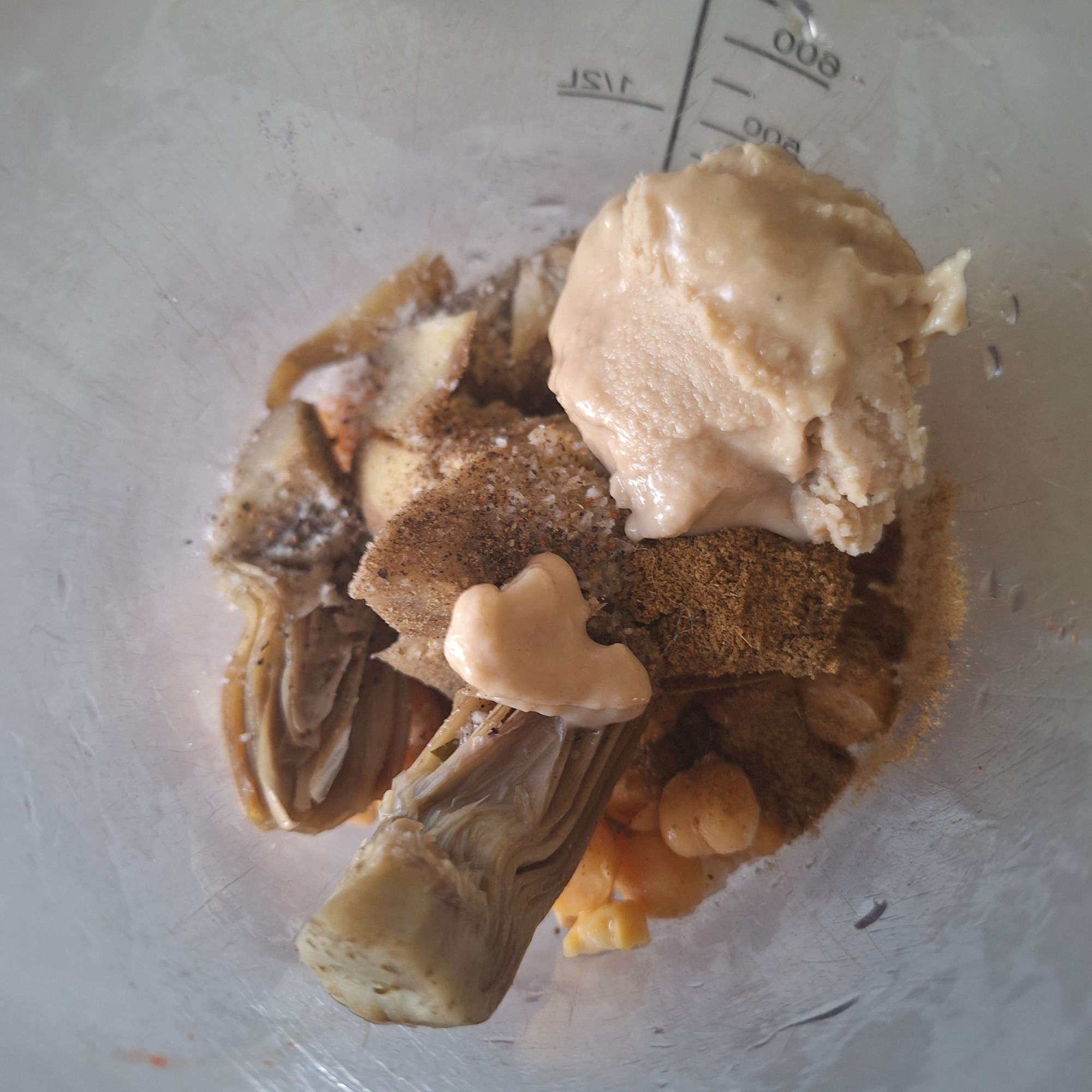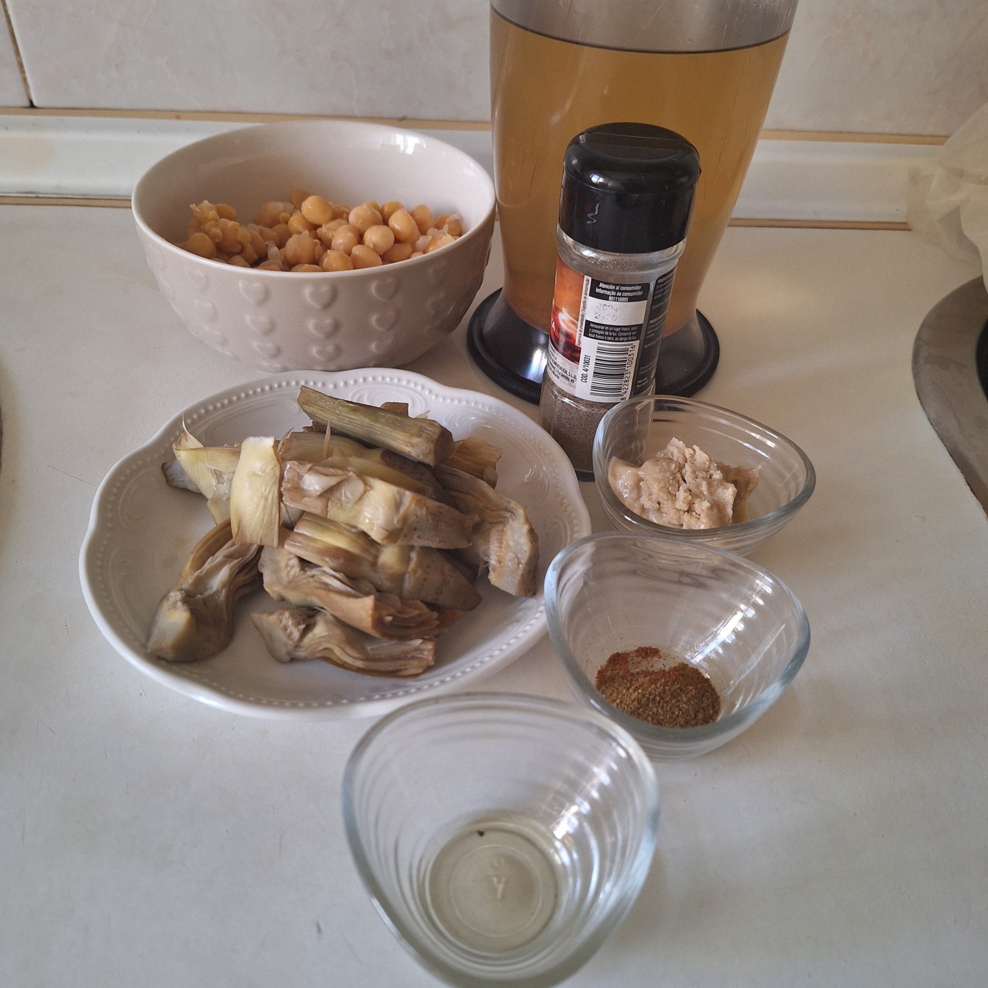 Aclara los garbanzos, escurre y reserva algunos para decorar. Vierte en el vaso de la batidora junto con las alcachofas, el tahini, el vinagre y las especias. Tritura, añadiendo de poco a poco el agua de cocción de las alcachofas, hasta obtener la textura que te guste.