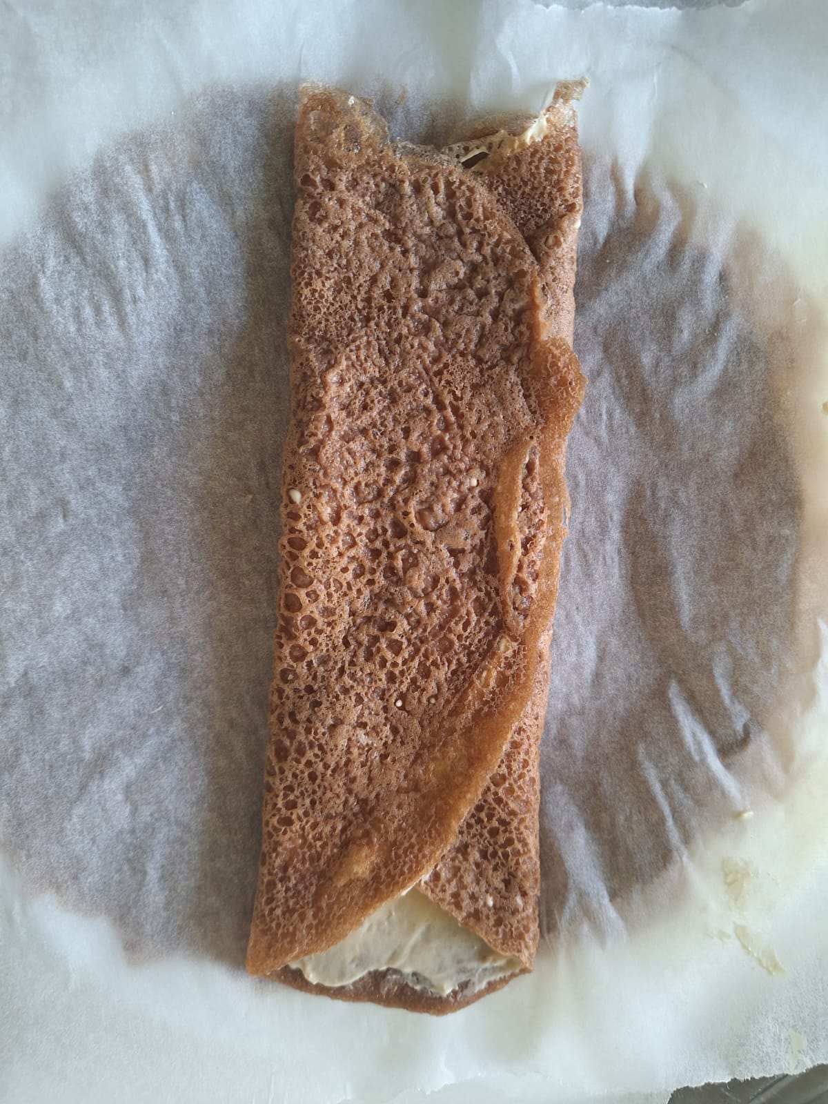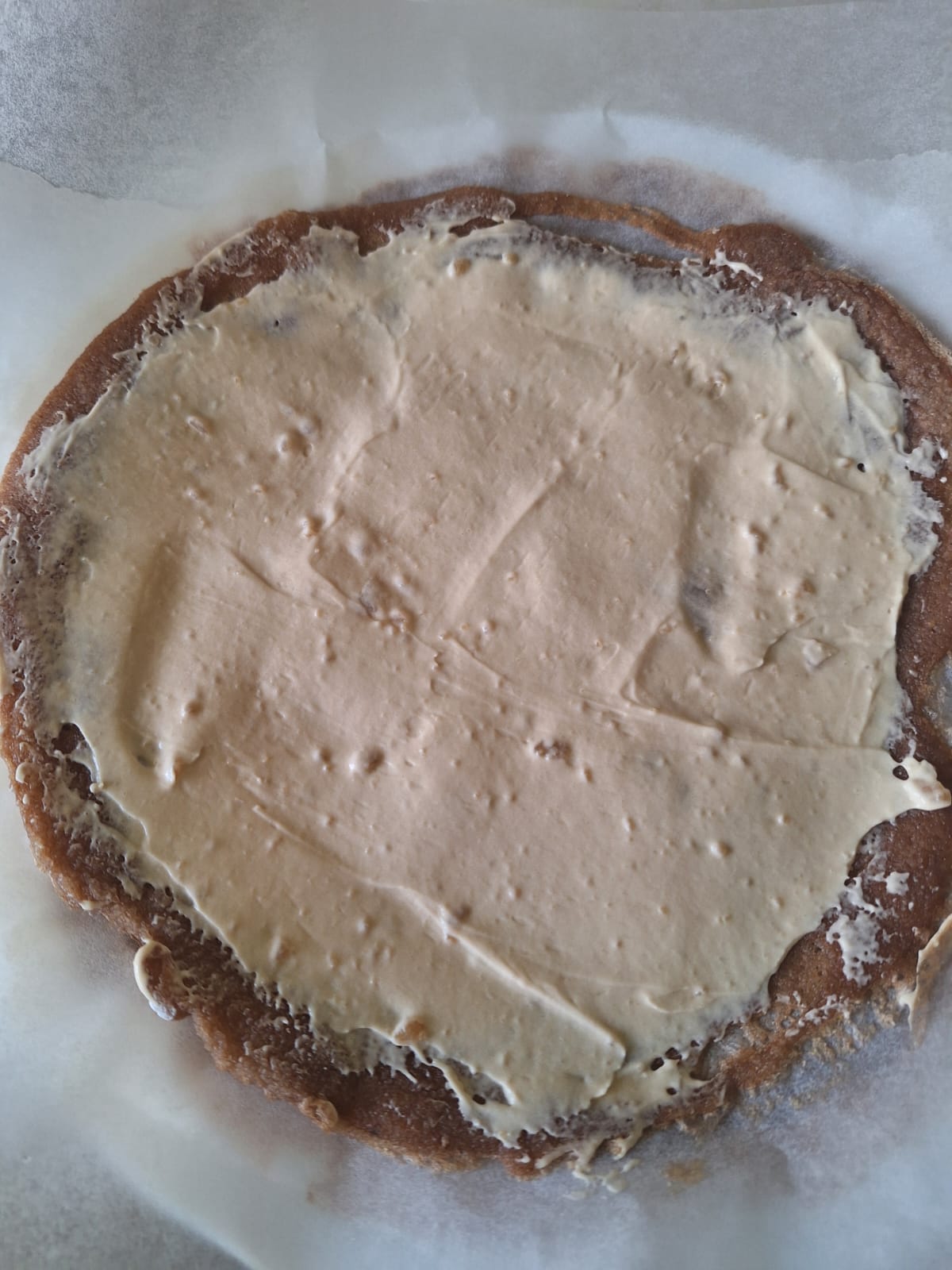 Se trata de un roll cake, un pastel enrollado hecho con crepes (con harina de algarroba en este caso, ya que no puedo tomar chocolate) y relleno de una crema de café. La receta de las crepes es de Glutendence, aunque he hecho versión vegana y añadido el toque de algarroba.