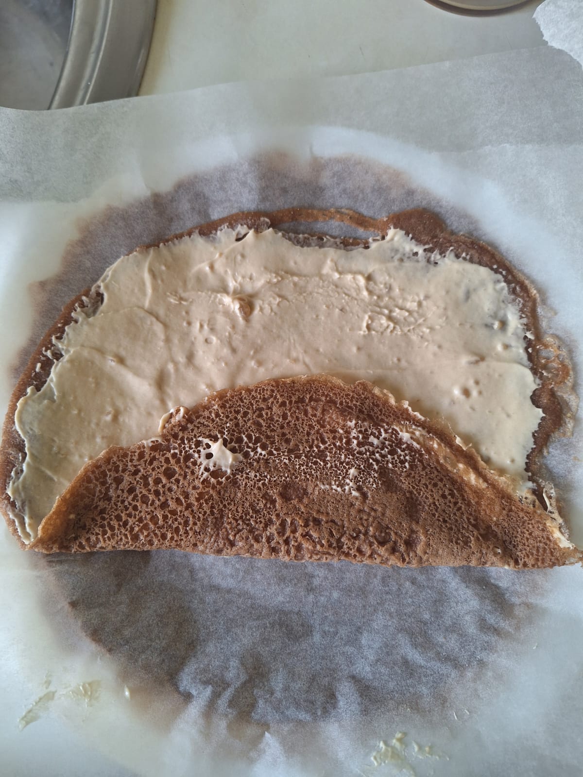 Coloca una crepe sobre un trozo de film y con ayuda de una espátula cubre con parte de la crema. Extiende bien y dobla en tres partes: toma un extremo hacia el centro y después cubre con el otro. Enrolla, ayudándote con el film, de manera que quede compacto. Lleva al frigo una hora.