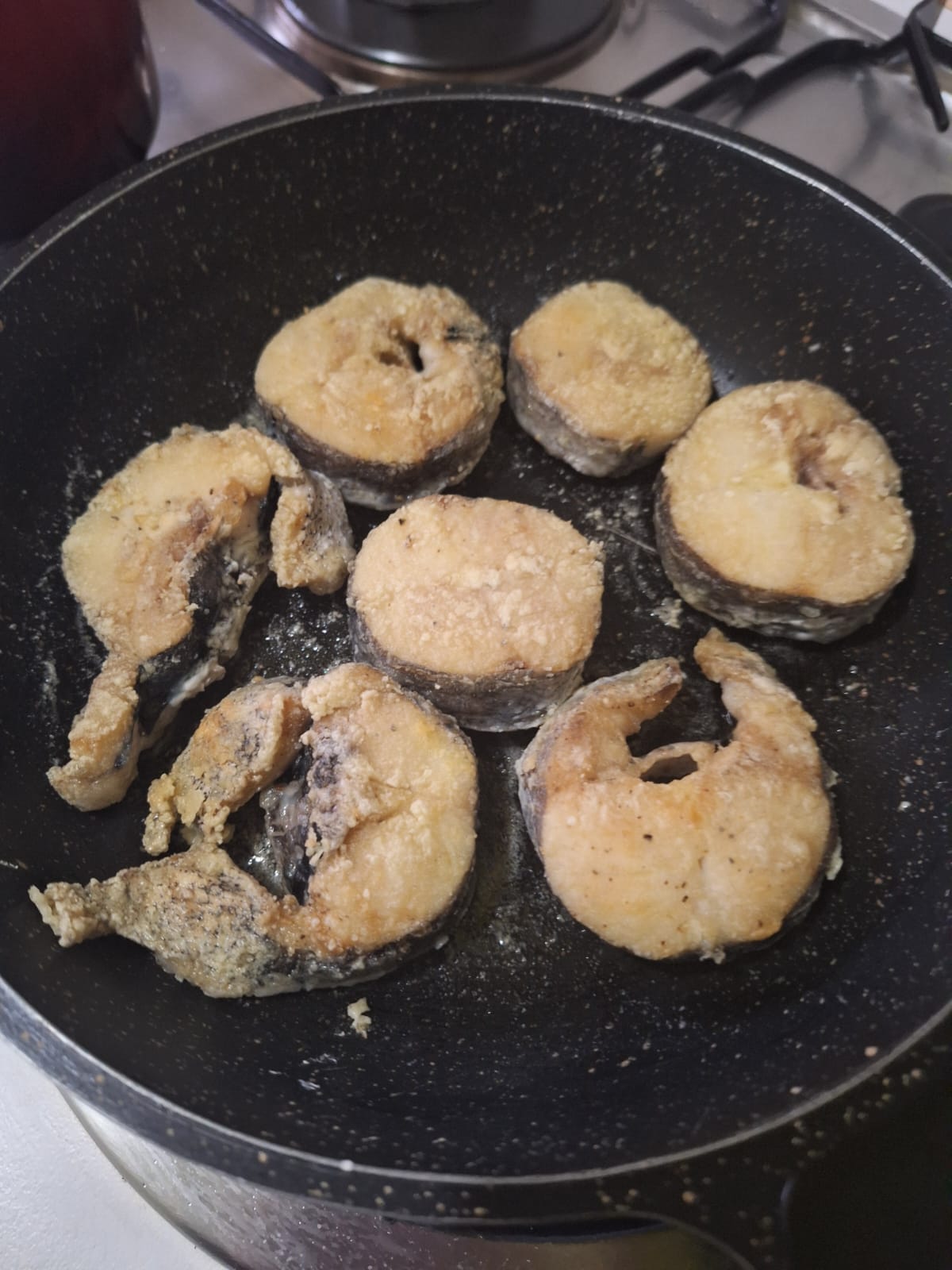 Cuece los guisantes en agua con sal. Escurre y reserva. Salpimenta las rodajas de pescadilla, reboza en maicena y dora en un poco de aceite. Retira y reserva sobre papel de cocina.
