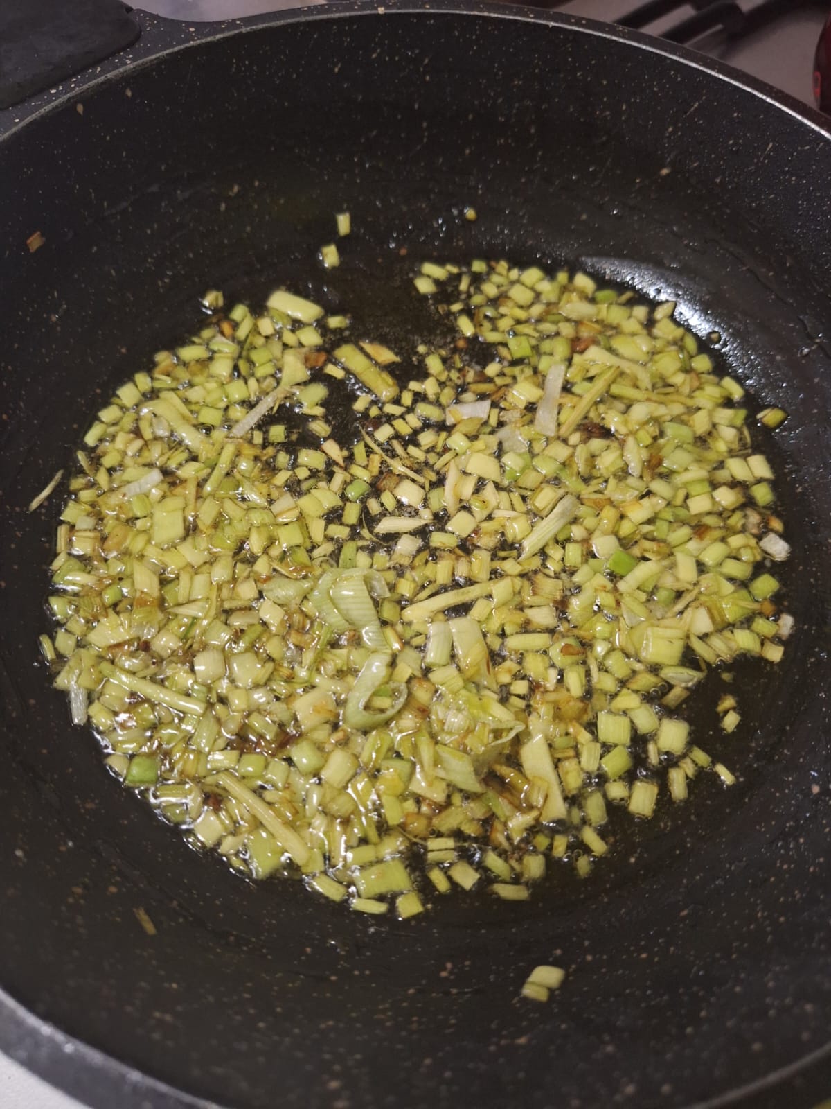 Pica el puerro en brunoise y pocha en un poco de aceite. Cuando esté transparente agrega los guisantes (reserva unos cuantos para decorar), el caldo y cocina hasta que reduzca un poco. Vierte en el vaso de la batidora y tritura hasta obtener una crema fina (añade más agua si es necesario). Vuelca de nuevo en la cazuela y añade las rodajas de pescadilla.