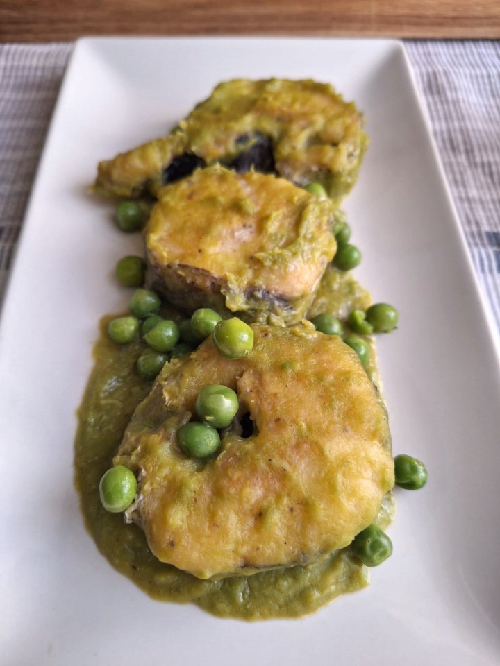 Hoy os traigo una receta muy sencilla, completa y muy sabrosa. Se trata de una pescadilla en salsa verde, pero esta salsa está elaborada a base de guisantes. Como ya sabéis, los guisantes son una legumbre, por lo que nos queda un plato muy nutritivo, saciante y saludable.