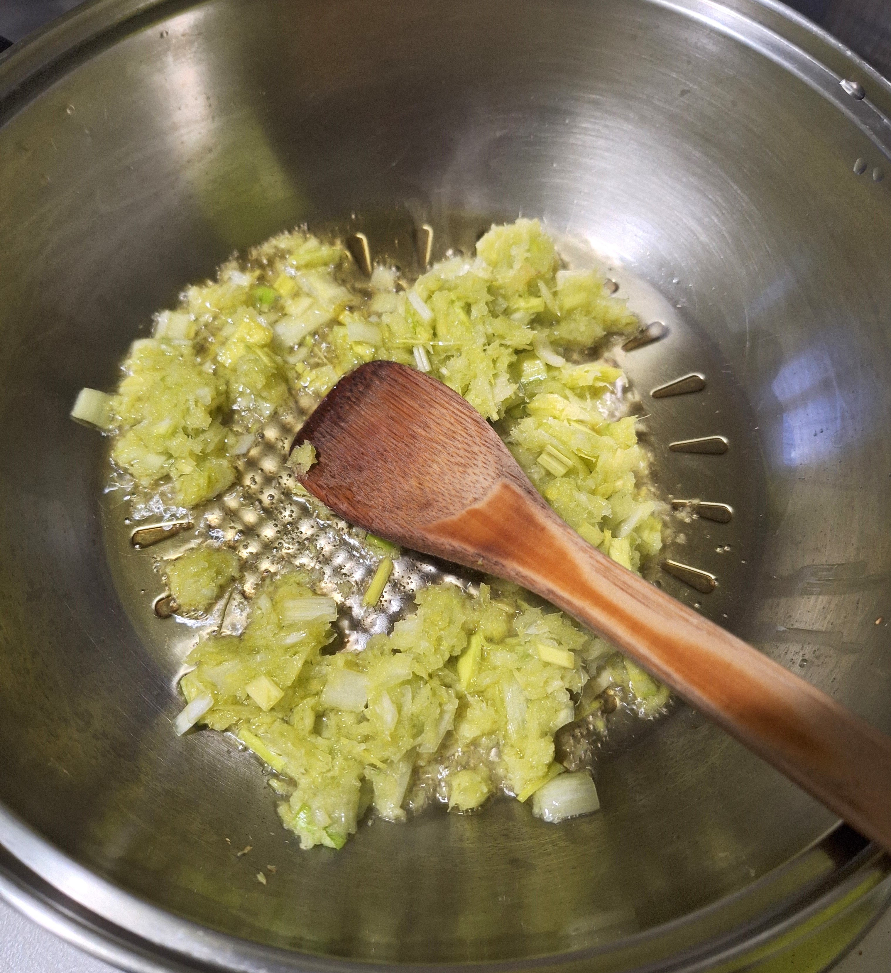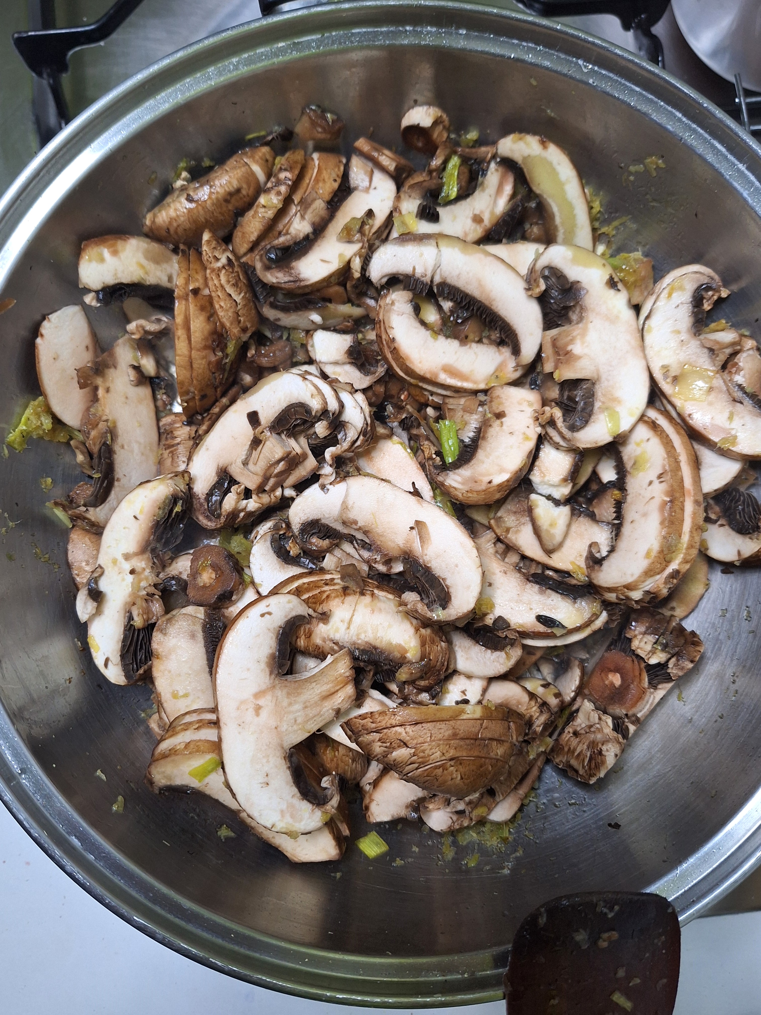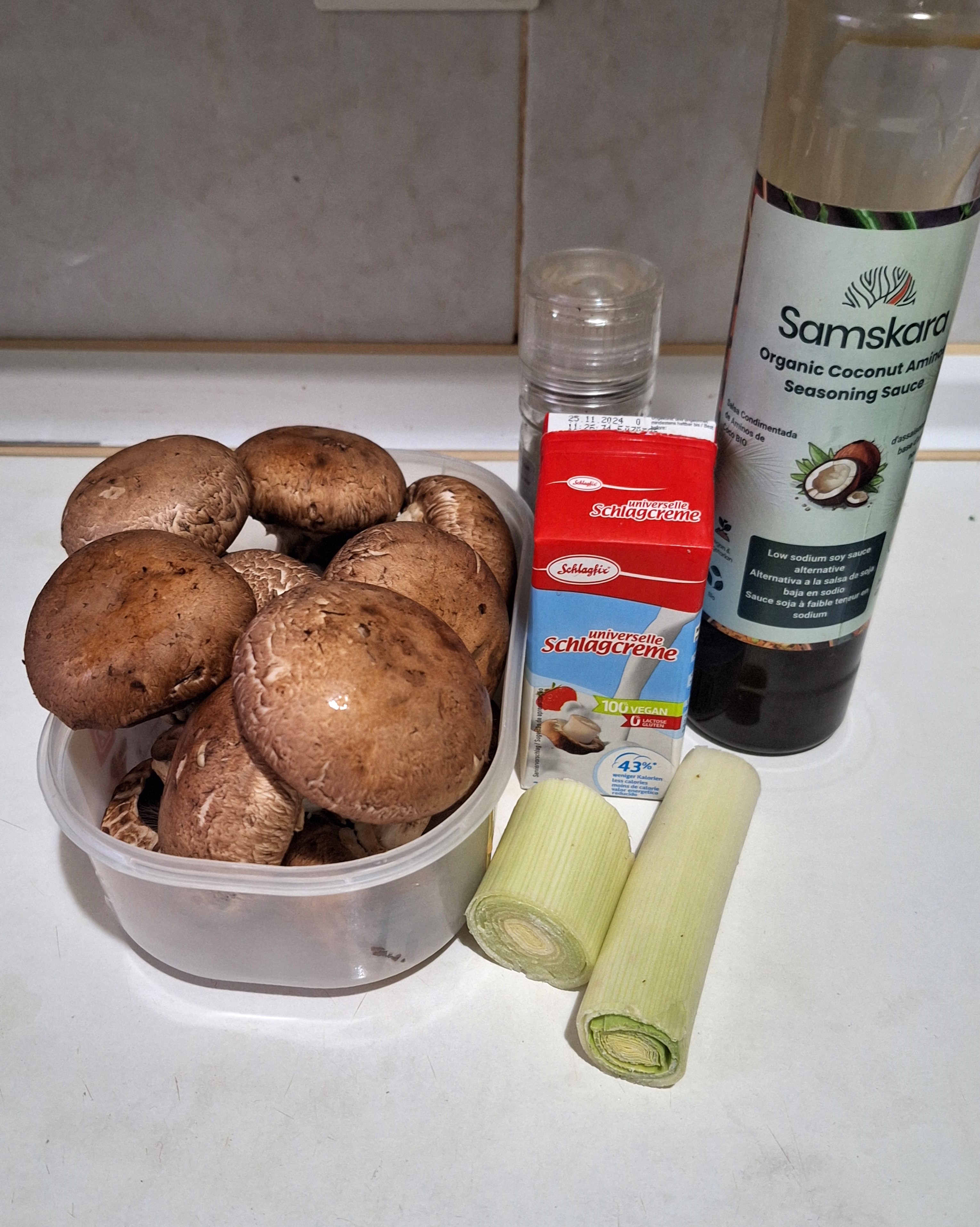 Pocha el puerro en un poco de aceite y, cuando empiece a transparentar, agrega el jengibre y los portobellos. Agrega la sal, la pimienta y el aminos de coco y cocina a fuego bajo hasta que estén tiernos.