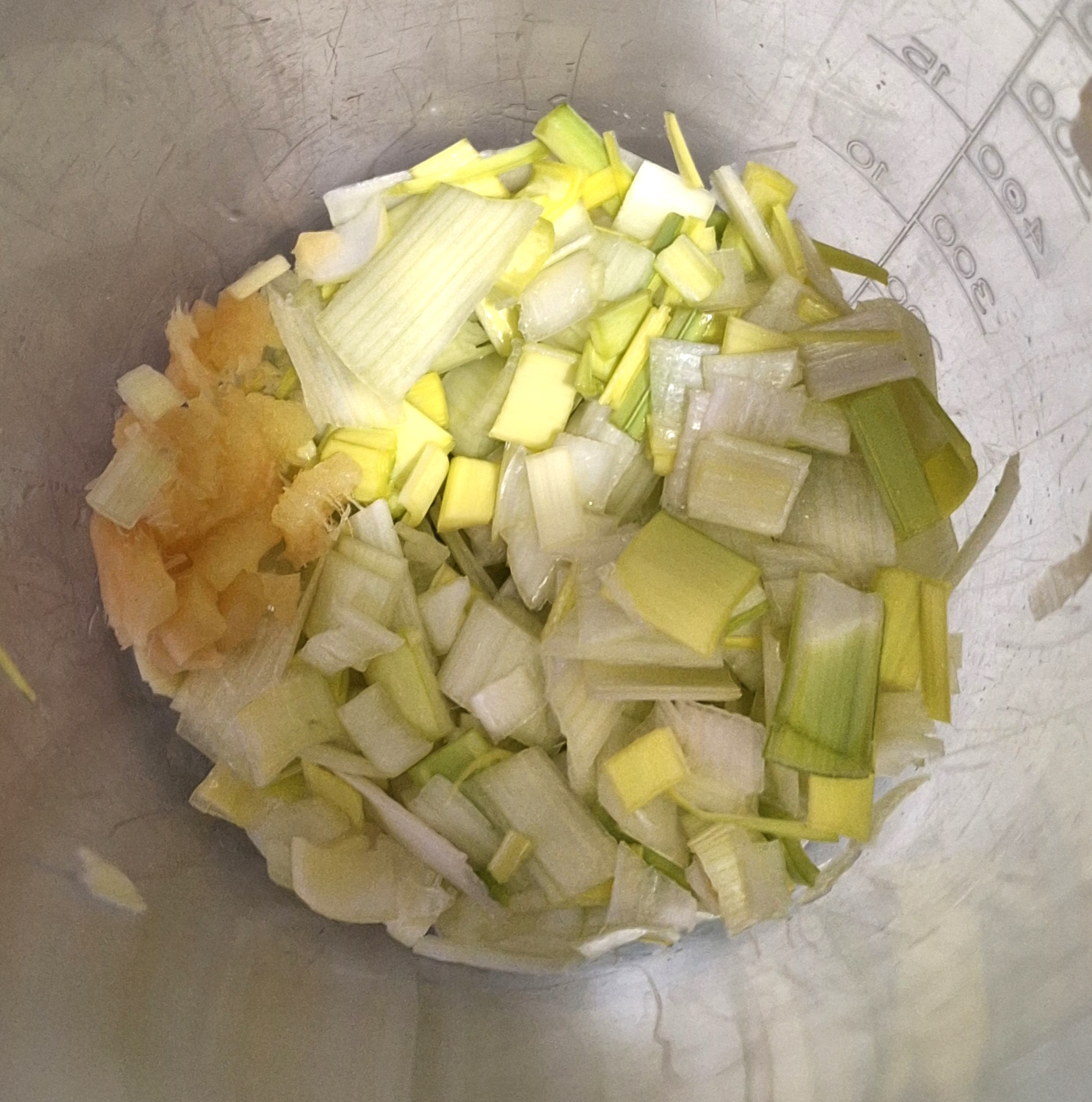 Limpia los portobellos, corta la base y luego en láminas finas. Pela el jengibre y maja con el mortero. Limpia el puerro y corta en brunoise.