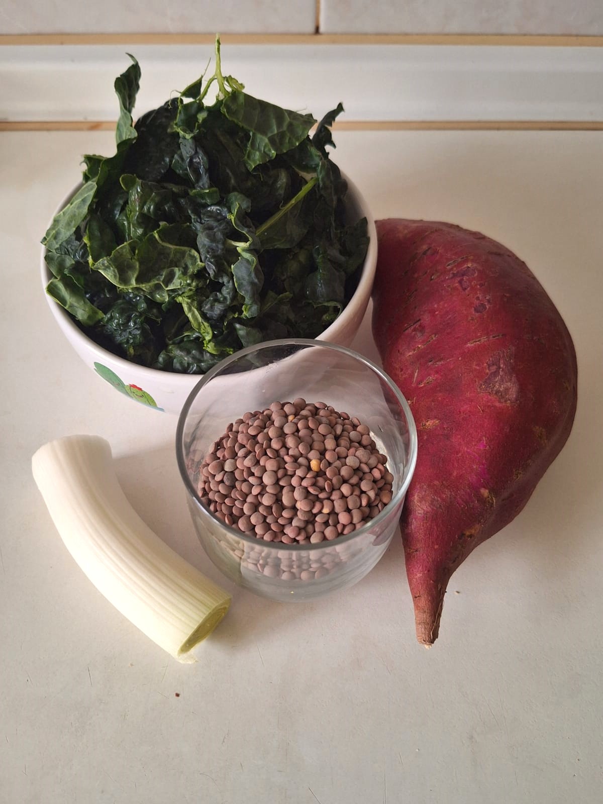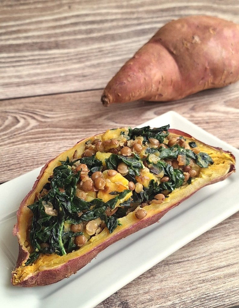 Hoy os traigo una receta que me encanta y que es muy saciante y nutritiva: boniato relleno de lentejas y kale. Tanto el boniato como la kale son alimentos de temporada y están en su máximo esplendor. Descubrí la kale hace muchos años y suelo consumirla bastante en esta época. Es considerada un super alimento y es rica en proteína vegetal. La he rellenado con lentejas (también la podéis rellenar con carne picada, pero la idea es incrementar el consumo de legumbres), por lo que tenemos un plato vegano y muy saludable. Es una opción perfecta para dar respuesta a todas las necesidades alimentarias y os aseguro que está súper rico. ¿Os animáis a probarla?