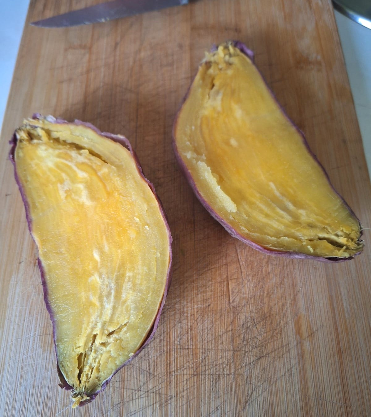 Lava el boniato, seca un poco y coloca en un recipiente con un poquito de agua. Cubre con film y cocina en el microondas unos 15 minutos. Destapa con cuidado de no quemarte con el vapor, da la vuelta, cubre de nuevo con film y cocina otros 15 minutos (o más si es necesario). Sabrás que está en su punto si al clavar el cuchillo y levantar el filo sale sin dificultad.