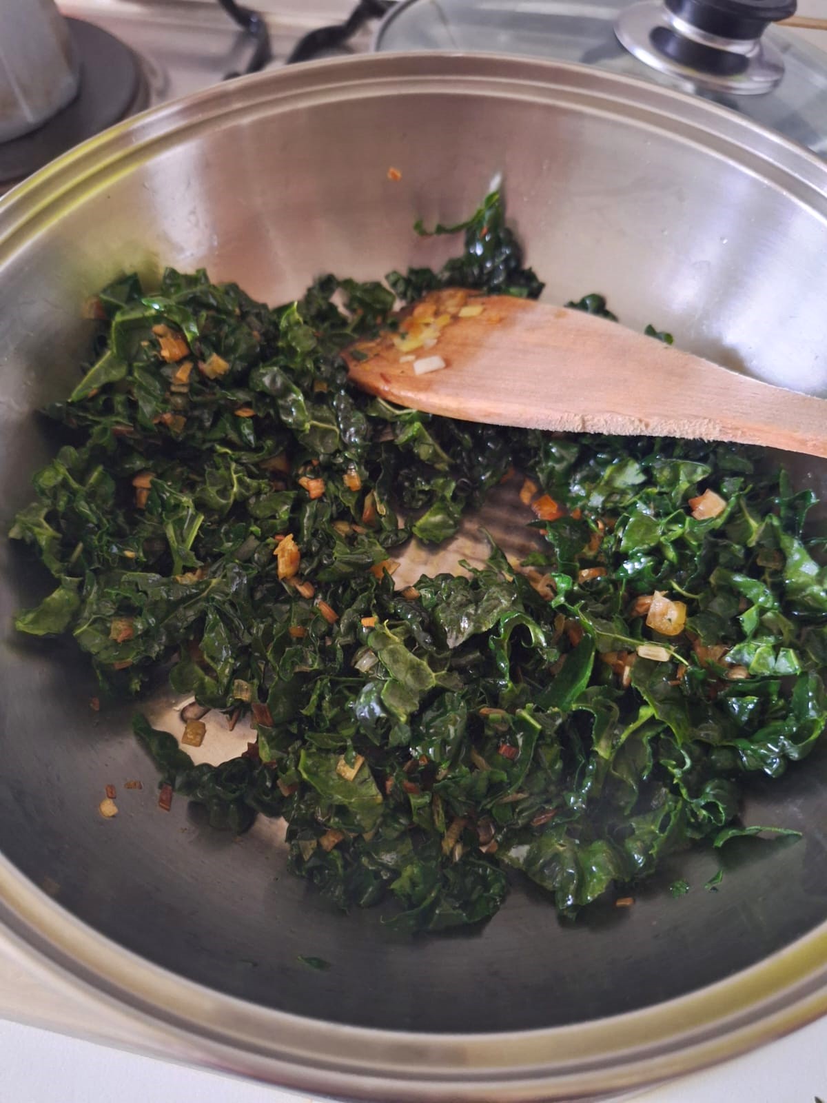 Lava la kale y retira el tallo. Corta las hojas en trozo medianos y cuece en agua con sal hasta que esté tierno. Escurre y reserva.
