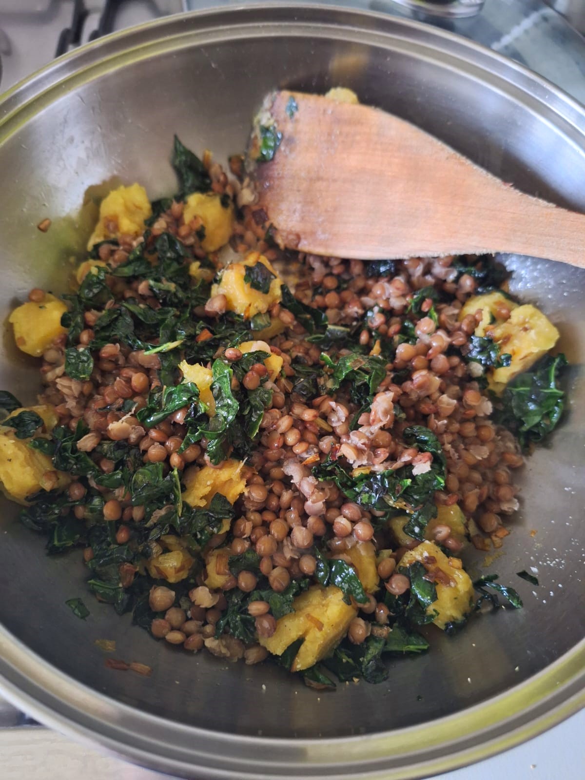 Limpia el puerro y pica en brunoise. Calienta un poco de aceite en una sartén grande y pocha el puerro. Cuando esté transparente agrega la kale y saltea unos minutos. Después añade el boniato y las lentejas. Salpimenta y mezcla todo bien durante unos 5 minutos.