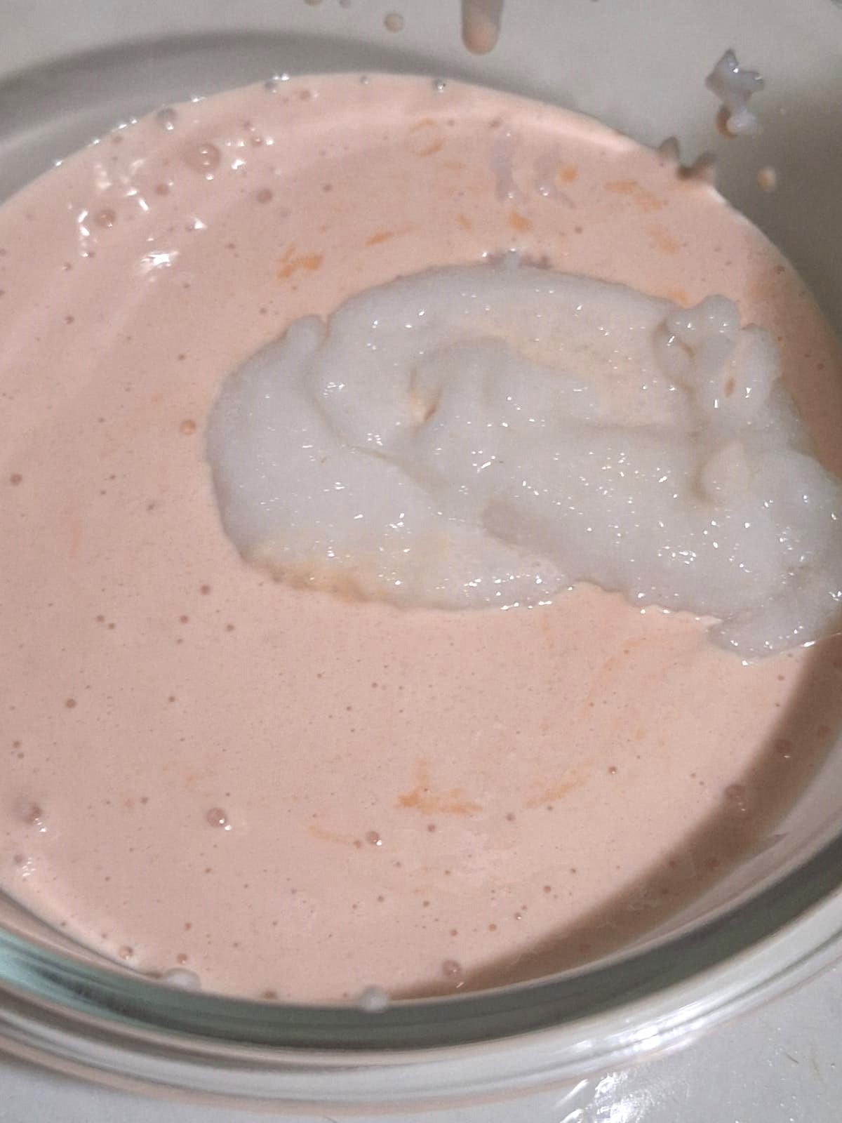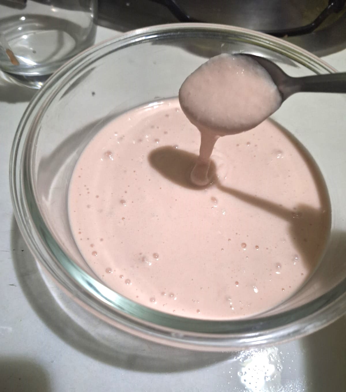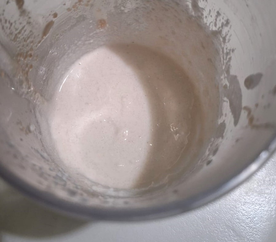 Mezcla las tres masas: la de arroz basmati, la de lentejas y la de arroz bomba. Recuerda que debe tener textura de natillas. Cubre con film, lleva al frigo y deja fermentar mínimo 12 horas (hasta que la masa haga burbujitas). Yo la dejé 48 horas porque no pude utilizarla antes (y quedó perfecta).