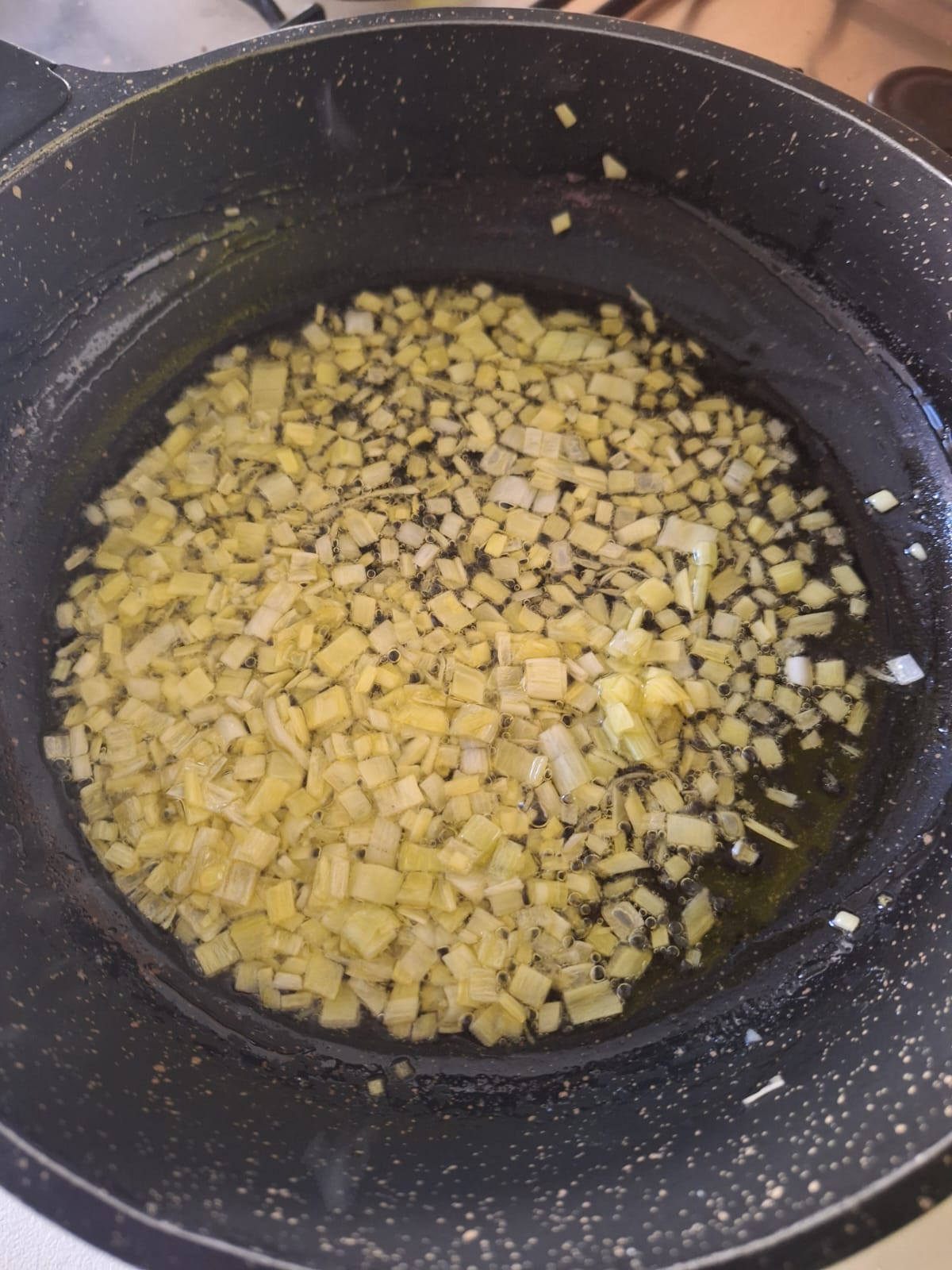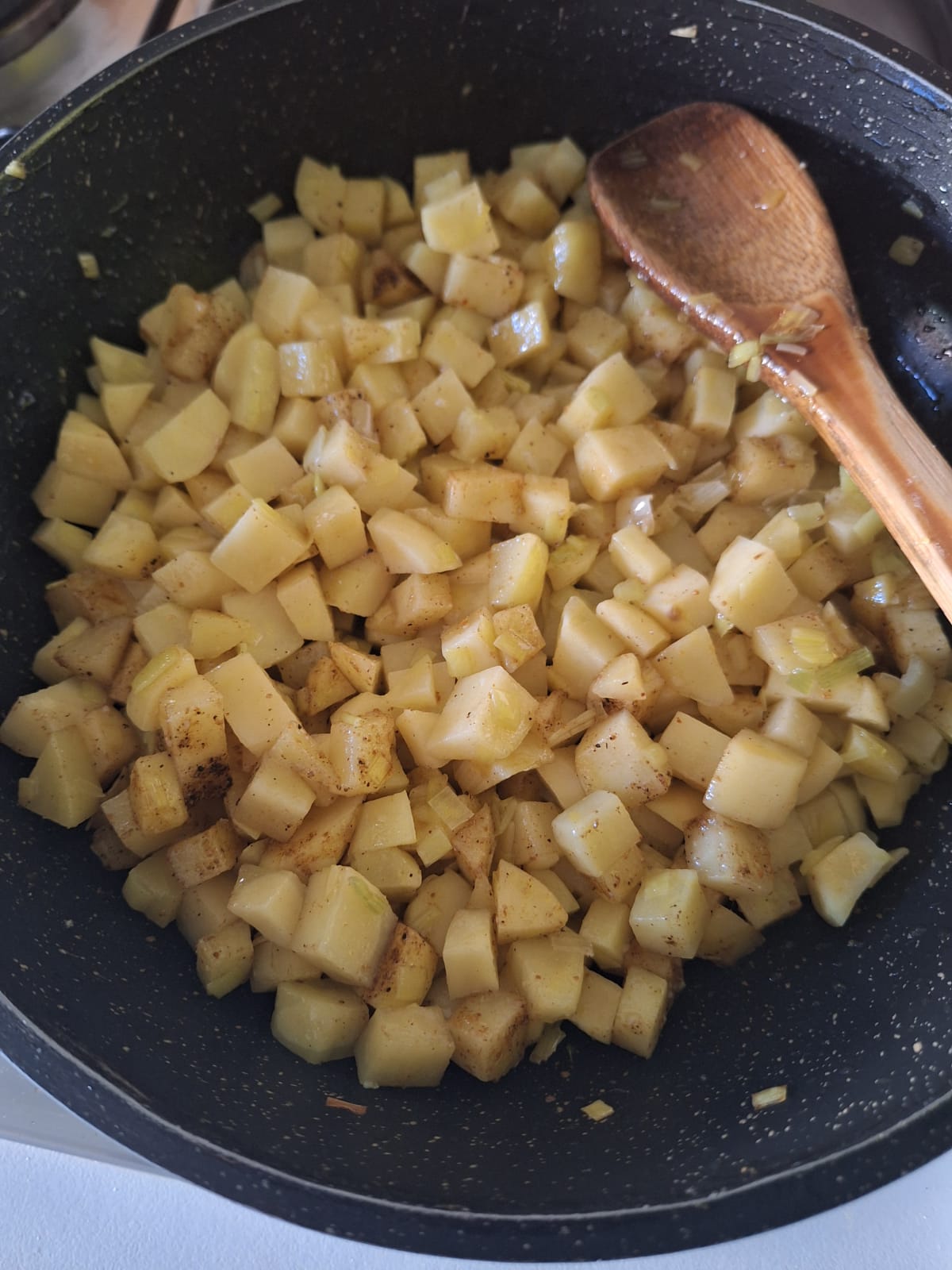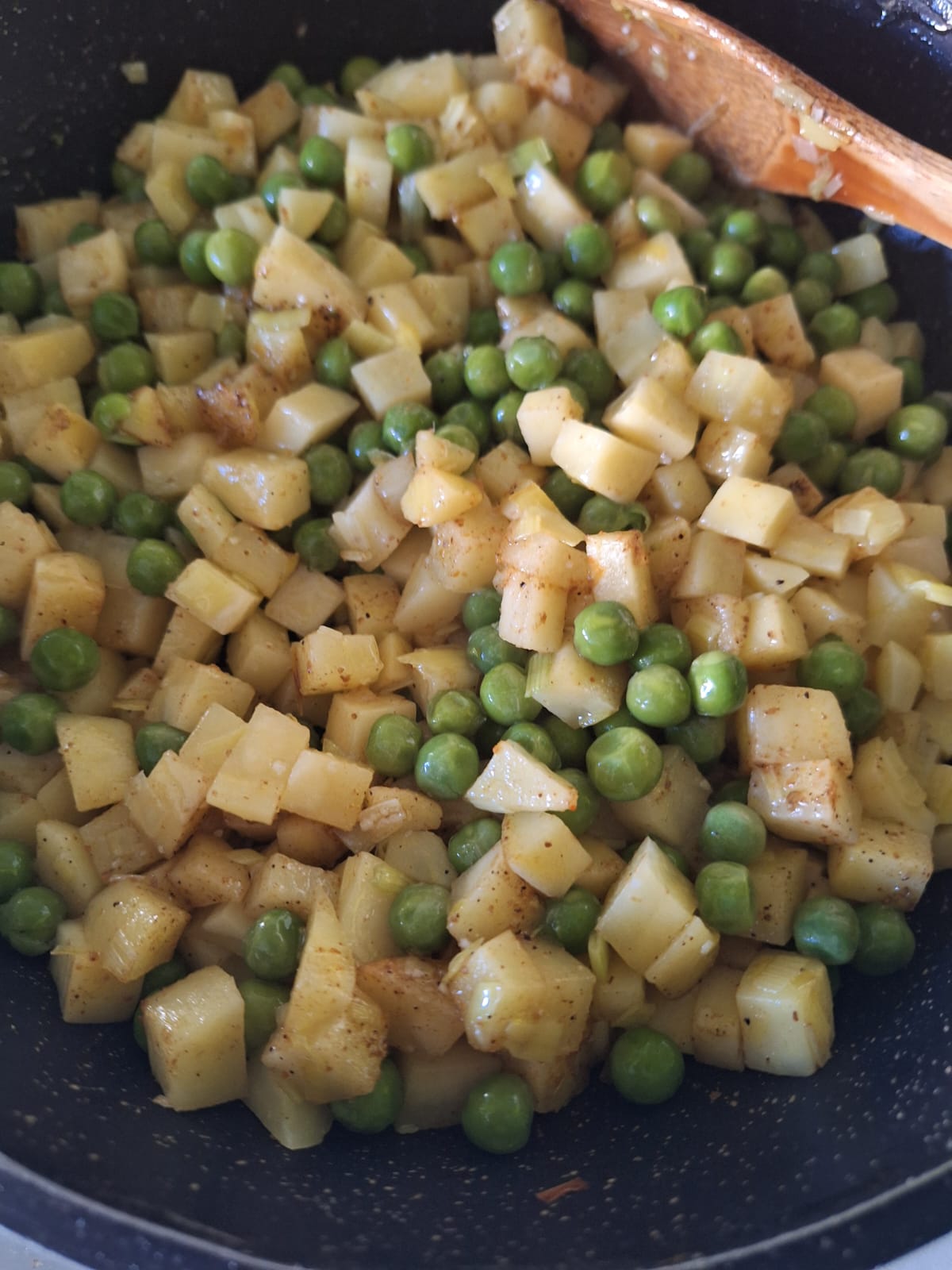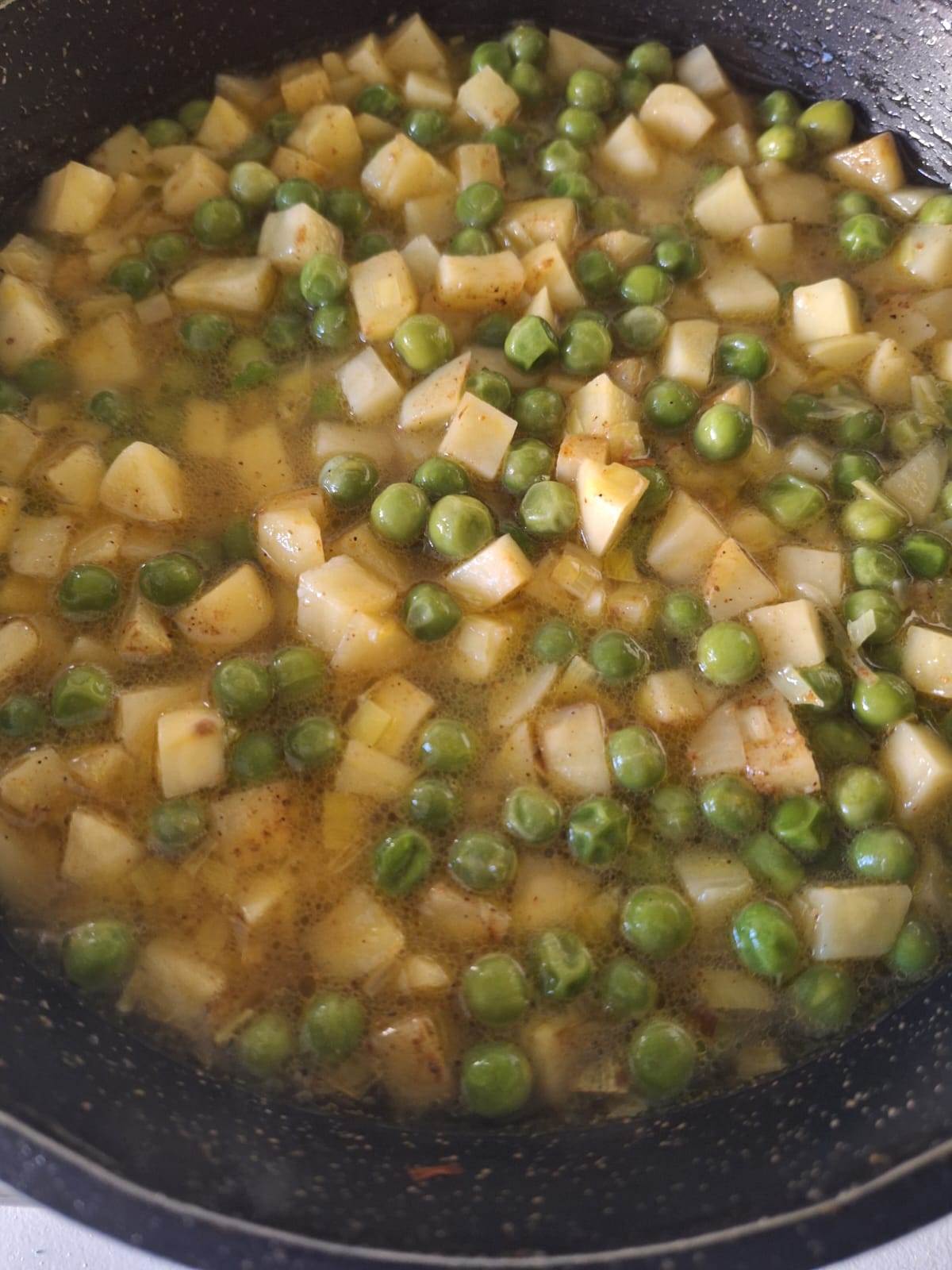 Pasado este tiempo prepara el relleno. Pela las patatas y corta en cubos. Limpia el puerro y corta en brunoise, pocha en un poco de aceite. Cuando esté transparente añade las especias y cocina un minuto (que no se quemen). Añade los guisantes, las patatas y el agua y cuece hasta que estén tiernos. Si necesitas más líquido, añade poco a poco, debe quedar un relleno seco. Retira del fuego y reserva.