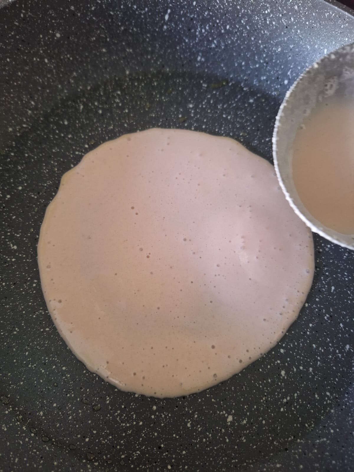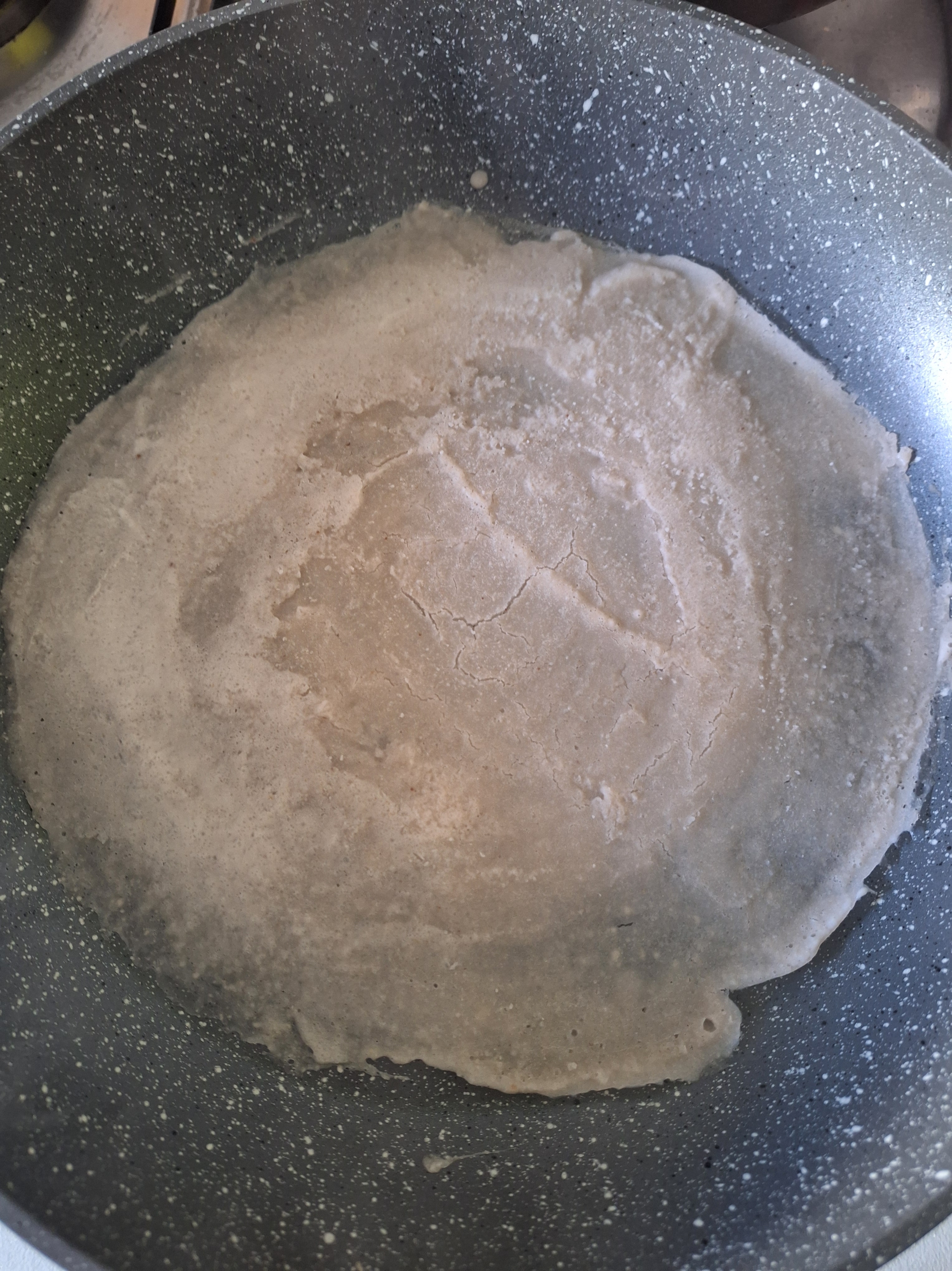 Añade sal a la masa fermentada y un poco de agua si es necesario. Engrasa una sartén antiadherente con un poco de aceite (con ayuda de papel de cocina) y calienta a fuego medio. Baja al mínimo y vierte una cucharada de masa, extendiendo con la base de la cuchara. Debe quedar una masa fina. Deja que se cocine hasta que se despeguen los bordes y engrasa con ayuda de una brocha de cocina.