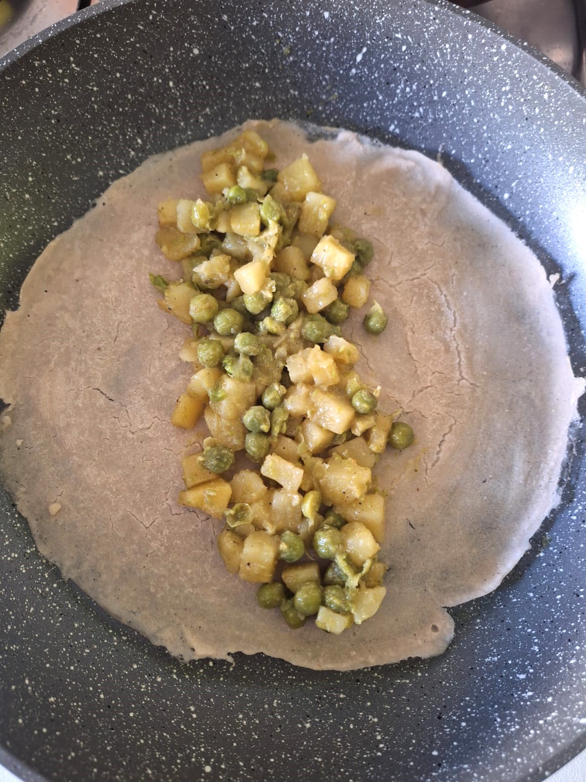El arroz y las lentejas se utilizan en crudo (salvo una parte de arroz que va cocida). Se deja fermentar y se obtiene una masa espesa similar a las natillas. El relleno utilizado es el mismo que le pongo a las samosas: guisantes, patatas y una selección de especias que le aportan un sabor delicioso y tan típico de la India.