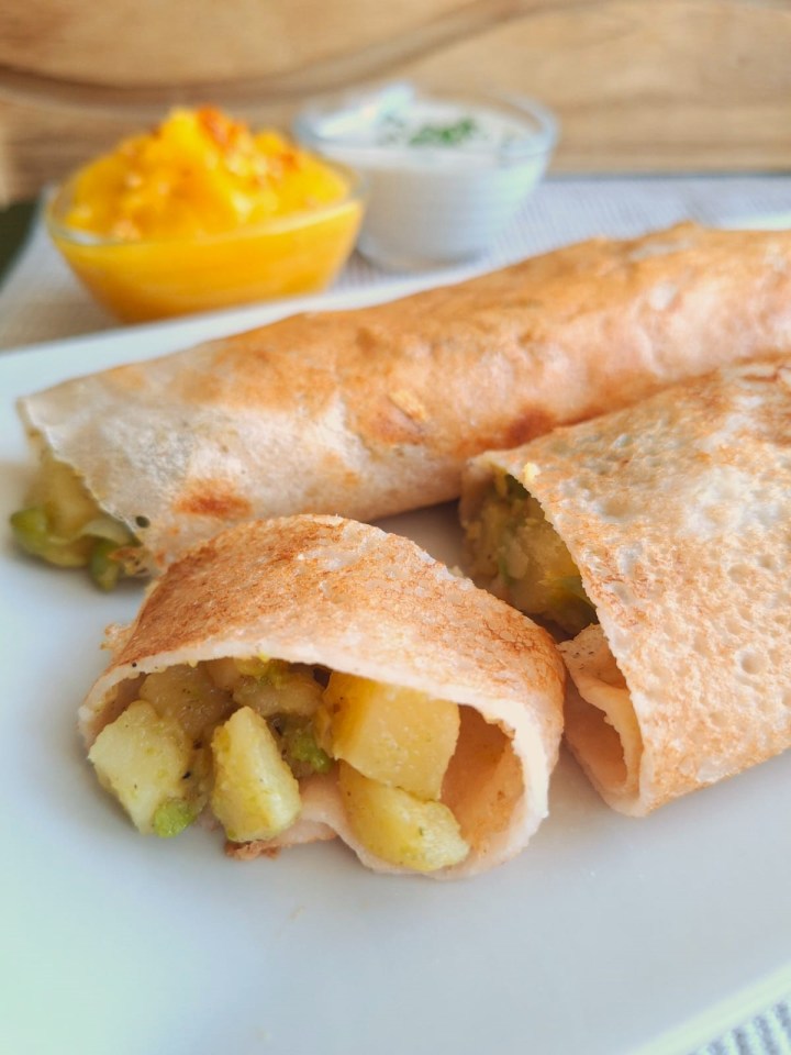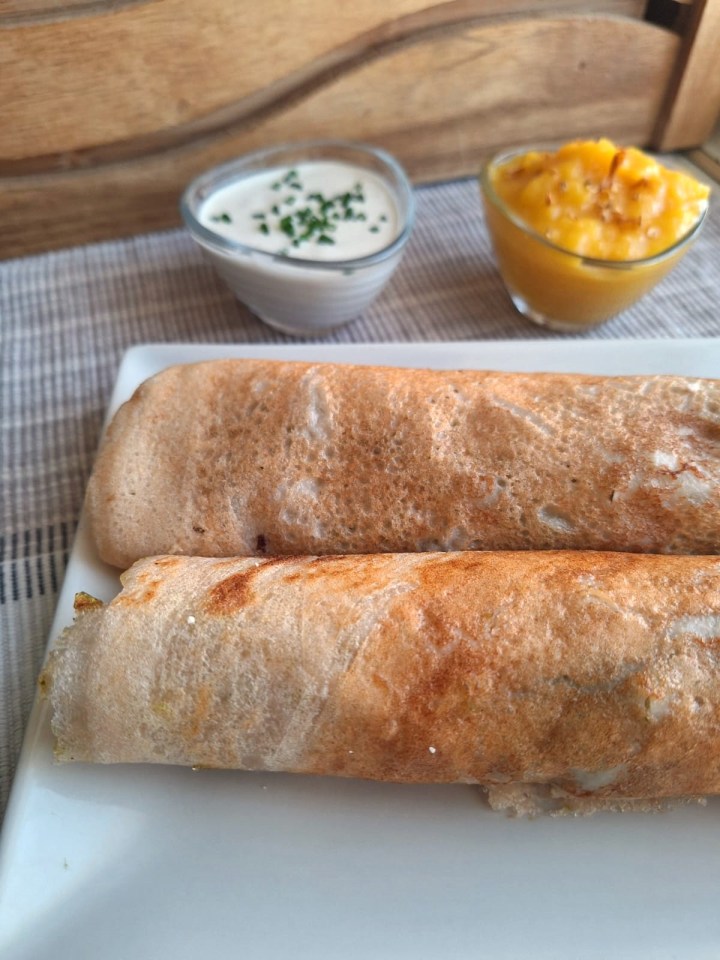 Aunque a simple vista podéis pensar que son unas simples crepes, estáis equivocados, ya que están elaboradas con arroz y lentejas fermentadas. Esta crepe tan original se llama masala dosa y es un plato típico de la cocina india, que me encanta por su enorme variedad de recetas veganas y vegetarianas.