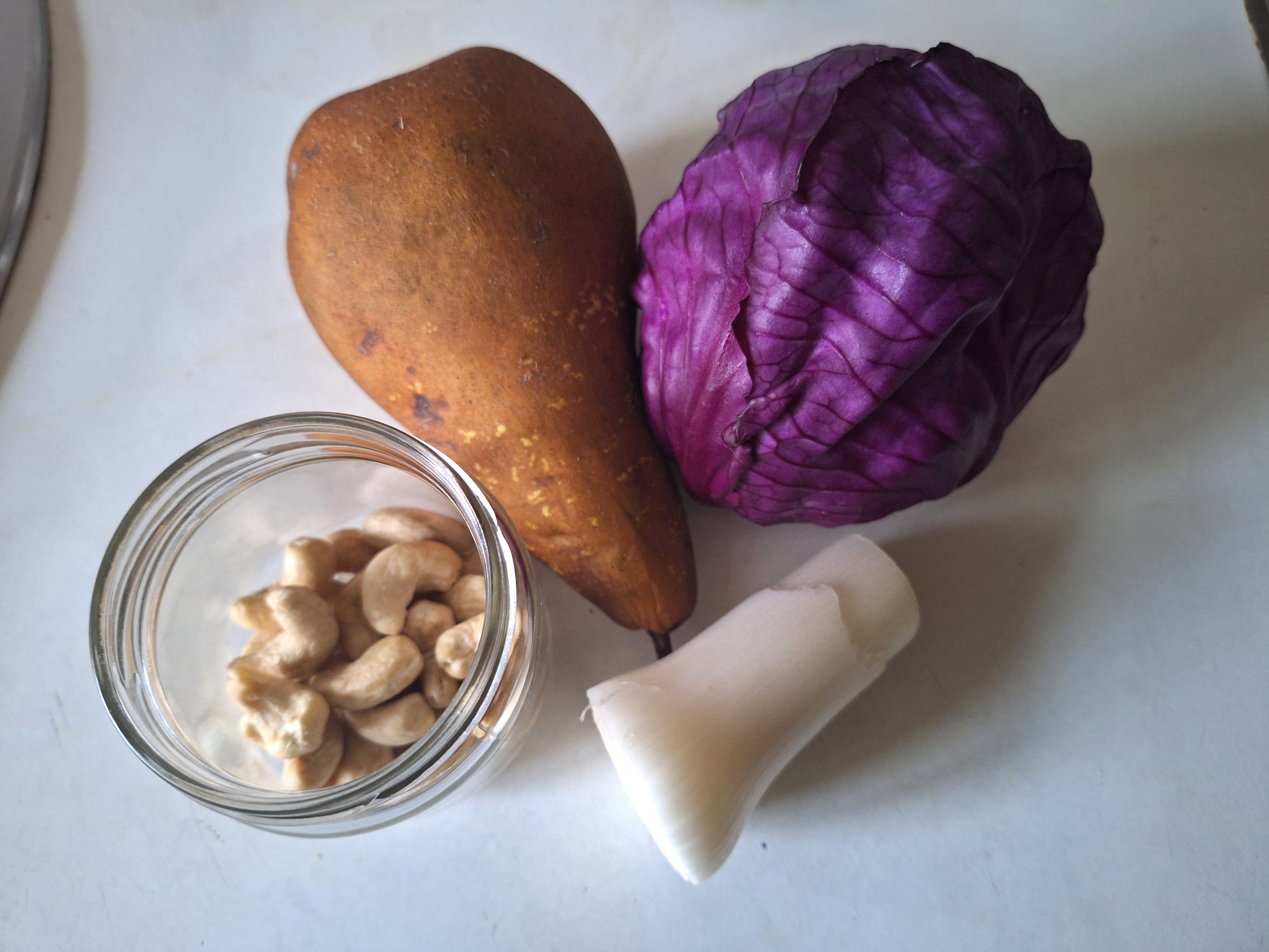 El color morado simboliza la lucha feminista, así que la receta de hoy no podía ser de otro color (aunque en este caso se ve más azulada que morada). He decidido hacer una receta muy sencilla, una crema de lombarda y pera. El color es realmente precioso y la pera le da un punto de sabor increíble. Además, lleva un puñado de anacardos, que aporta proteínas y grasas saludables.