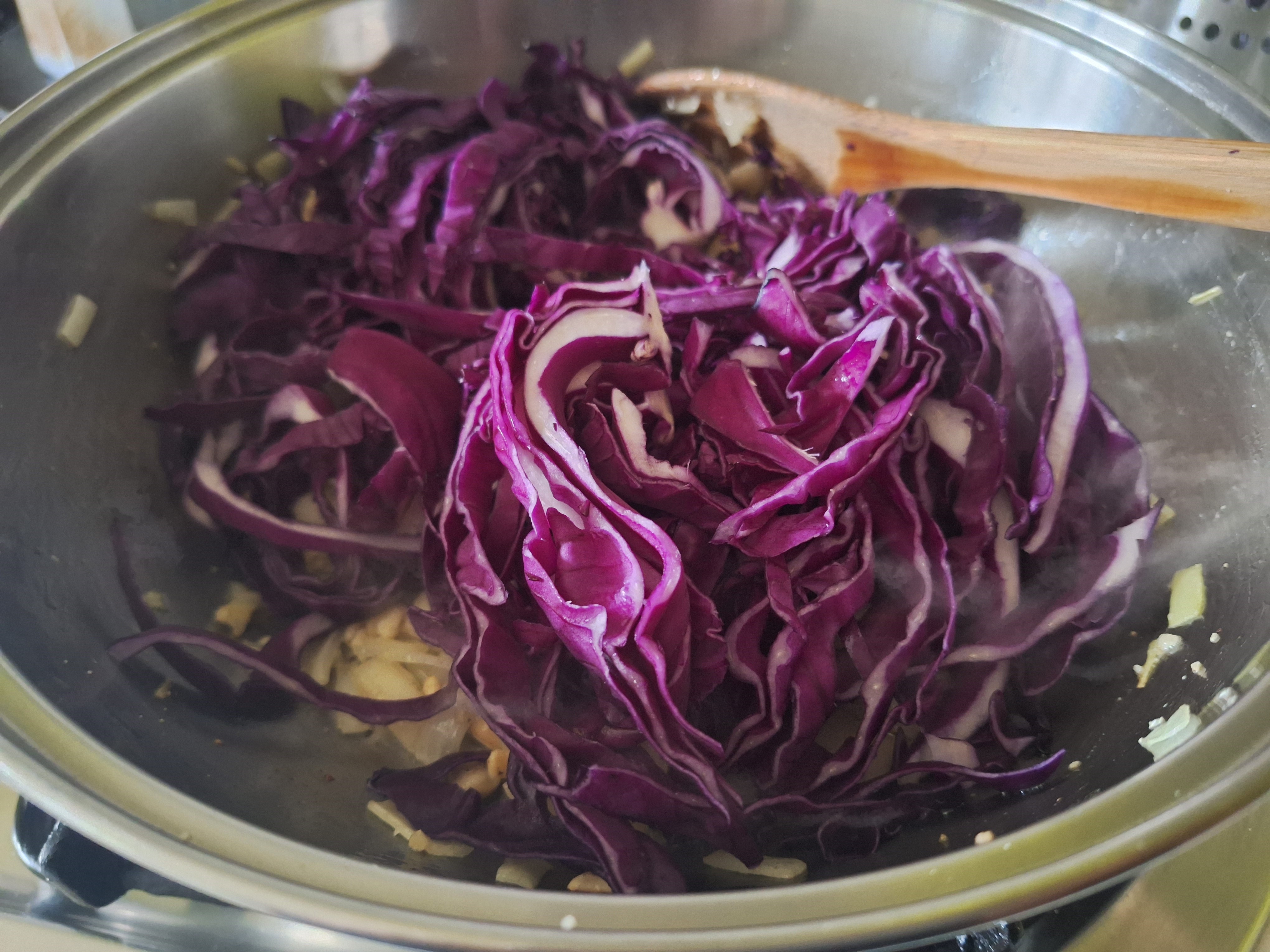 Calienta un poco de aceite de oliva y pocha el puerro. Tras unos minutos agrega la pera, los anacardos y la lombarda. Salpimenta y cocina durante unos 5 minutos. Agrega el caldo y la cucharadita de vinagre y cuece hasta que la lombarda esté blandita.