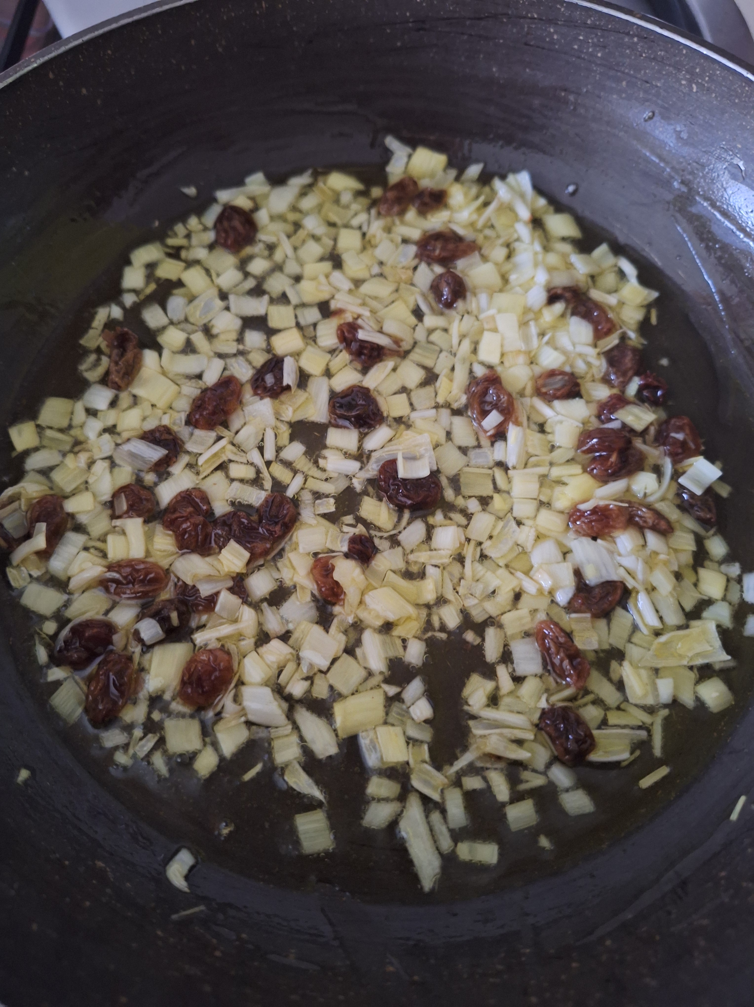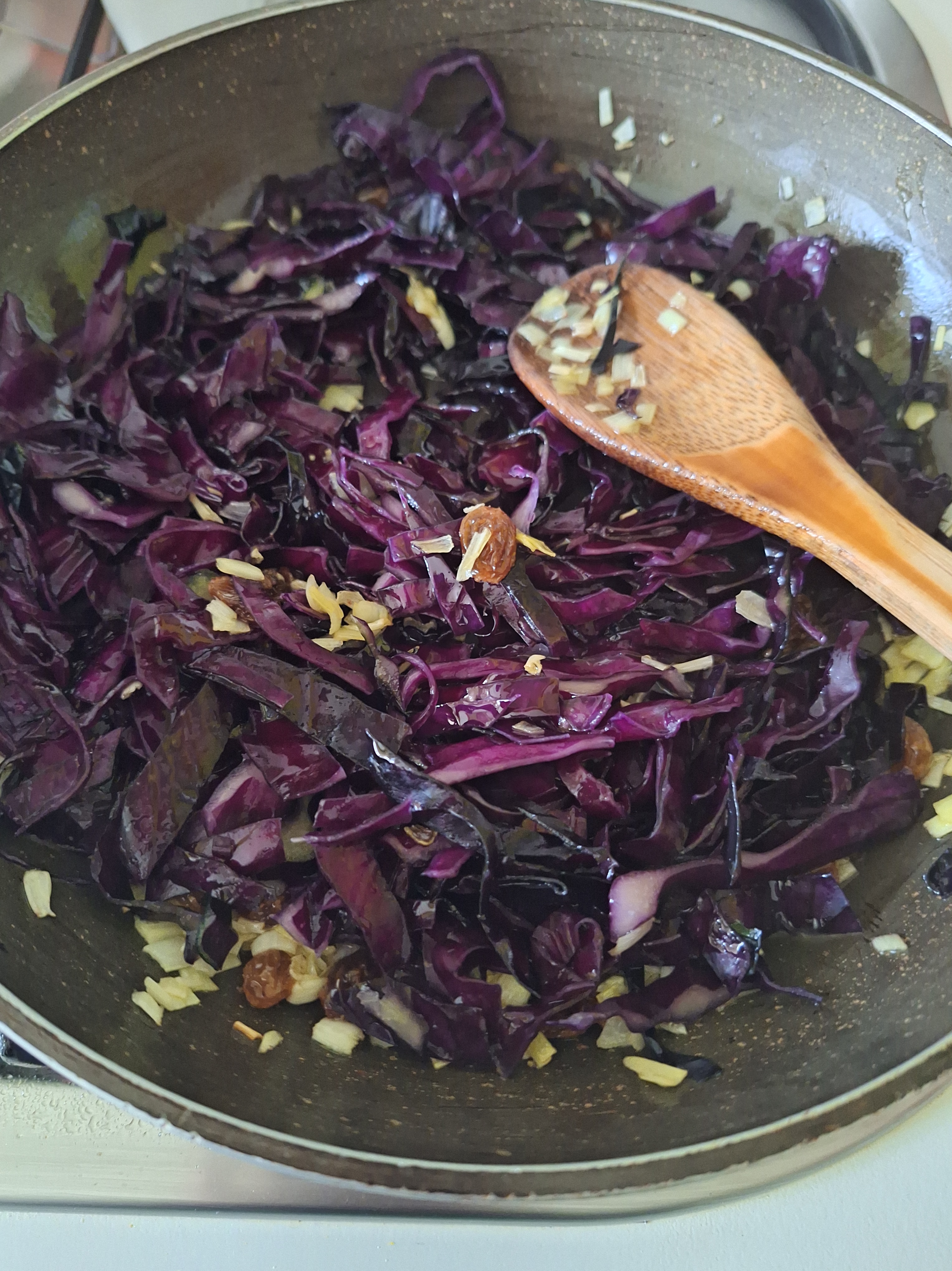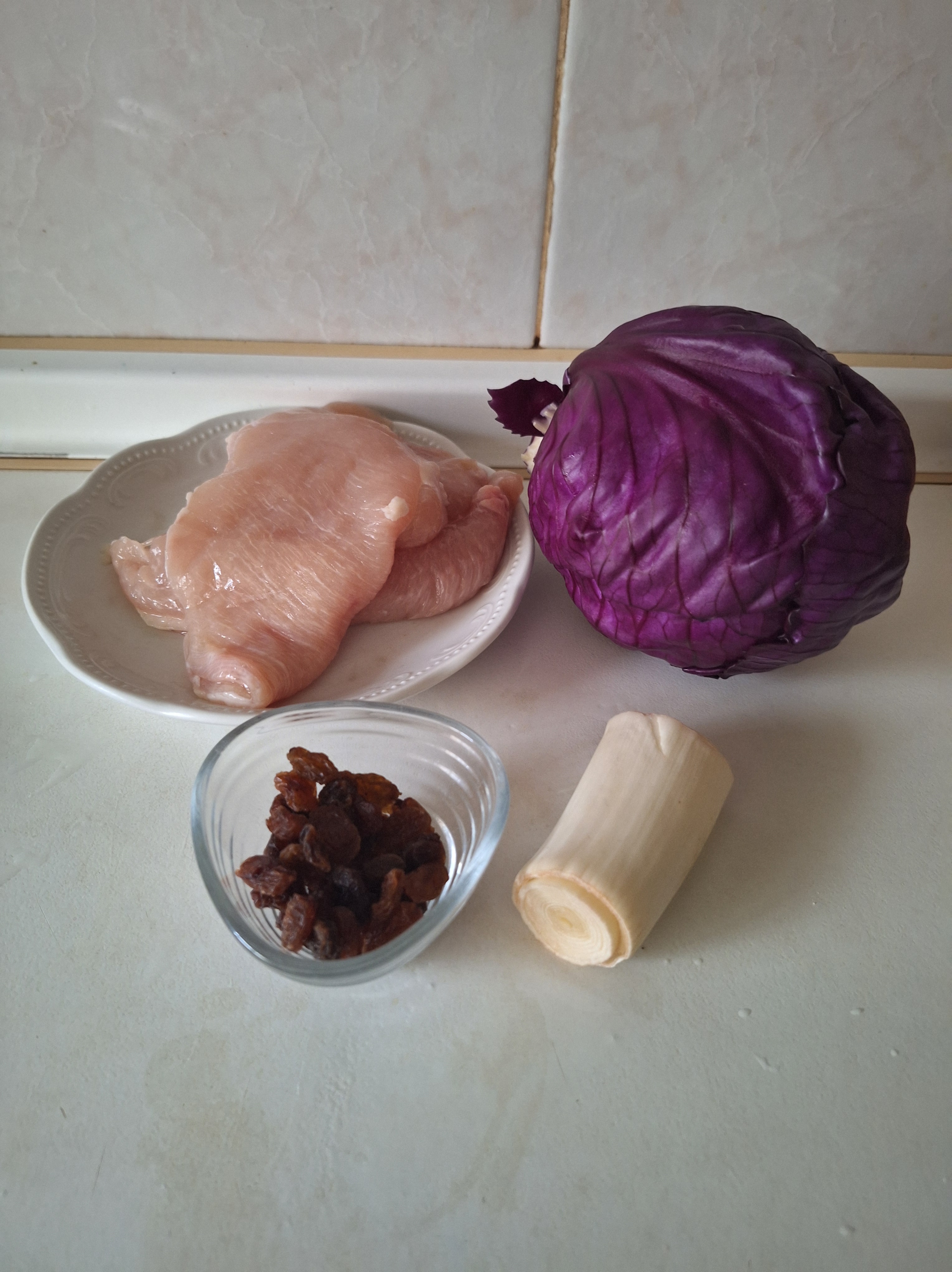 En la misma sartén del pollo pocha el puerro y, cuando empiece a transparentar, añade las pasas escurridas y la lombarda. Cocina unos minutos a fuego medio bajo hasta que quede blandita. Finalmente añade el pollo y la maicena disuelta en la bebida vegetal, mezcla bien y, cuando empiece a espesar, retira del fuego.