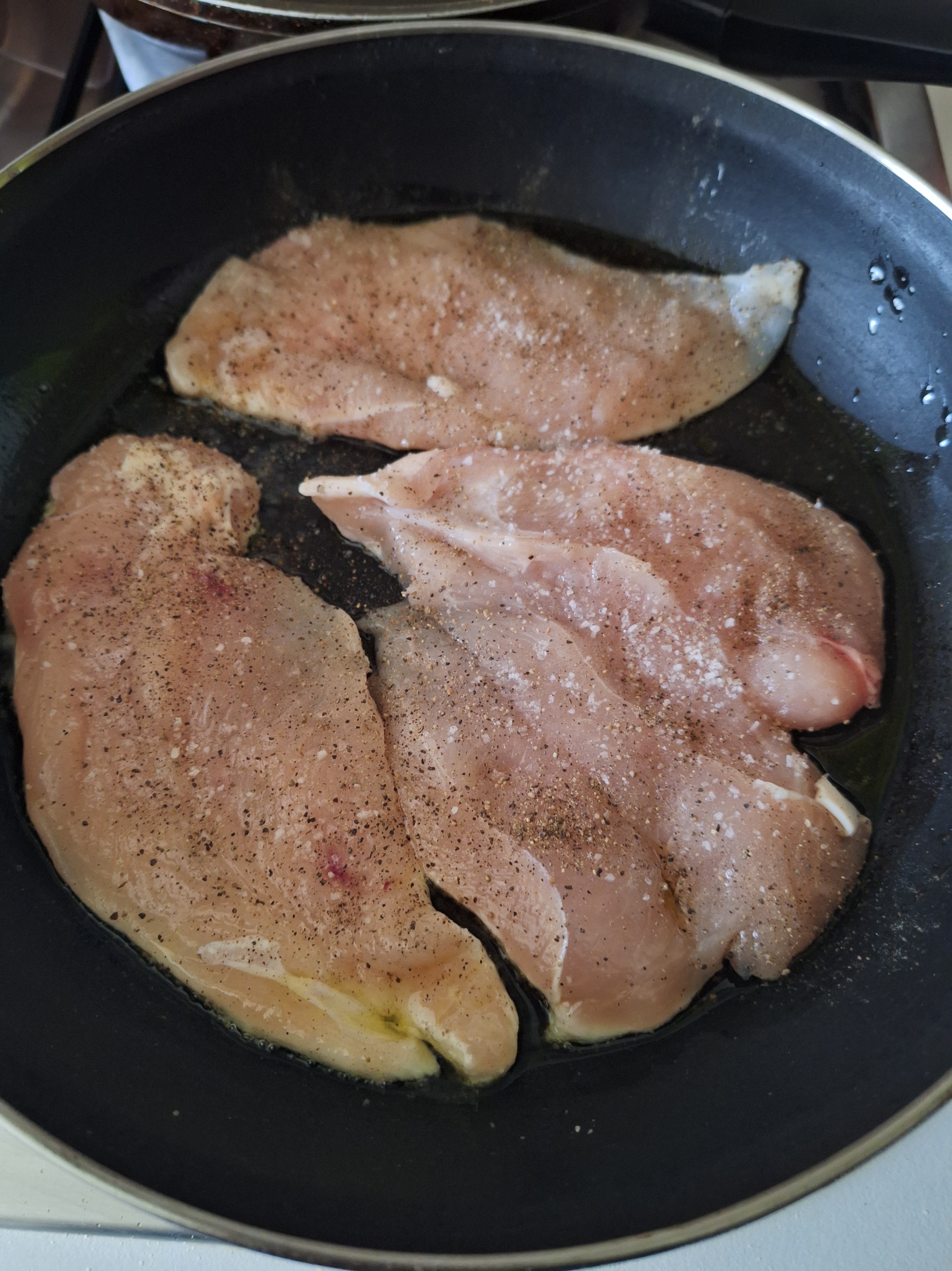 Mientras tanto prepara el relleno. Salpimienta las pechugas de pollo y dora en una sartén. Deja atemperar y deshilacha con los dedos. Reserva.