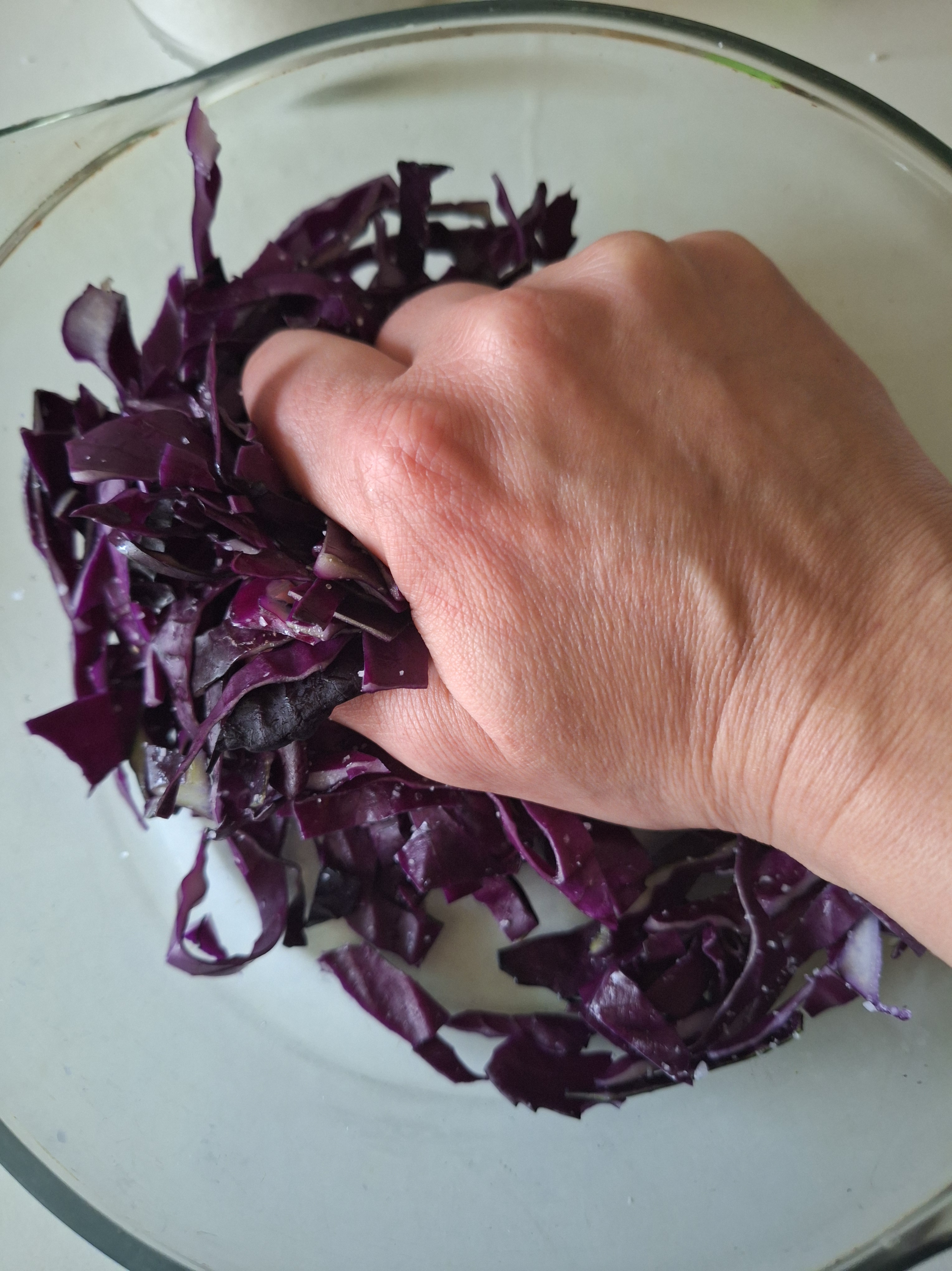 Hidrata las pasas en agua templada durante unos 15 minutos. Limpia el puerro y pica en brunoise, lava la lombarda y corta en tiras finas. Coloca la lombarda en un recipiente con un poco de sal y estruja con las manos para que se ablande.