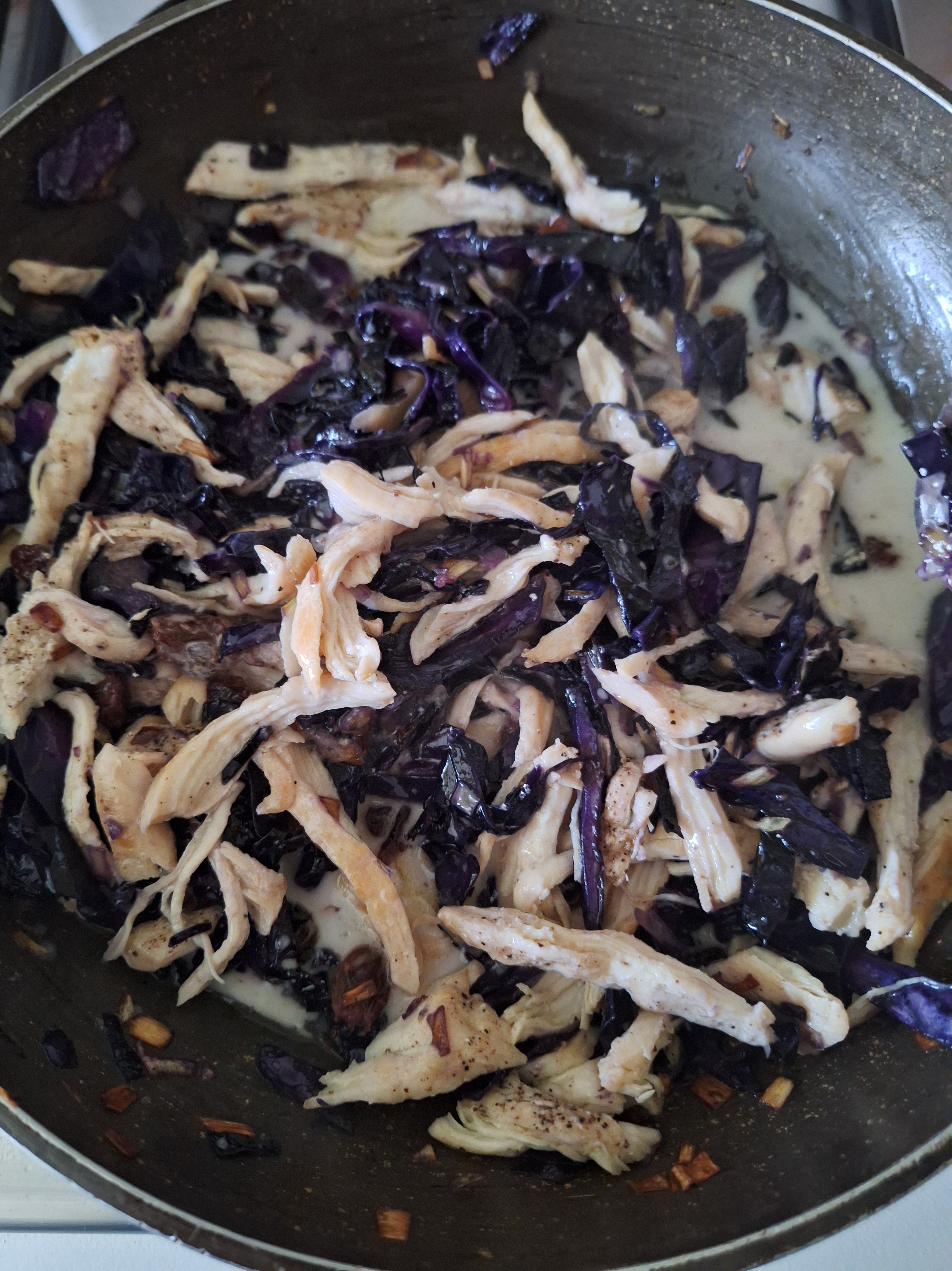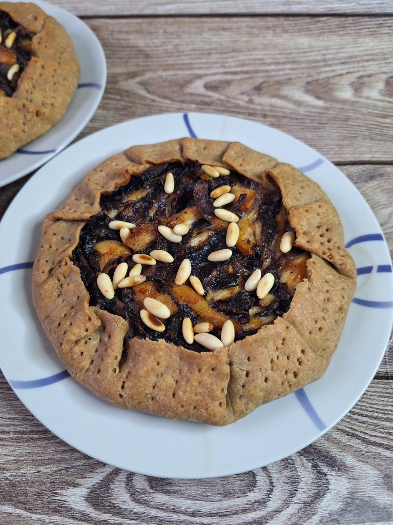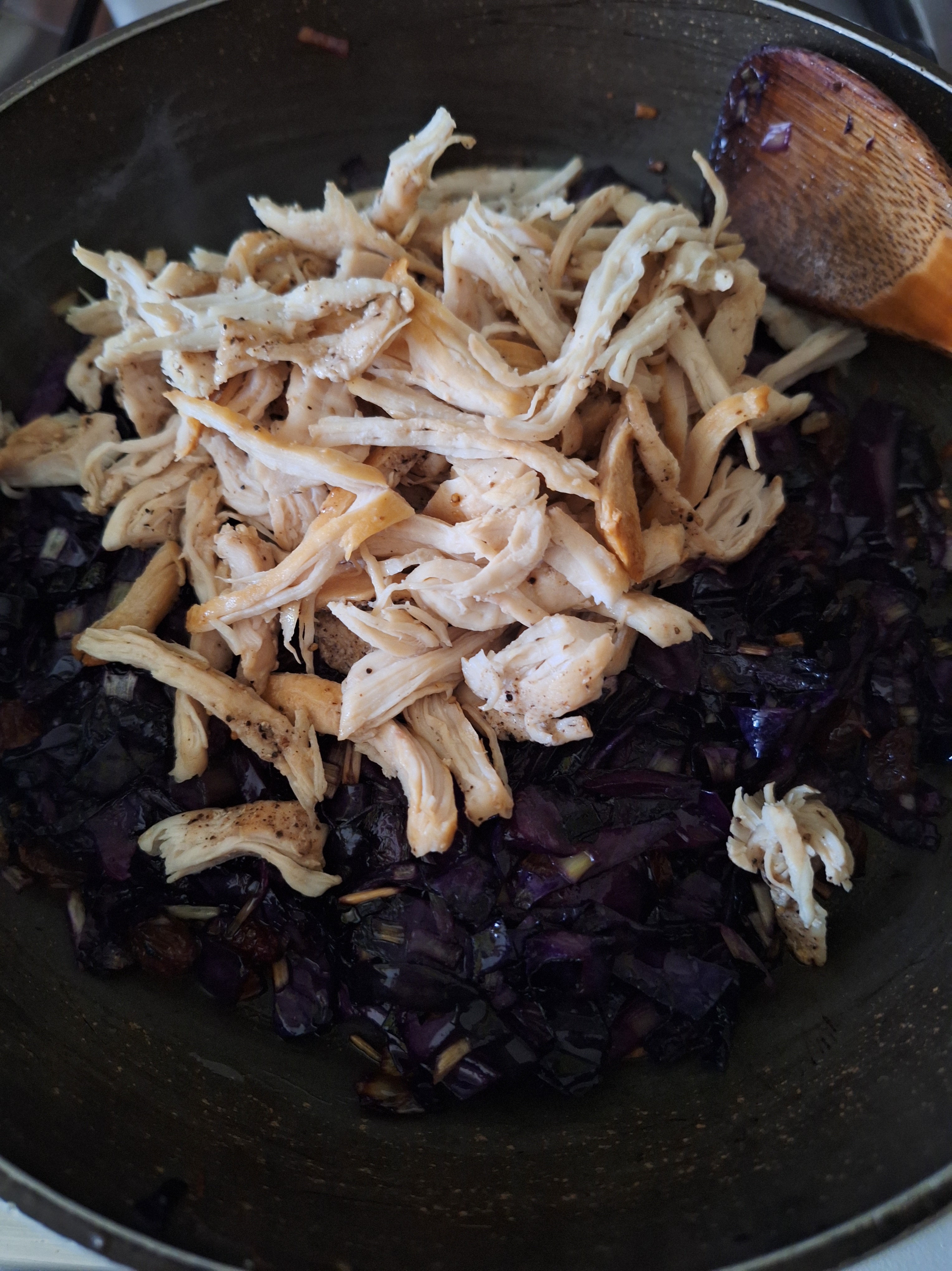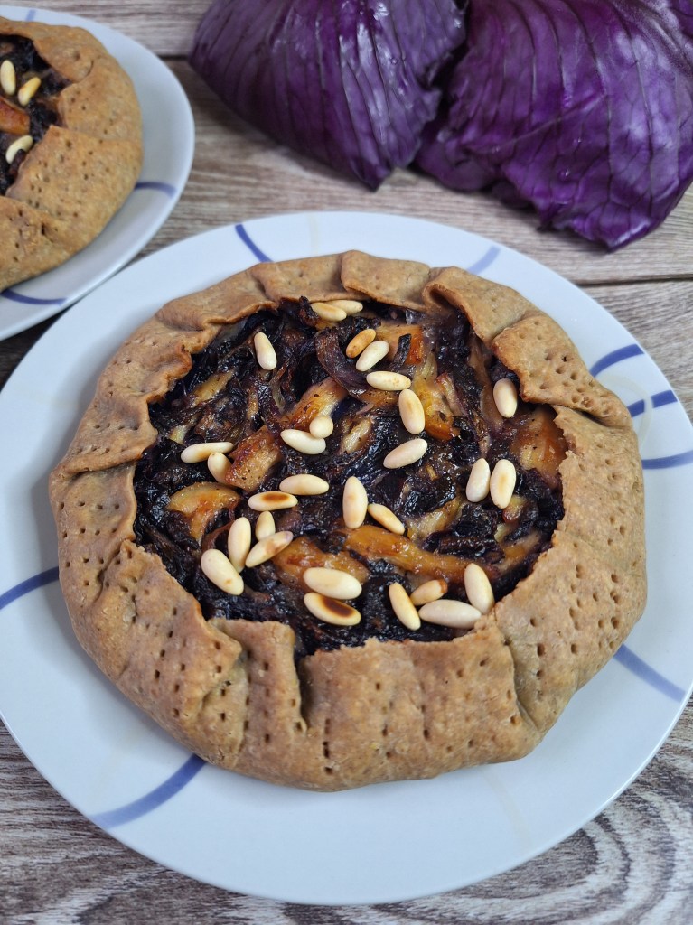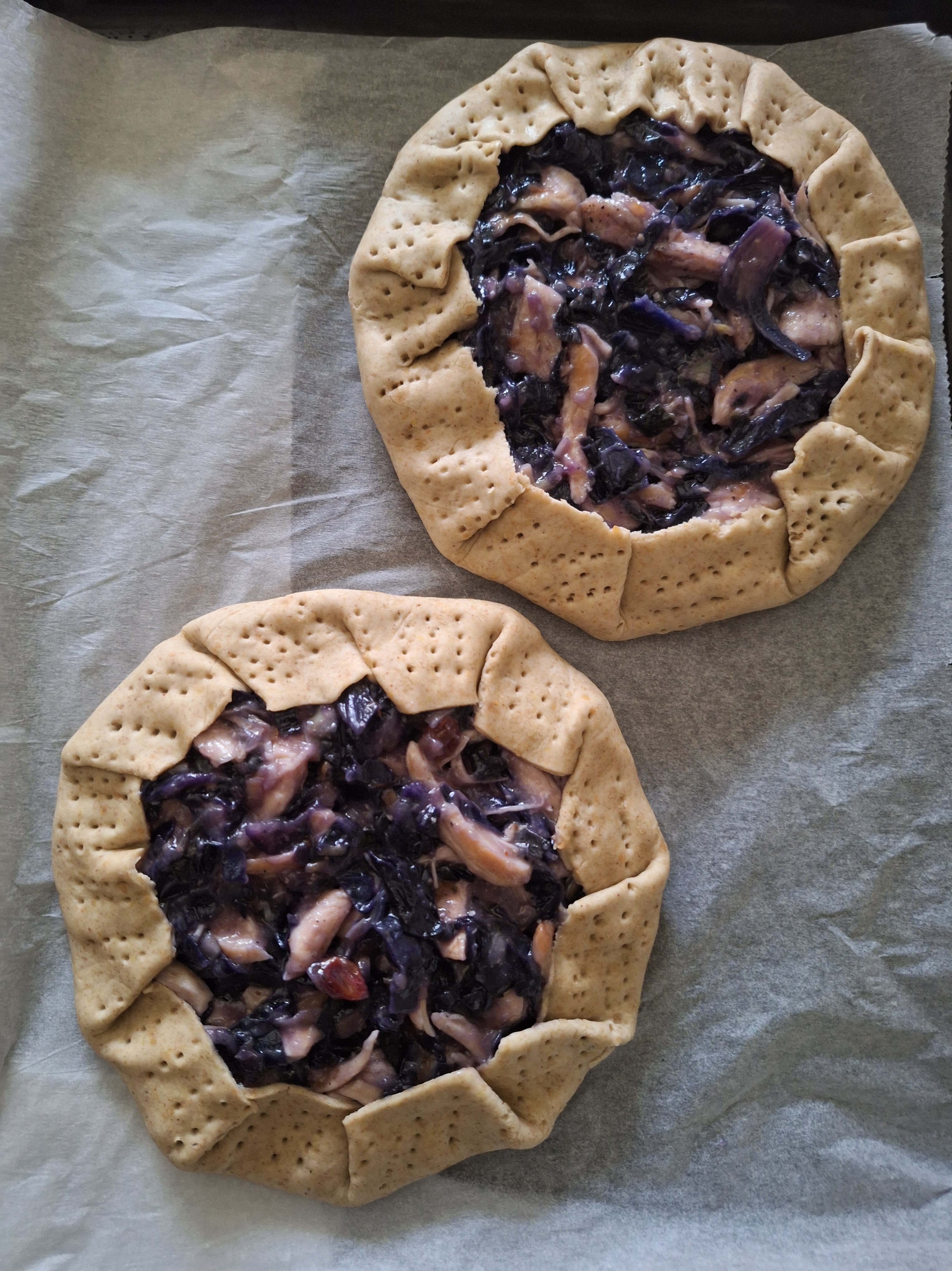 Como ya sabéis mi madre tiene un huerto increíble en el que siembra de todo y, cada vez que voy al pueblo, regreso cargada de buenos alimentos, frescos y de calidad. Tenía una lombarda y quería hacer algo con ella y una de las combinaciones que más me gusta y que siempre utilizo es lombarda con pasas y piñones. Decidí esta vez darle un giro de tuerca y añadirle un poco de pechuga de pollo y hacerlo en formato masa, dos galettes pequeñas para tomar invididuales.