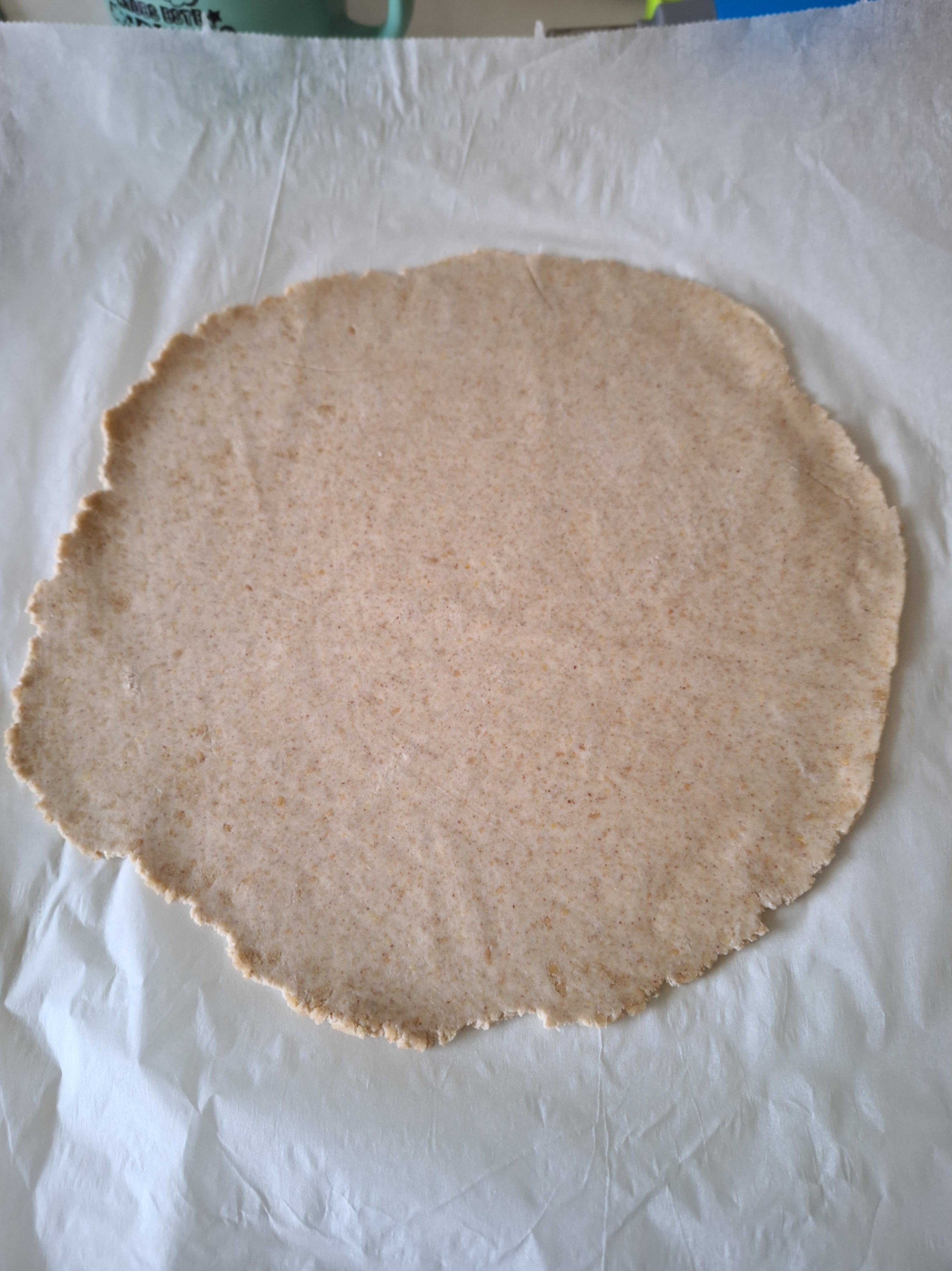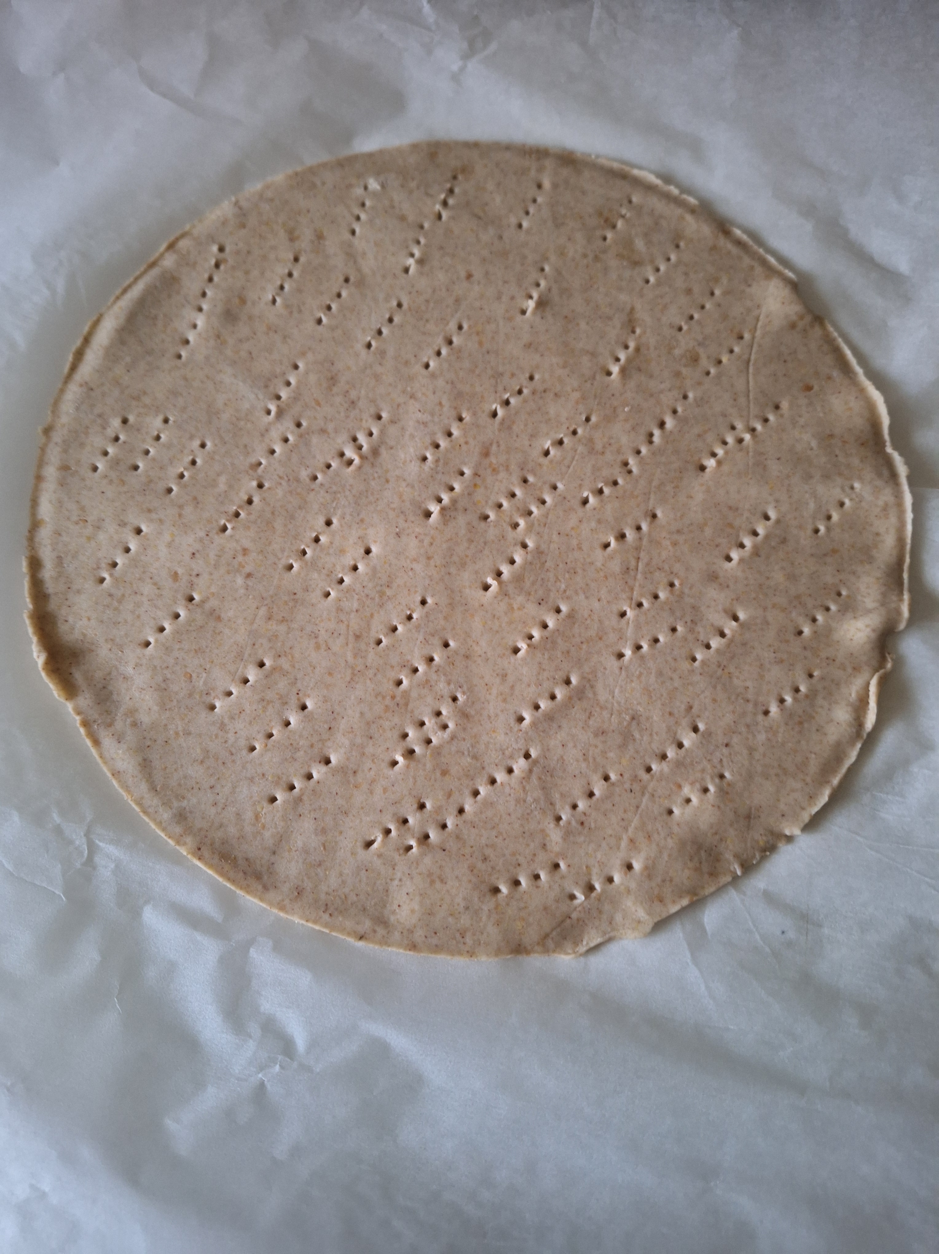 Precalienta el horno a 180ºC. Coloca entre papel vegetal y estira con un rodillo hasta dejar un grosor fino. Marca un círculo en el centro (pincha con un tenedor), dejando unos 3mm en el borde.