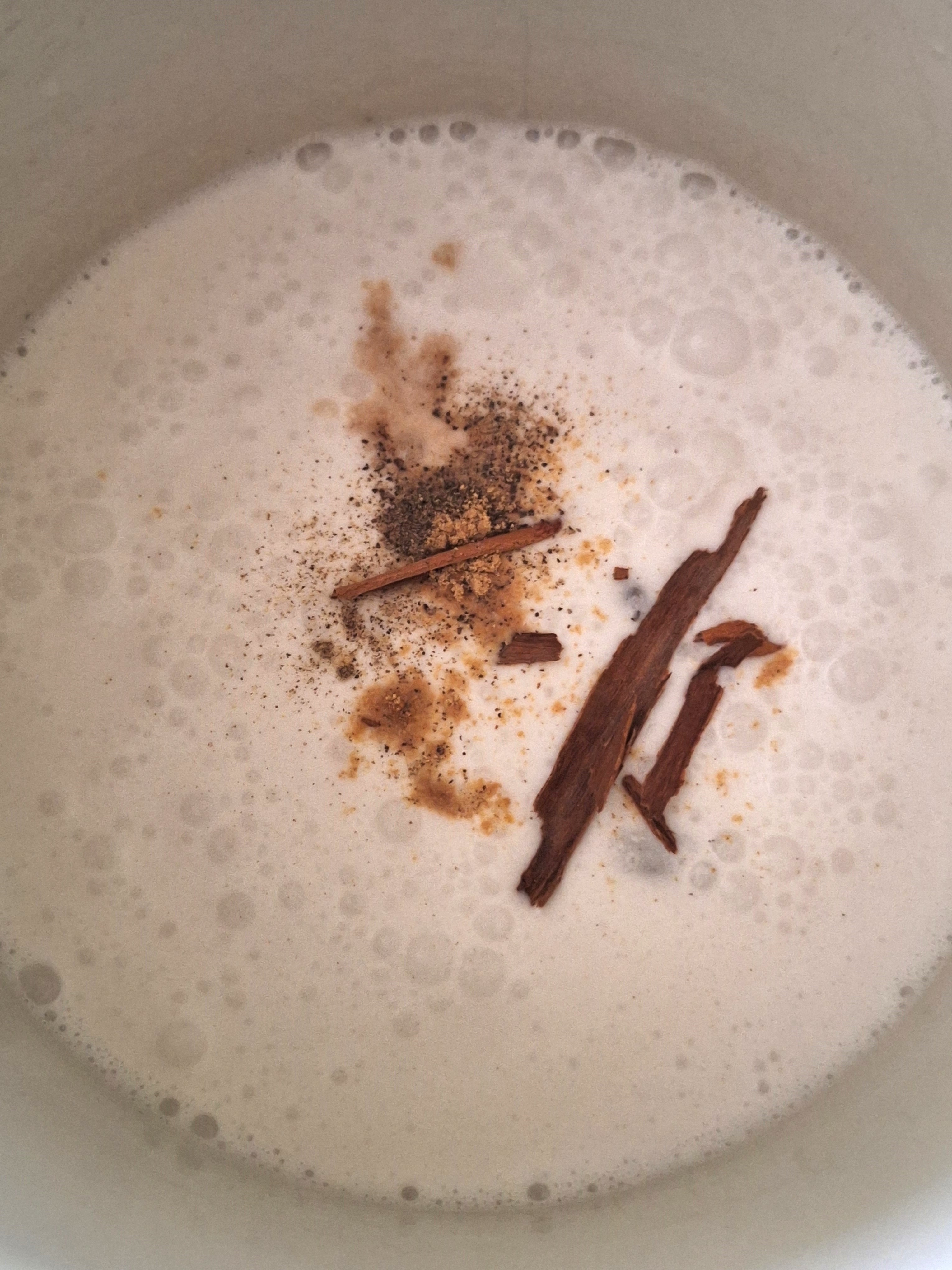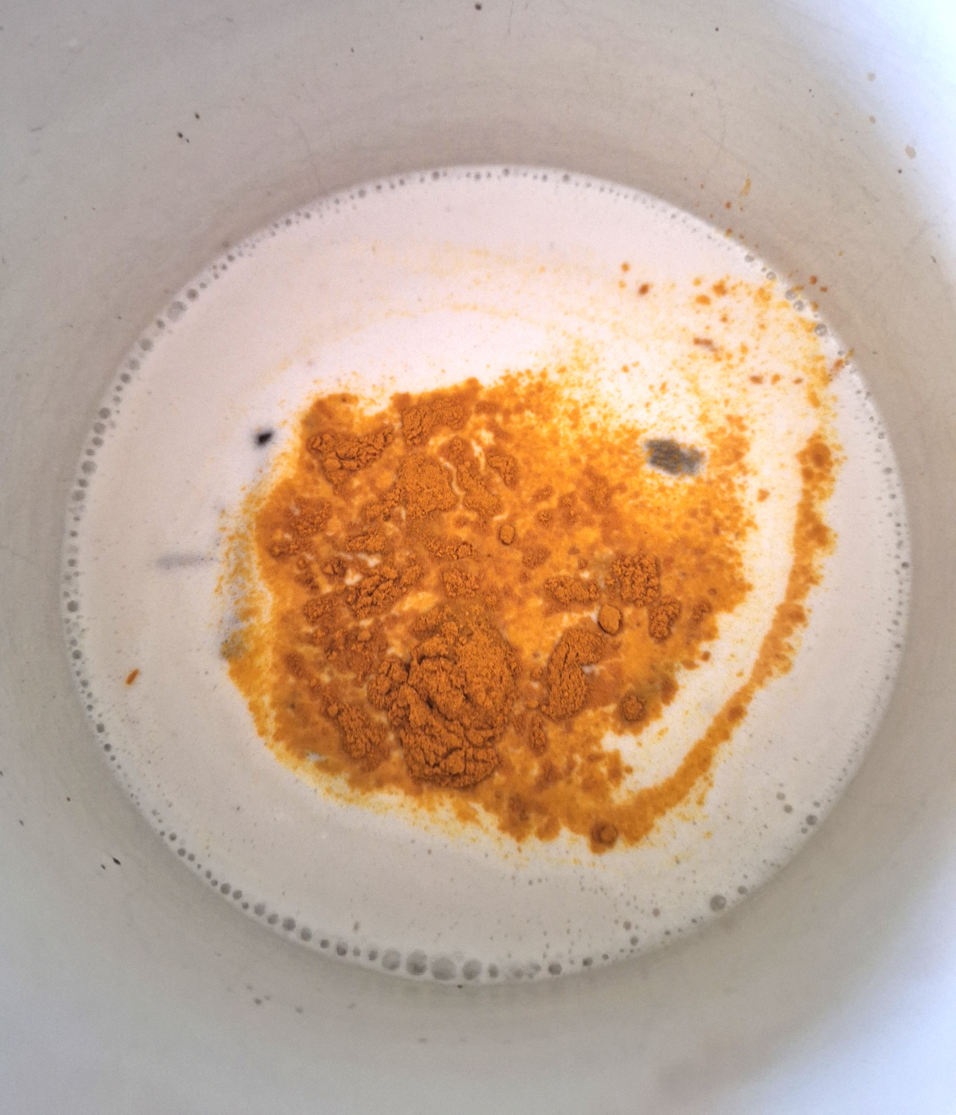 Calienta el resto de la crema junto con la canela en rama y las especias, menos la cúrcuma. Antes de que empiece a hervir, agrega la cúrcuma y mezcla bien. Cuando hierva retira del fuego, cubre con una tapadera y deja infusionar unos 10-15 minutos. Cuela, añade el agave y mezcla bien.