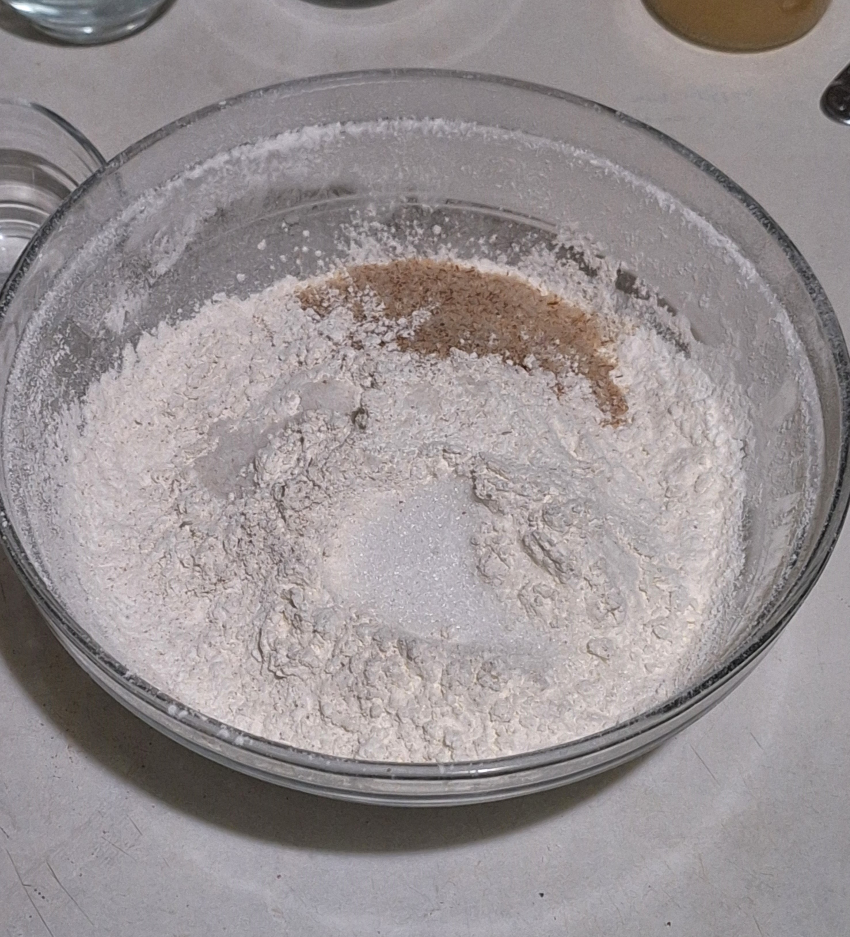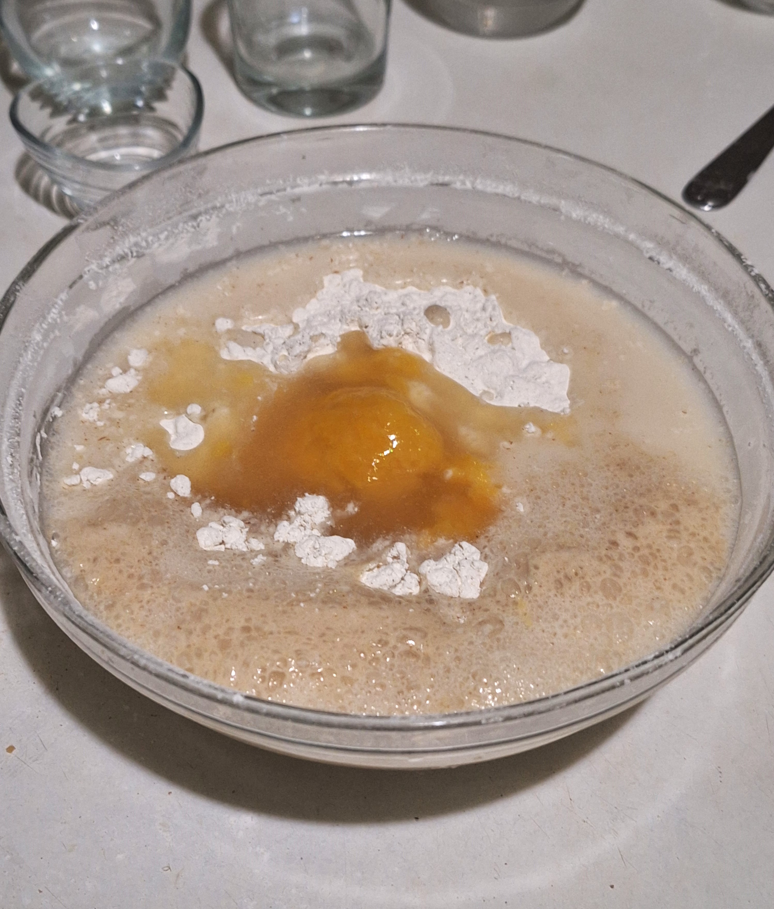 Disuelve la levadura en agua tibia y añade el eritritol y la harina de sorgo. Mezcla bien, cubre y deja fermentar hasta doblar volumen.