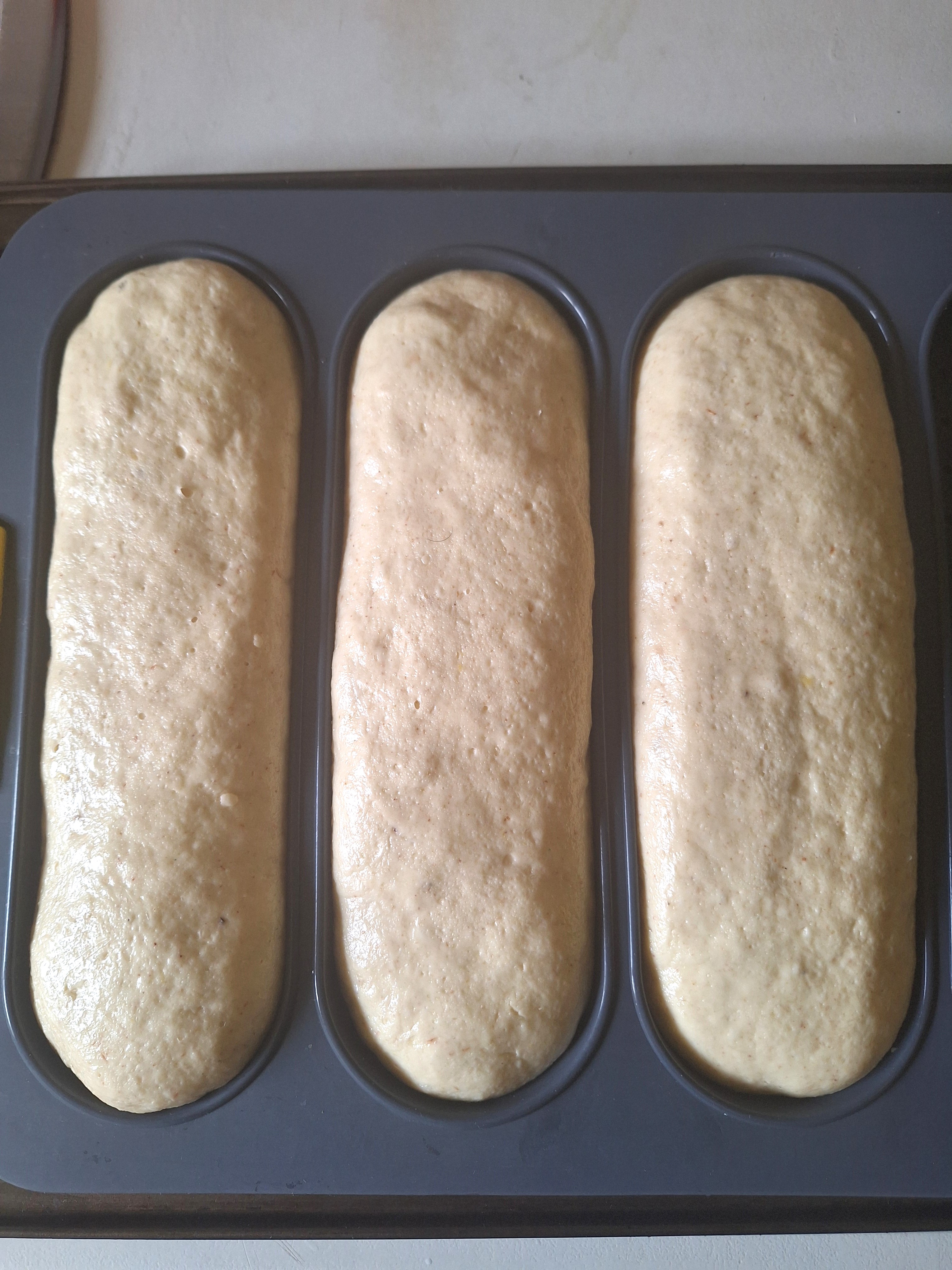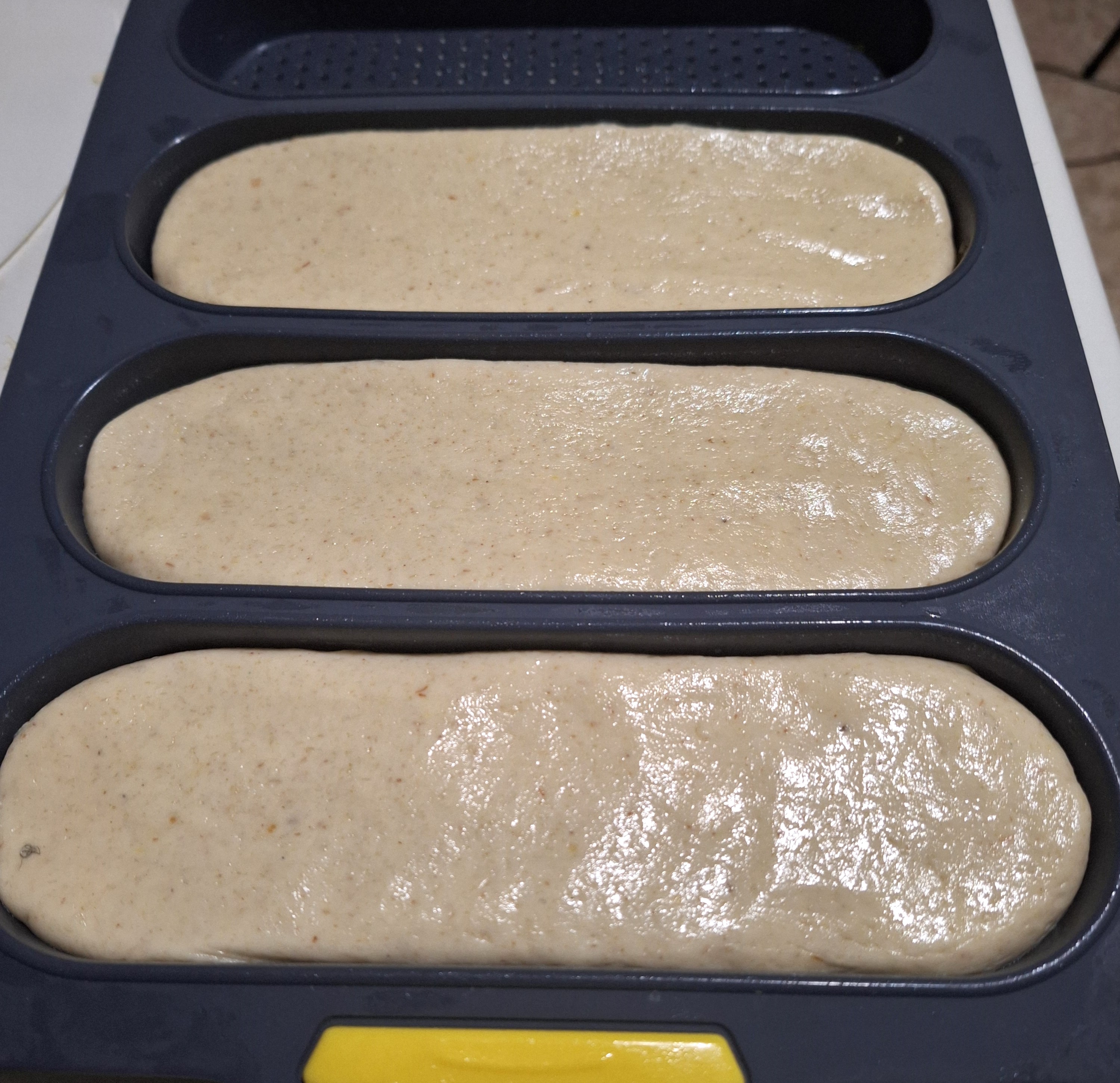 Añade la goma xantana con cuidado. Vuelca la masa a la superficie de trabajo y amasa unos 10-15 minutos. Engrasa la espátula y tus manos y haz una bola. Divide en 3 porciones de igual tamaño y bolea. Estira cada una de ellas haciendo un cilindro y coloca en el molde. Haz lo mismo con el resto de porciones. Cubre con film y deja reposar en lugar cálido hasta que doble volumen (también puedes dejarla fermentar en frío en el frigo toda la noche).