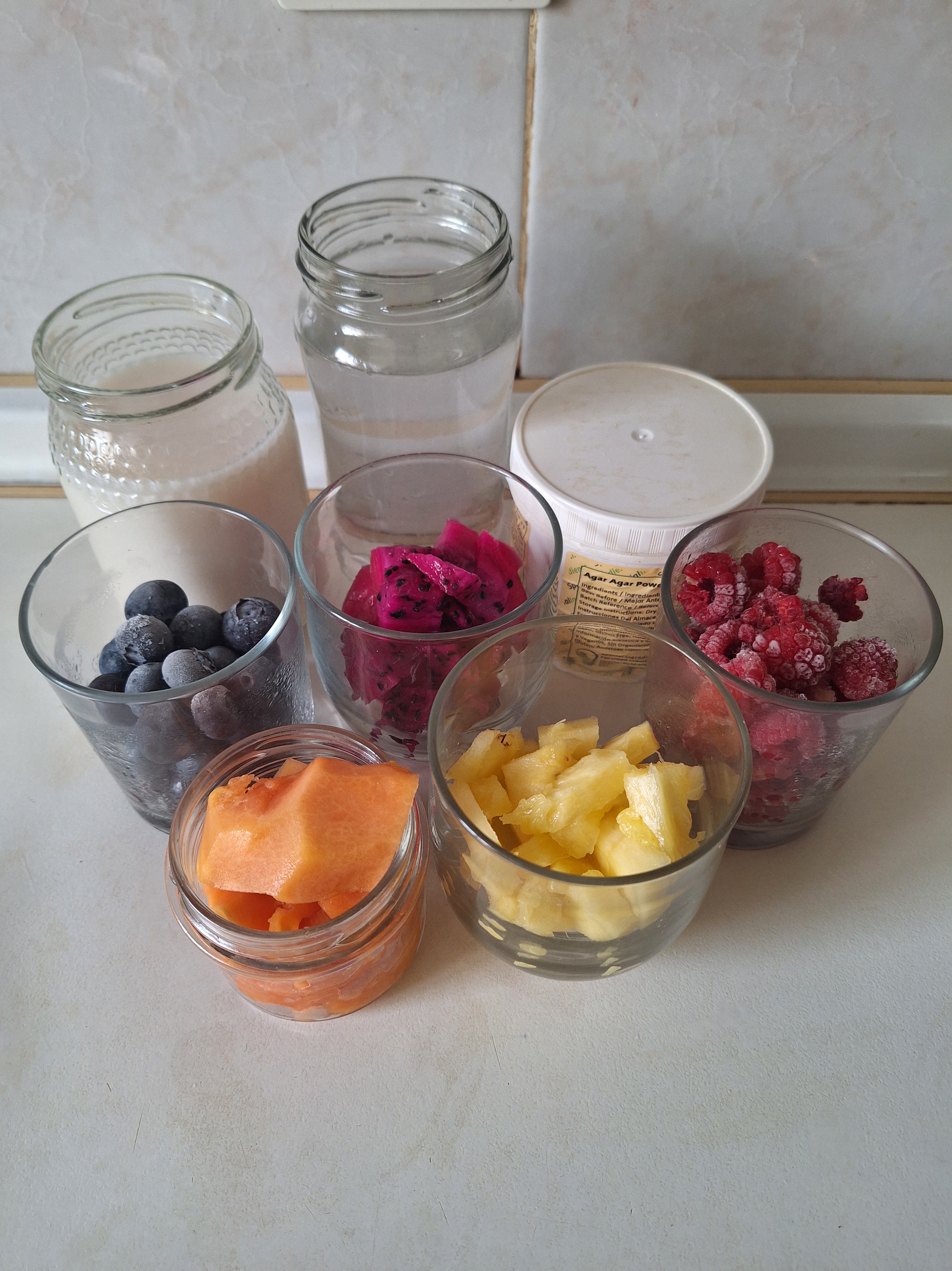 En este caso he utilizado piña, arándanos, frambuesas, pitahaya y papaya, pero podéis utilizar las que más os gusten (con naranja y limón deben quedar riquísimas, pero no puedo tomar cítricos). Trituráis la fruta con un poco de agua de la receta, coláis para retirar pieles y pepitas y cocináis.