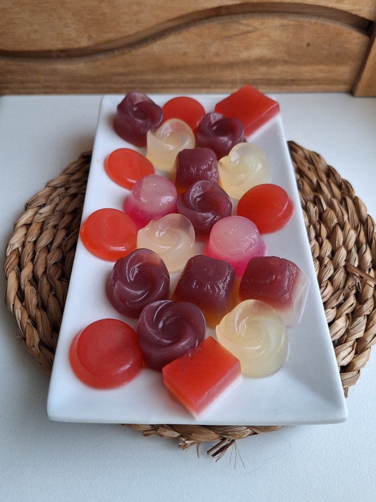 Si queréis utilizar gelatina os recuerdo que la proporción es de 1 gr de agar agar = 3 hojas de gelatina, así que en esta receta tenéis que utilizar 12 hojas de gelatina por cada fruta. También cambia el procedimiento: la gelatina se hidrata en agua fría y luego se escurre y el agar agar necesita altas temperaturas para disolverse y luego se deja enfriar.