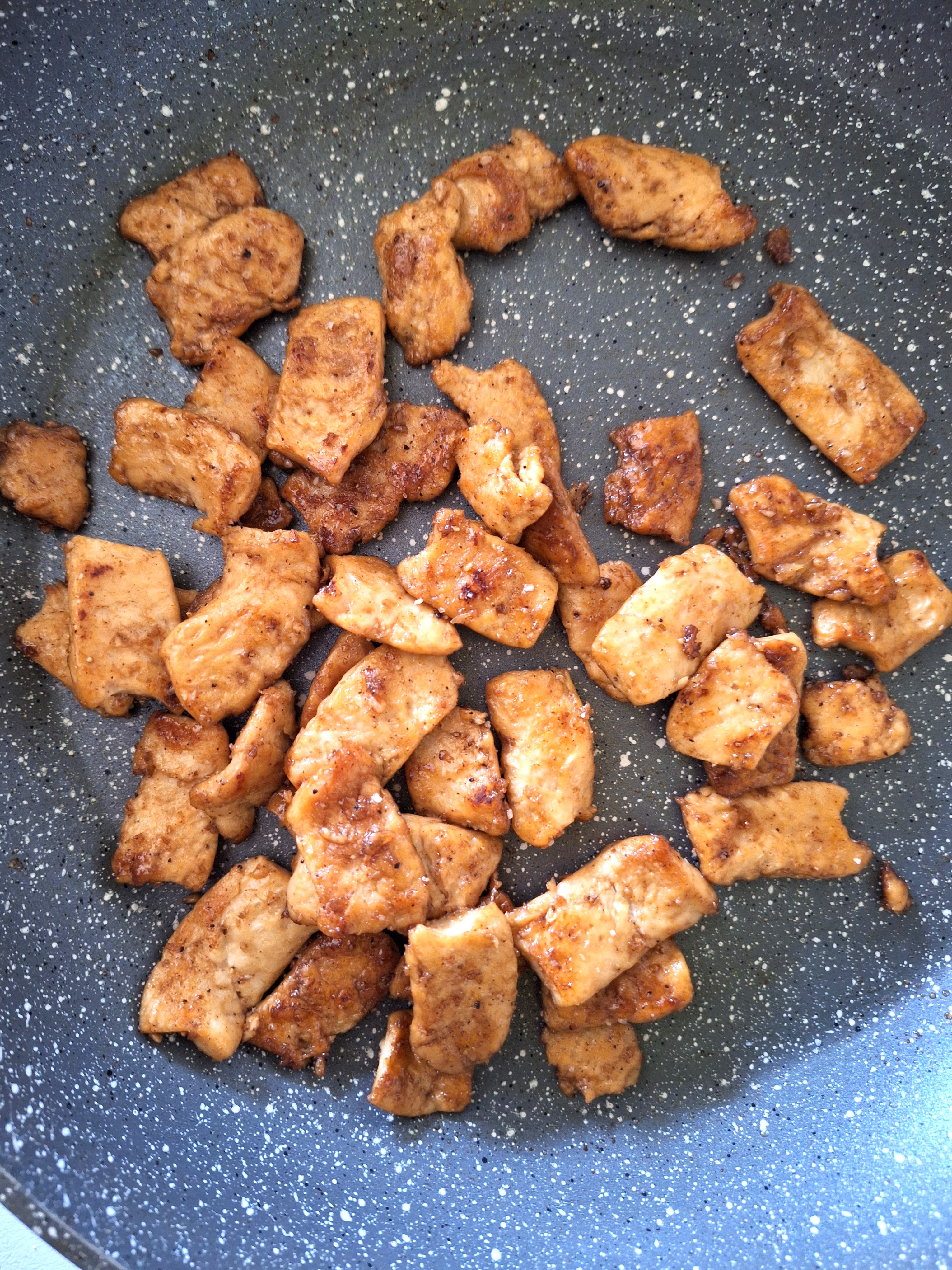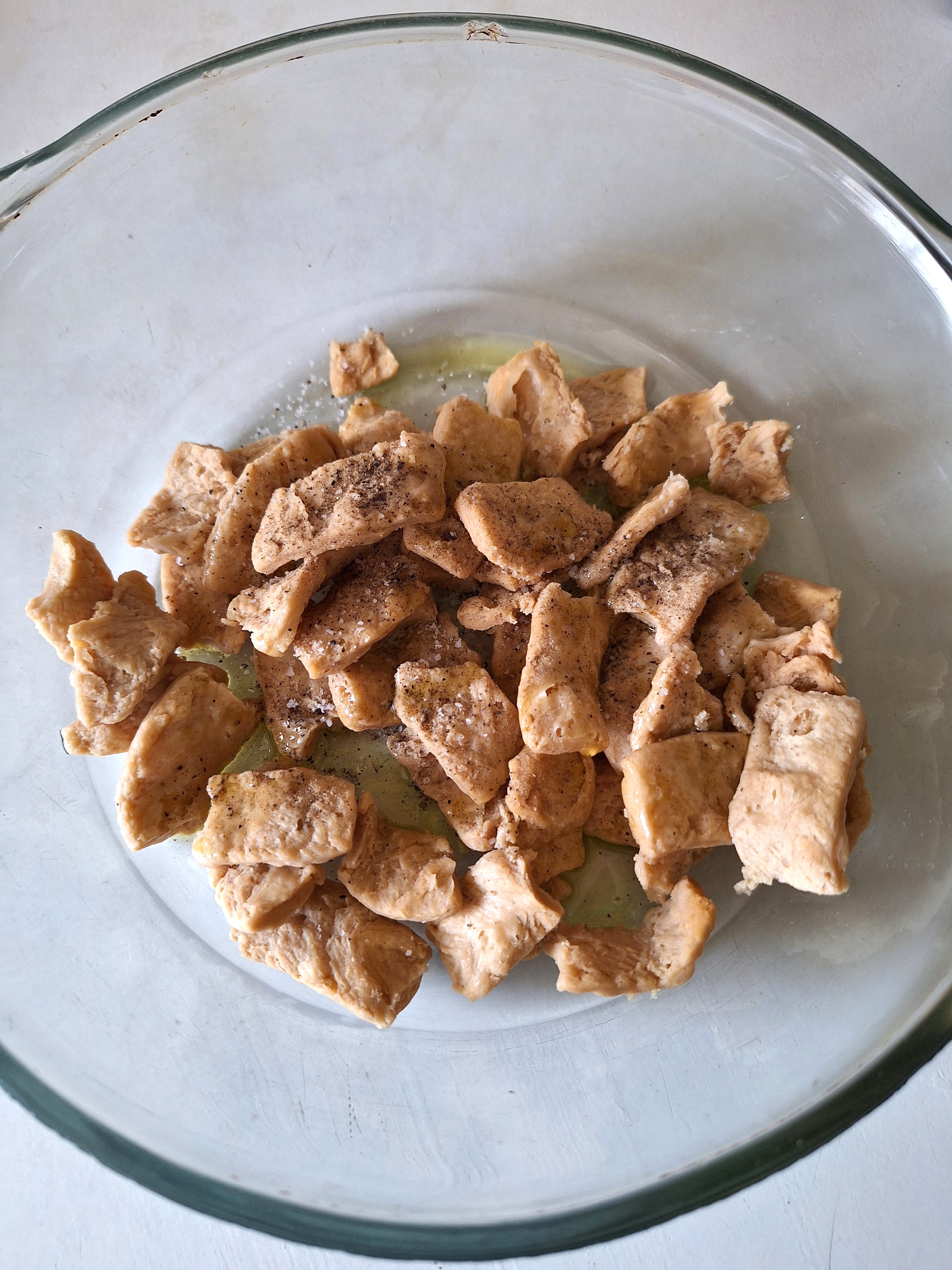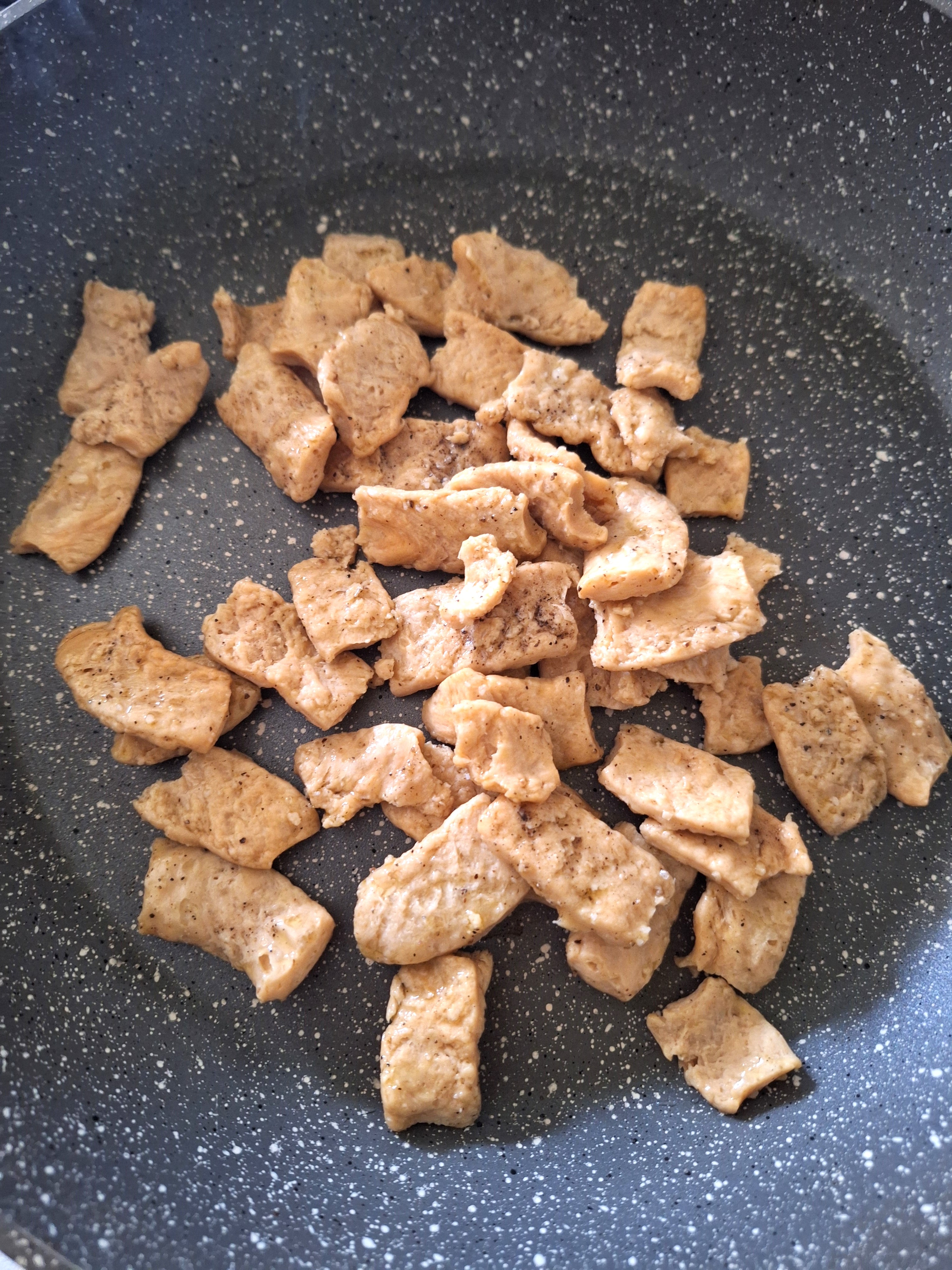 Hidrata la proteína de haba en agua hirviendo durante unos 5 minutos. Escurre, aliña con pimienta negra y sal y dora en un poquito de aceite (puedes añadirle un poco de pimentón y aminos de coco si quieres para darle un poquito más de sabor).
