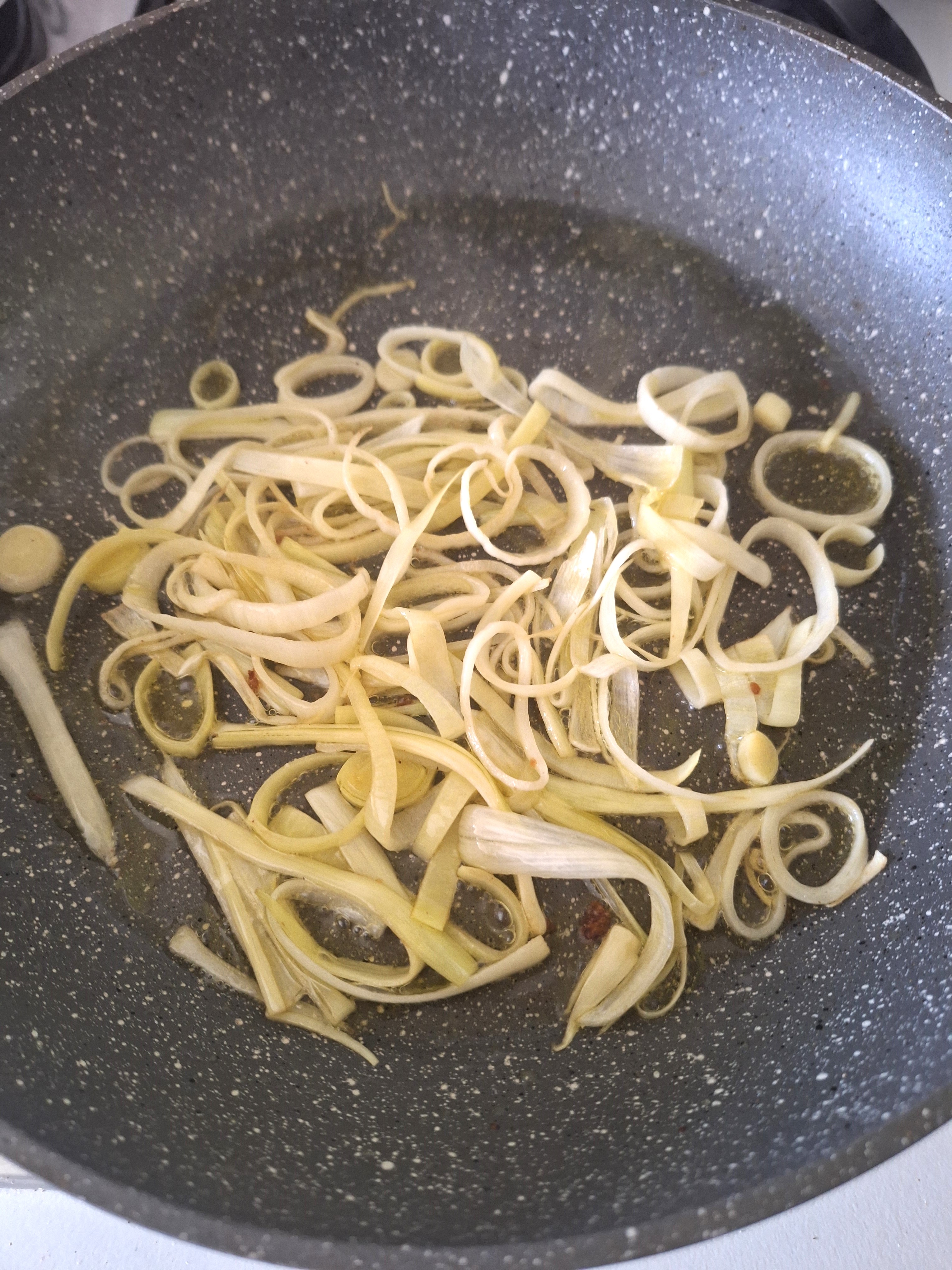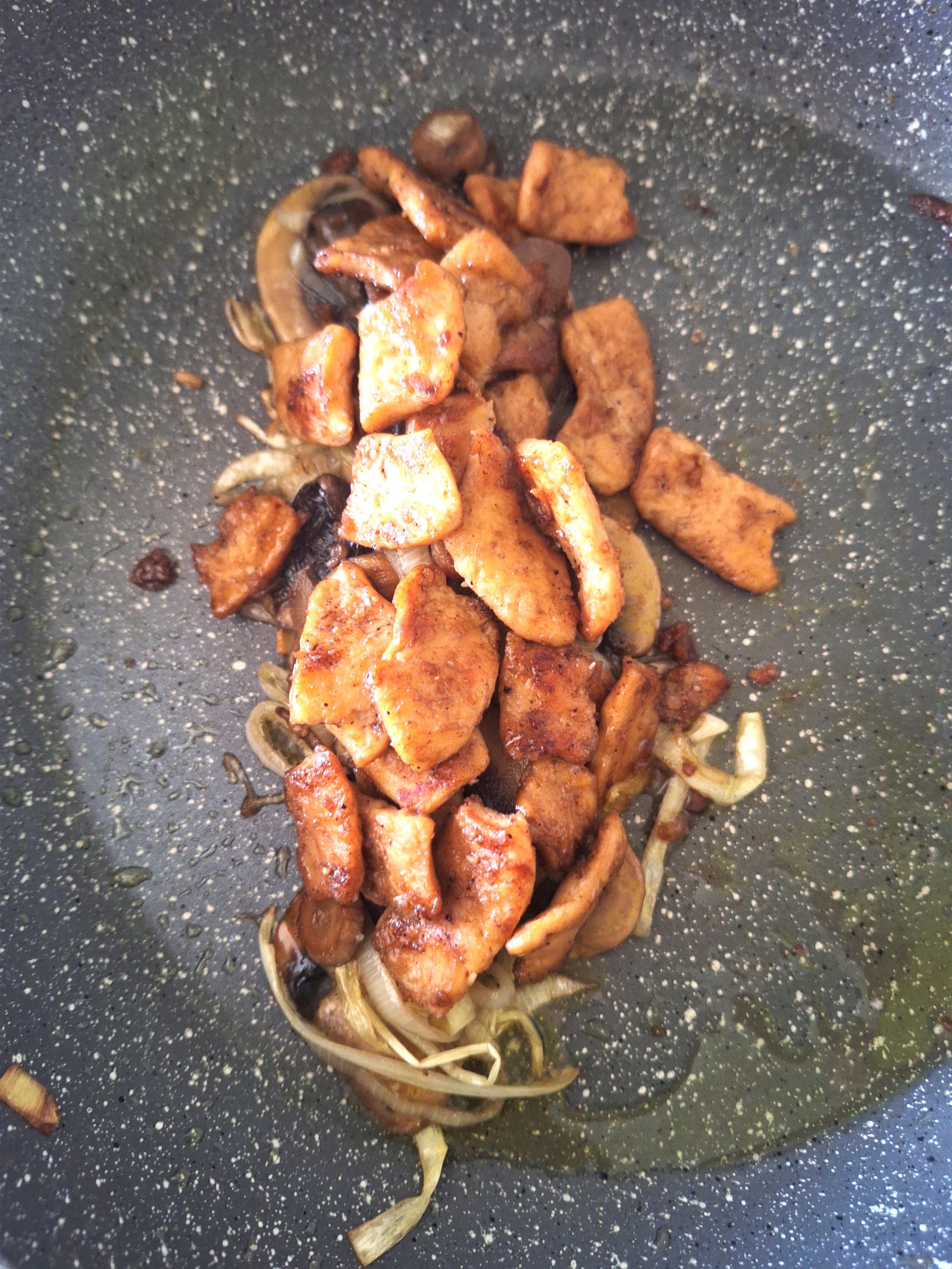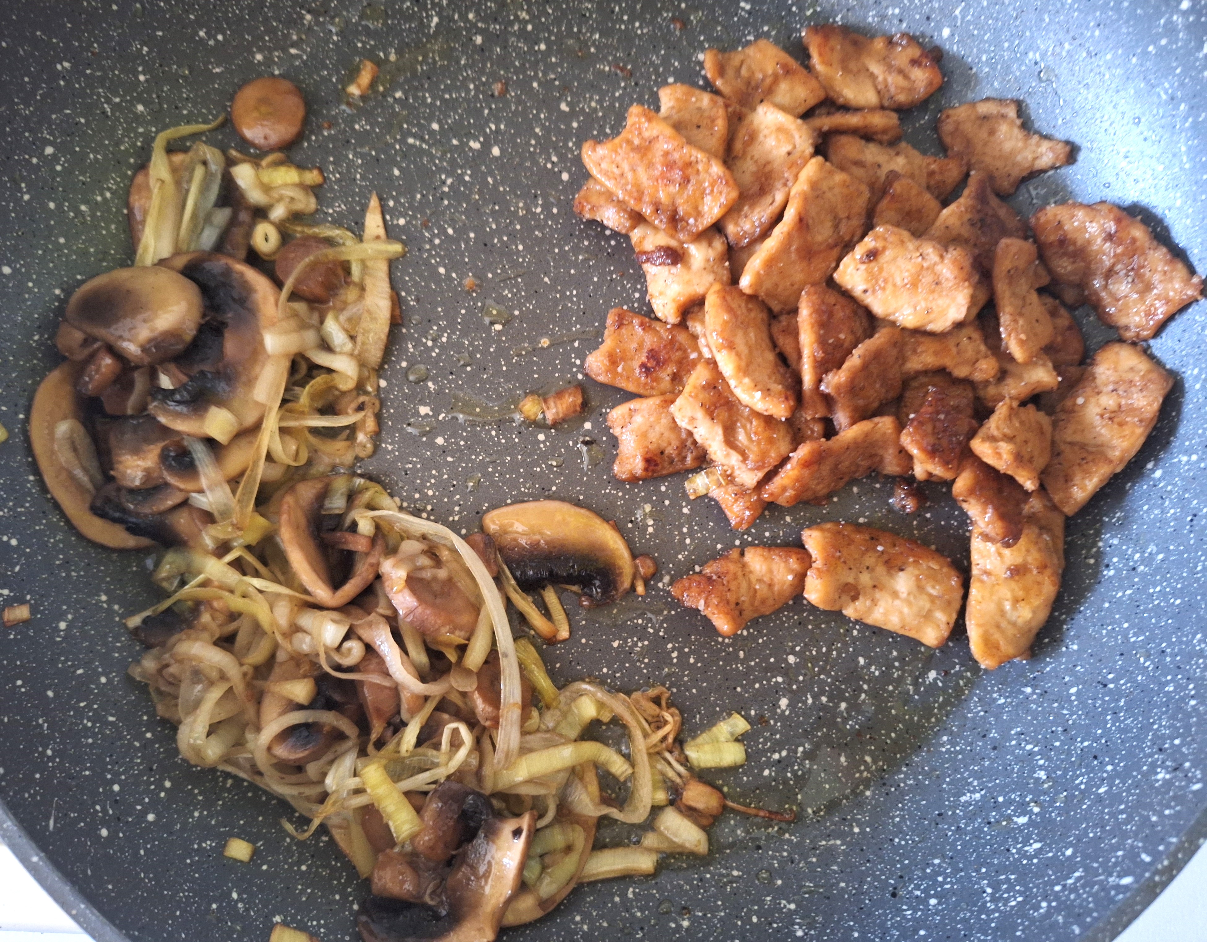 Hidrata la proteína de haba en agua hirviendo durante unos 5 minutos. Escurre, aliña con pimienta negra y sal y dora en un poquito de aceite (puedes añadirle un poco de pimentón y aminos de coco si quieres para darle un poquito más de sabor).